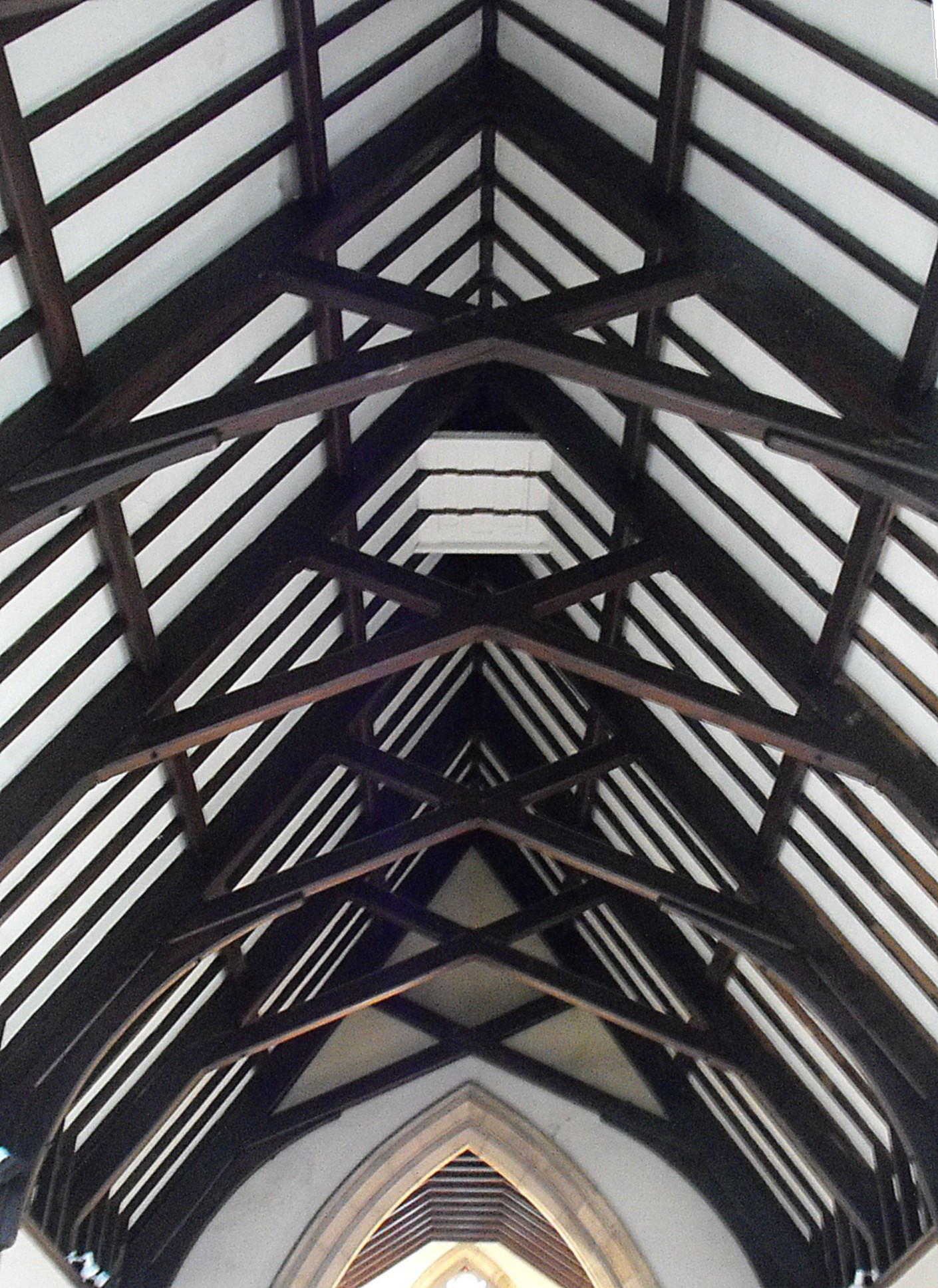 Inside the church, the original Victorian benches have been replaced by 'mouseman' furniture, which certainly adds value to the building, though not of an antiquarian kind. The nave is covered by another of Thomas Healey's interesting and inventive4 roofs (as illustrated above right), with purlins ⅓ and ⅔ of the way up the pitch and scissor-bracing without collar. The chancel roof has arched braced collars and scissor bracing above those. The chancel is approached from the nave up two steps, while another two rise from the chancel to the sanctuary. The chancel arch bears two sunk flat chamfers above semi-circular shafts with fillets, and there are prominent head label stops at the base of the dripstone to the west. The font consists of a cambered bowl without a stem, with deeply-cut trefoil-cusped arches on each side, rising from miniature corbels, alternately with leaf carving or carved as little heads: the spandrels are filled with encircled trefoils. |