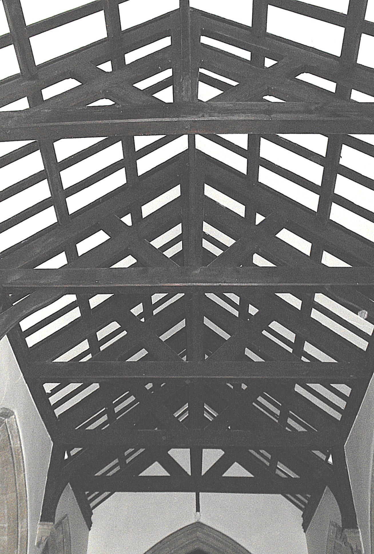 This is all quite attractive and nor is the interior of the church without some grandeur, due in part to its size and expansive plan. The double-flat-chamfered tower arch and arches from the aisles to the chapels date from the restoration while the semi-circular arrangement of steps between the nave and chancel is quite obviously modern. The N. chapel now serves as a vestry and organ chamber. The nave roof (seen below), comprised of three double-bays, may or may not reflect the form of its mediaeval predecessor but the 30º angle of pitch is lower than usual for Healey and the structural overkill and extravagant use of timber is particularly striking, with tie beams supporting both king posts and 'V'-struts and the heavy principal rafters doubled a few inches beneath by parallel timbers of identical section. The chancel roof is ceiled and painted but still has arched braces supporting collars with king posts and three pairs of queen posts of very narrow scantling rising rather incongruously above.