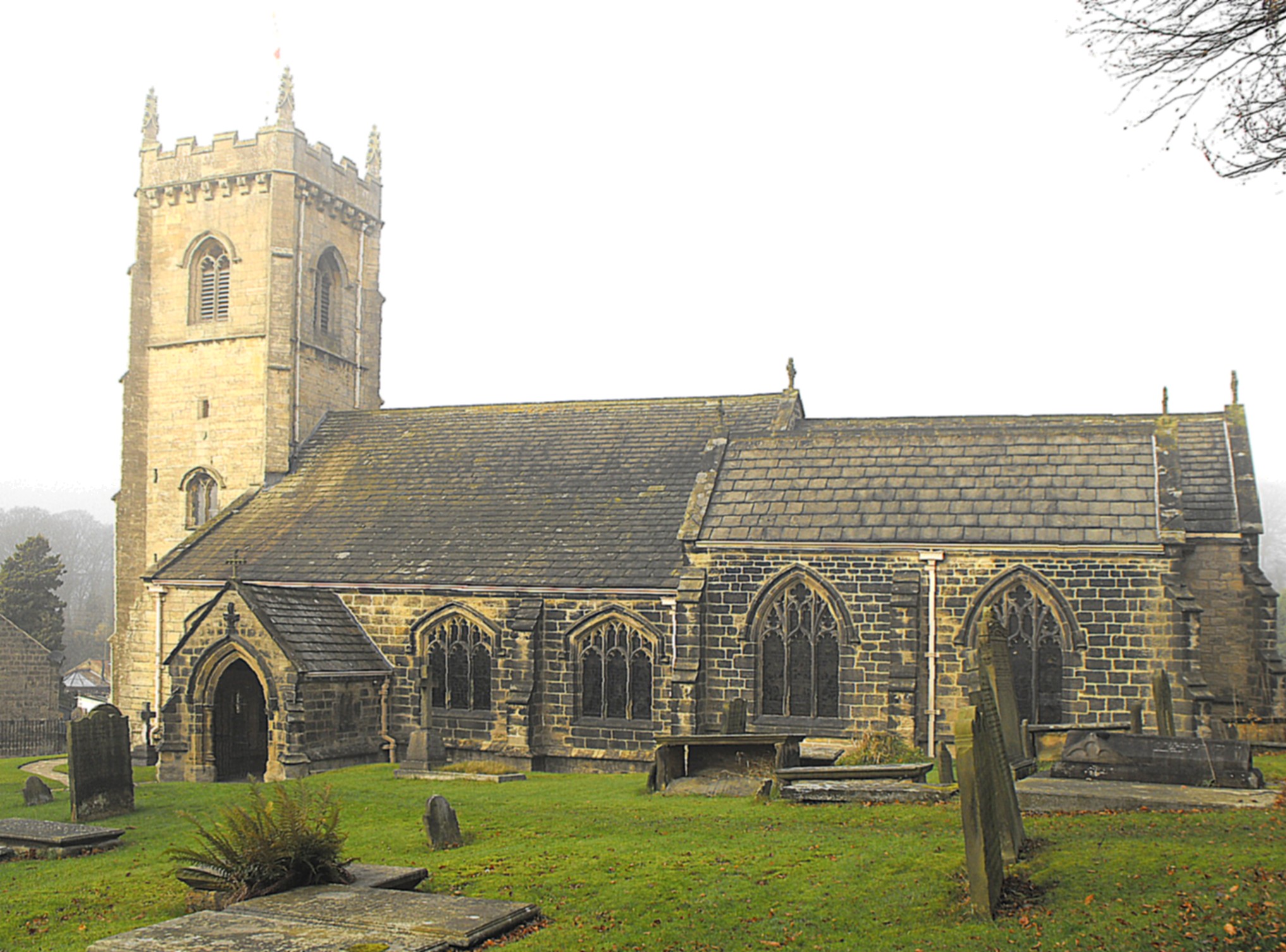 This was probably a wholly Perpendicular church before its enlargement and partial reconstruction by Mallinson & Healey. Notes in the church say that in 1853 the tower was walled off for use as a fuel store, so restoration also entailed the removal of this wall, the renovation of the nave, and the construction of a totally new chancel with adjoining chapels. The total cost was £1,850.