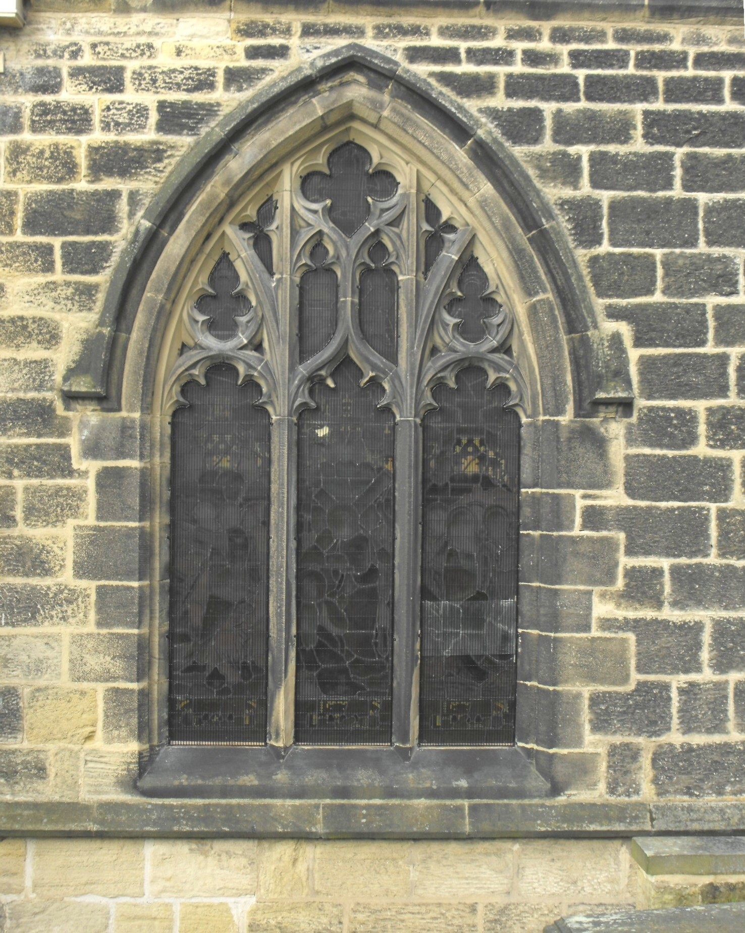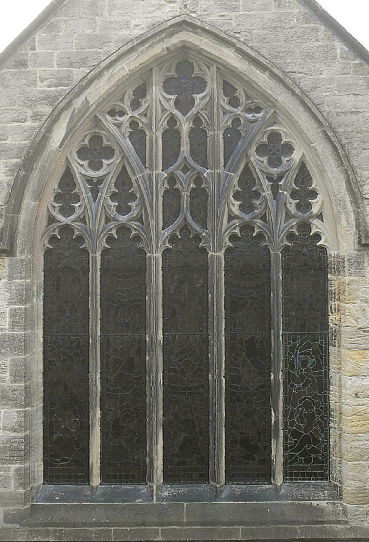 The chapels are slightly shorter than the chancel and independently-gabled. Most of the window tracery was replaced in the lean-to nave aisles, and some of the masonry re-cut in the three-bay nave arcades, which are composed of double-flat-chamfered arches springing from octagonal piers with shallowly-projecting castellated capitals - the form Healey copied for his wide chancel arch and two-bay chapel arcades. Indeed, it is Healey's apparent faithfulness to such limited earlier work as he was able to retain, that makes the distinction between the mediaeval and Victorian so difficult to discern and suggests that had he been engaged on more church restorations and less new builds, he might have been an unusually sensitive conservator for his day. Windows are all in Third-Pointed or Perpendicular style: chapel windows are two-centred with strong mullions, outer lights subarcuated above daggers, and central lights surmounted by pairs of subreticulation units with quatrefoils above (as illustrated in the photograph above left); nave aisle windows are segmental-pointed and have supermullioned tracery. The excellent five-light chancel E. window (above right) has a central light separated by strong mullions and topped by two tiers of trefoil-cusped archlets and a quatrefoil, and outer lights subarcuated in pairs above Y-tracery filled with a pair of daggers and an encircled quatrefoil, but the effect is diminished by the rising ground to the east which has necessitated the digging of a ditch immediately behind to keep out the damp. The W. tower is diagonally buttressed and rises in two stages to bell-openings with straightened reticulation units in their heads, battlements, and crocketed corner pinnacles. The position of the stair in the southwest angle is betrayed by a door at the foot and a line of slit openings rising above. The S. porch outer doorway comprises two orders bearing double-wave mouldings and is encompassed by a hood-mould terminating in king and queen label stops,
