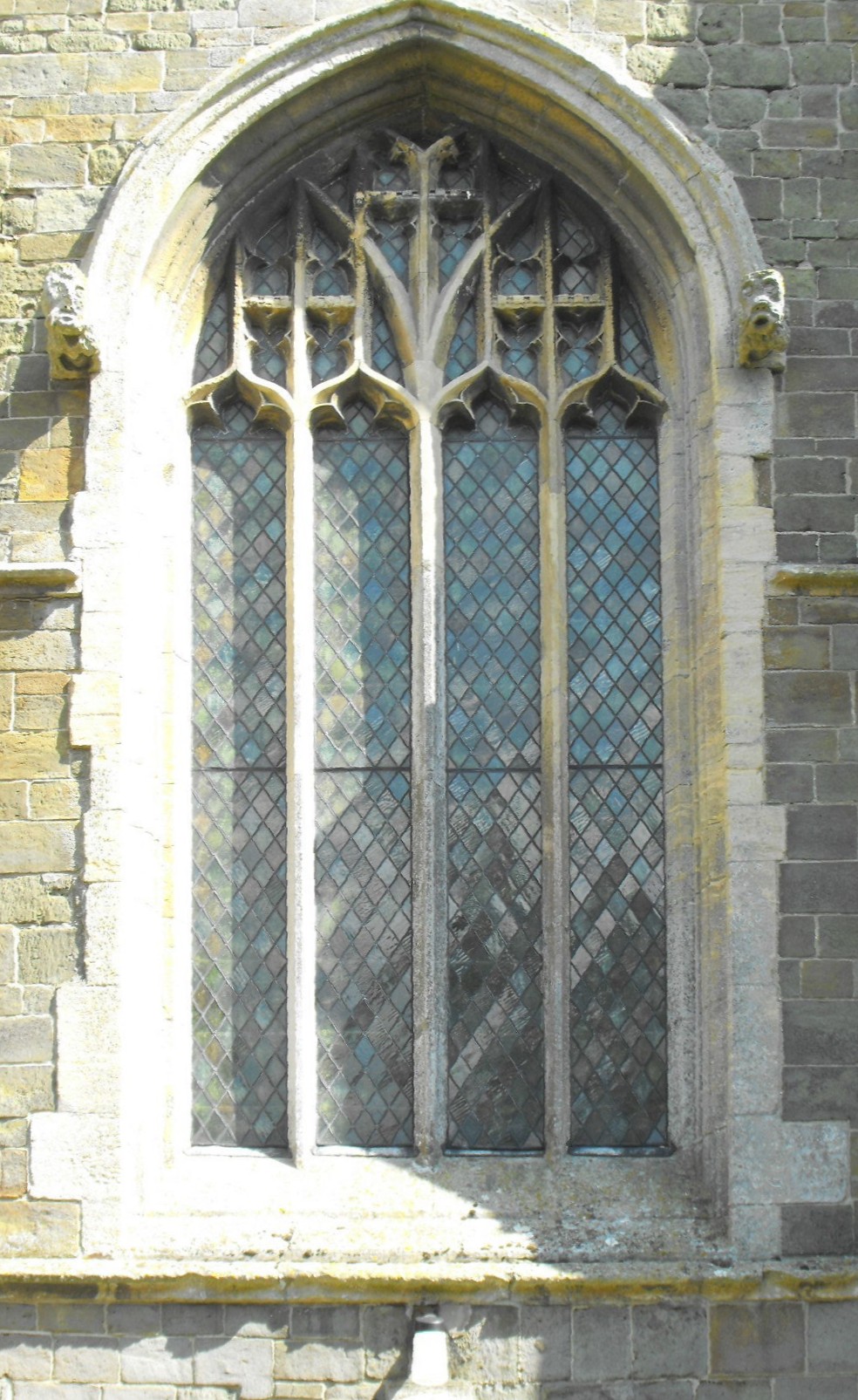 The stately tower now rises in four short stages, supported by angle buttresses, to battlements and crocketed pinnacles at the corners and wall mid-points that are all apparently by Fowler. The W. doorway carries a wave and a hollow, and above this, the four-light W. window (shown in the photograph above right) rises through two stages, with lights subarcuated in pairs, stepped castellated supertransoms above lights 1b-2a and 3b-4a, and a hood-mould springing from huge, grotesque label stops. The two-light supermullioned bell-openings are probably by Fowler, but whether he was responsible for removing any sign of a former arch to the nave in the now partly-external E. wall of the tower, seems doubtful judging by the worn state of the masonry here, suggesting this may have been done in the seventeenth century rebuilding.