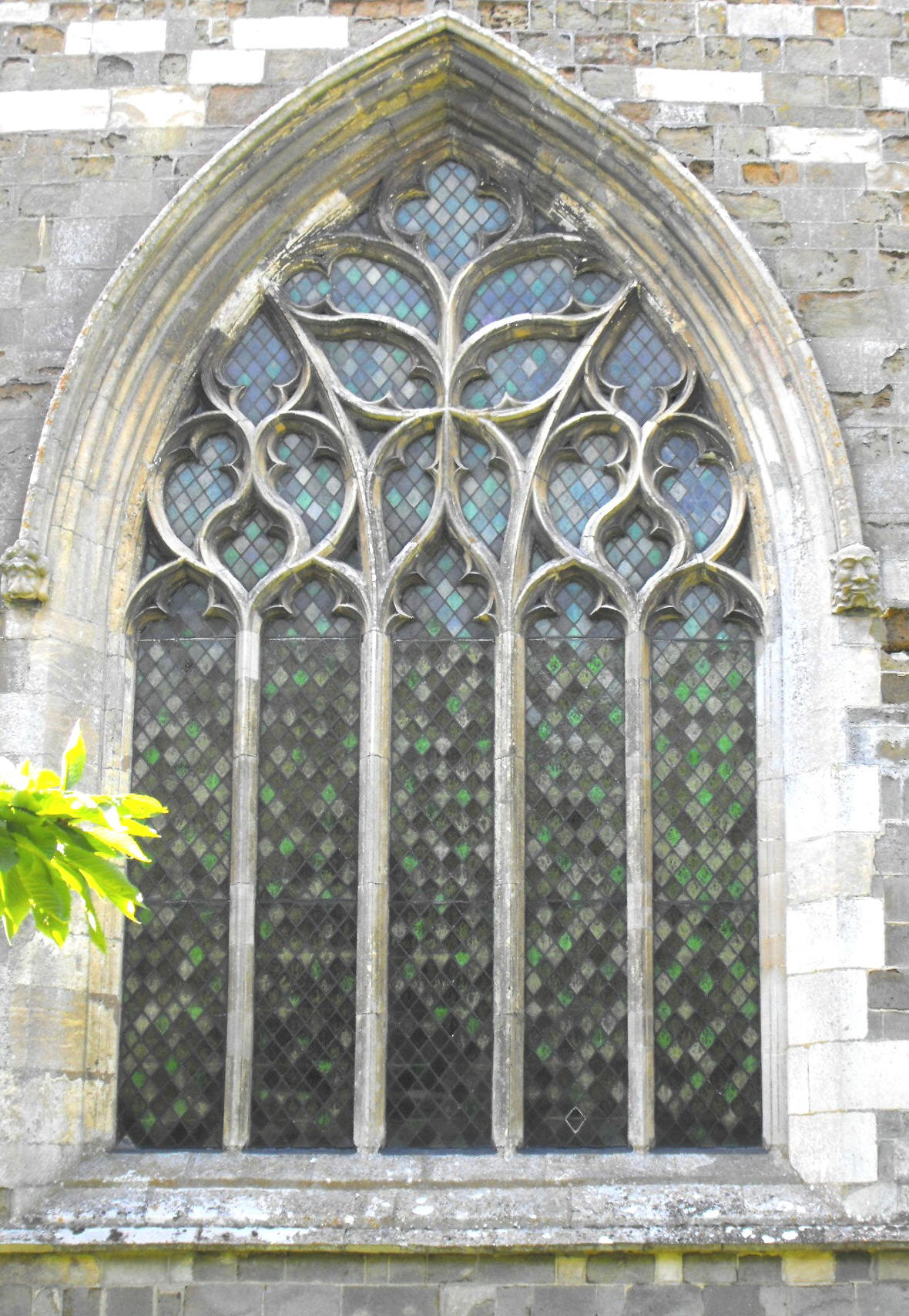So much for the brief history of the building. The church today thus consists essentially of a nave and chancel in one (set out as three bays for the nave and one for the chancel) in what was formerly John of Gaunt’s S. aisle. The style is still Decorated, with windows with flowing tracery throughout (three-light to the south, four-light to the west, and five-light to the east), although John of Gaunt did not come into possession of the manor until 1363. Unfortunately, these windows have all been restored but their forms seem likely to be original and the E. window at least (shown above left) appears to preserve some old masonry. The S. doorway (inside the now wholly Victorian porch) bears a series of hollows and rolls above responds with an order of attached circular shafts with a fillet and leaf capitals, while the hood-mould above is supported on king and queen label stops. Inside the building, the tall four-bay arcade (once the S. arcade but now the N. arcade) consists of arches formed of four major and four minor semi-circular shafts with fillets, and these mouldings continue round the arches without intervening capitals. (See the photograph at the foot of the page, taken from the southwest.) The sedilia and piscina in the S. wall of the present chancel bay, seem to have been part of the original work and consist, in the former case, of three equal bays with keeled shafts between, rising to crocketed pinnacles at the sides and ogee canopies above the bays, with leaf finials on top. There is a shallow niche either side of the E. window.