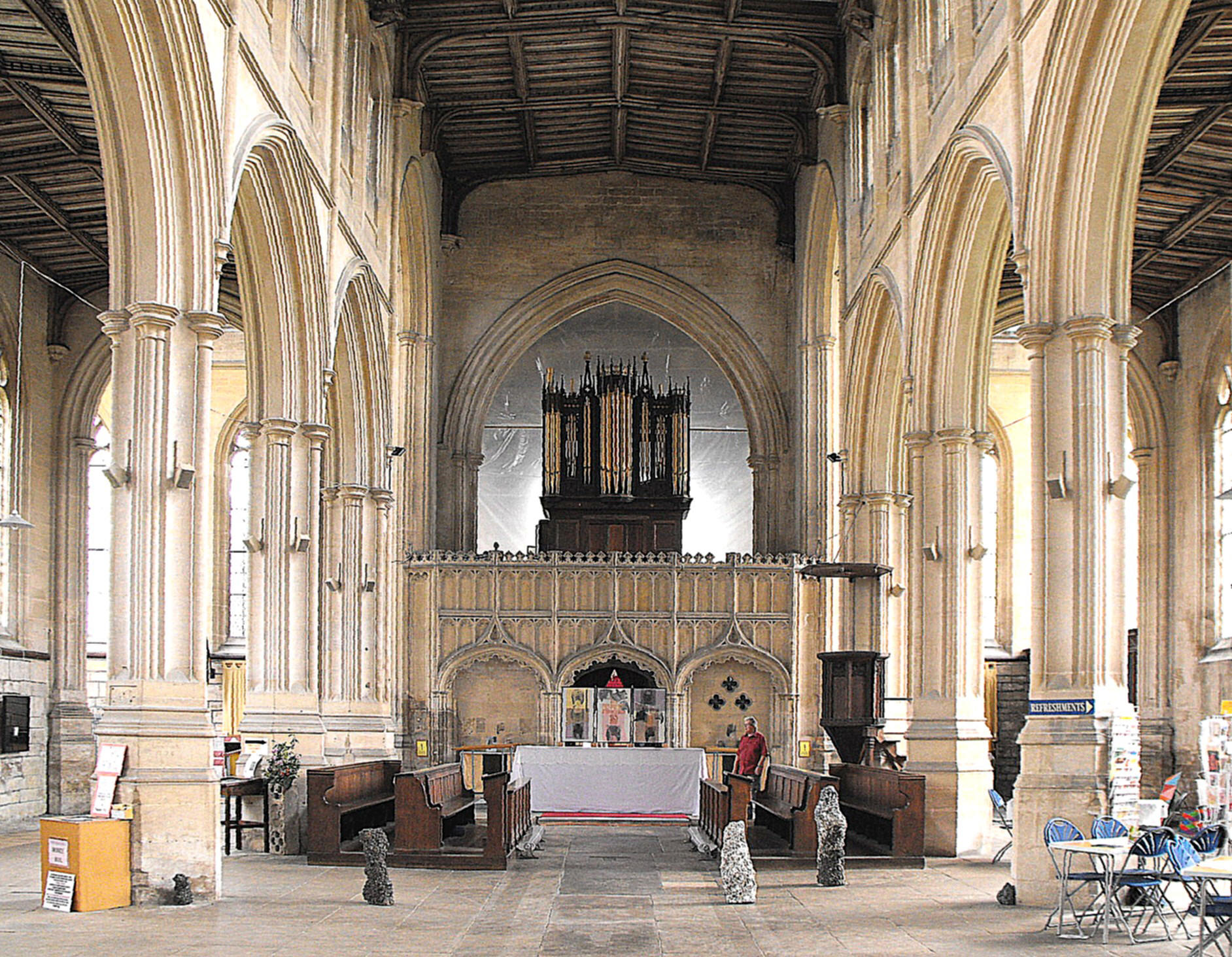Neither the precise year when work on the new church began, nor the master mason responsible, appear to be known, but was still unfinished around 1480 when John Cowper (fl. 1453-84) took charge (John Harvey, English Mediaeval Architects, Gloucester, Alan Sutton, 1984, pp. 73-74), though whether anything more then remained to be done beyond the completion of the tower, seems impossible to tell. The funds available for the project were obviously considerable throughout its duration, yet when building on a scale like this, it was almost inevitable that something would have to give and, in Pevsner’s apt phrase, the result was a church clearly intended for 'a man who wanted size rather than pretty decoration'. This is shown especially in the absence of cusping in all the window traceries, which gives the building a more Tudor appearance than might be expected at this date. The rather stark quality this gives the church would then been lessened when it was finished, by the stained glass in all the windows, though that would also have made the interior very dark. However, the stained glass was surreptitiously removed by the vicar in 1754 for this very reason and replaced by clear glass, thus transforming the aisled nave in particular, into the great open hall it appears today, an impression heightened at the time of this visit by its doubtless worthy and sensible, yet also rather indecorous use as a venue for a café and a sprawling white elephant stall, accompanied by an unfortunate choice of canned music.