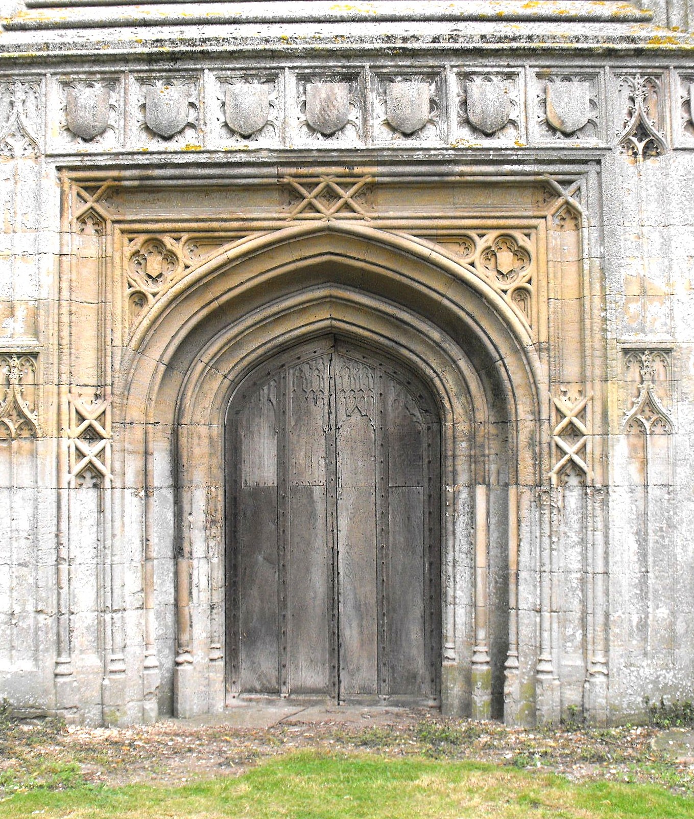The tower has angle-buttresses which reduce above the parapet to tall crocketed pinnacles at the corners. The bell-openings are three-light and four-centred, with a little supermullioned tracery above the springing. The W. window in the second stage is separated from the doorway beneath by a row of shields set in squares, and is five-light and transomed with outer lights subarcuated above daggers, two tiers of subreticulation units separated by latticed supertransoms above lights 2 & 4, and a castellated supertransom higher up in the central light. The elaborate W. doorway (shown above right), composed of two orders bearing deep hollow chamfers between rolls, separated by an even deeper hollow, is set inside a traceried rectangular surround, to either side of which a blank ogee arch terminates in a crocketed finial. The N. porch has little square-headed two-light windows at the sides, very Tudor in appearance, diagonal buttresses ending in crocketed pinnacles, a wave, hollow and roll around the outer doorway, traceried spandrels above, and a niche at the apex.
