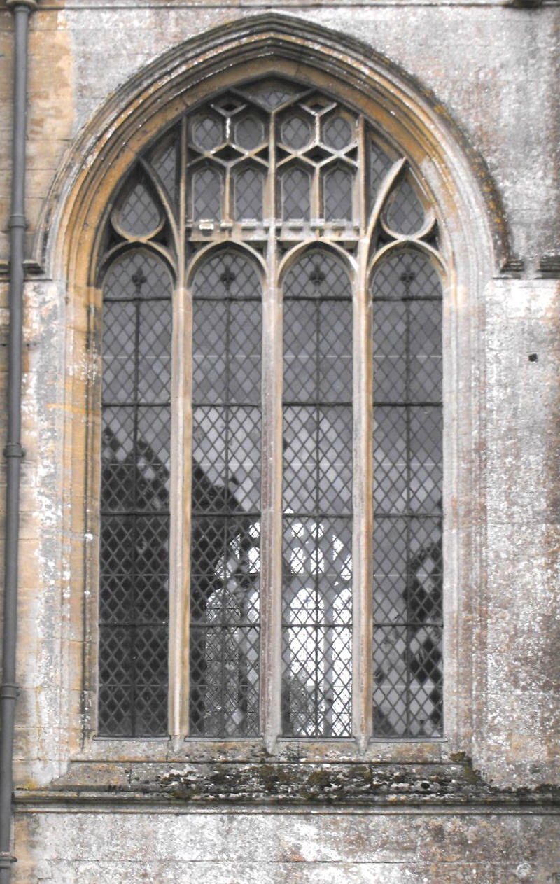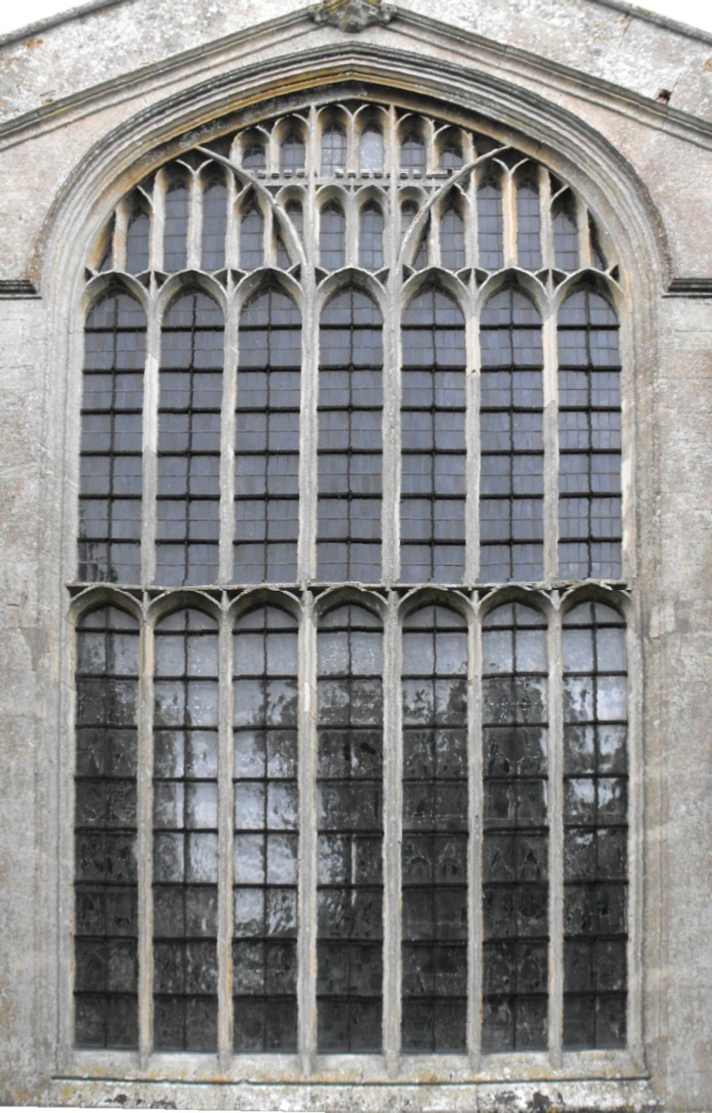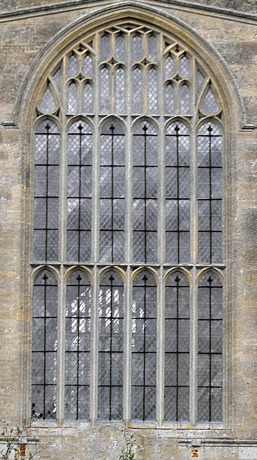 An exterior description of the building follows. The church is tall in all parts and consists of a W. tower rising in four stages, a three-bay aisled nave with aisles encompassing the tower (i.e. the aisles themselves are four bays long), exceptionally high transepts two bays in depth, and a long five-bay chancel, with all bays separated externally by buttresses. There is a surprisingly modest N. porch adjoining the central bay of the N. aisle, and there was once a similar S. porch opposite. The entire building is surmounted by unbroken parapets. The aisle windows are four-light and two-centred (see the N. aisle window, illustrated above left), with outer lights subarcuated above daggers and inner lights supporting a castellated supertransom above which two tiers of subreticulation units are separated by a latticed supertransom described in triangles instead of arcs, which is another simplification characteristic of the building’s design. The nave clerestory is formed of two, three-light four-centred windows per bay, with just a little supermullioned tracery above the springing, and these windows continue along the upper part of the west and east walls of the gargantuan transepts, which are fully as high as the nave, while the west and east windows below (of which there is one in the first case and two in the second beside the aisleless chancel) copy the aisle windows. However, the N. and S. windows to the transepts are huge and take up most of their respective walls. (See the S. transept S. window, above right.) Formed of six lights tied by a transom, lights 1 & 6 are subarcuated above daggers and the remaining lights display two tiers of reticulation units separated by stepped latticed supertransoms. The S. transept S. window has a doorway beneath.
