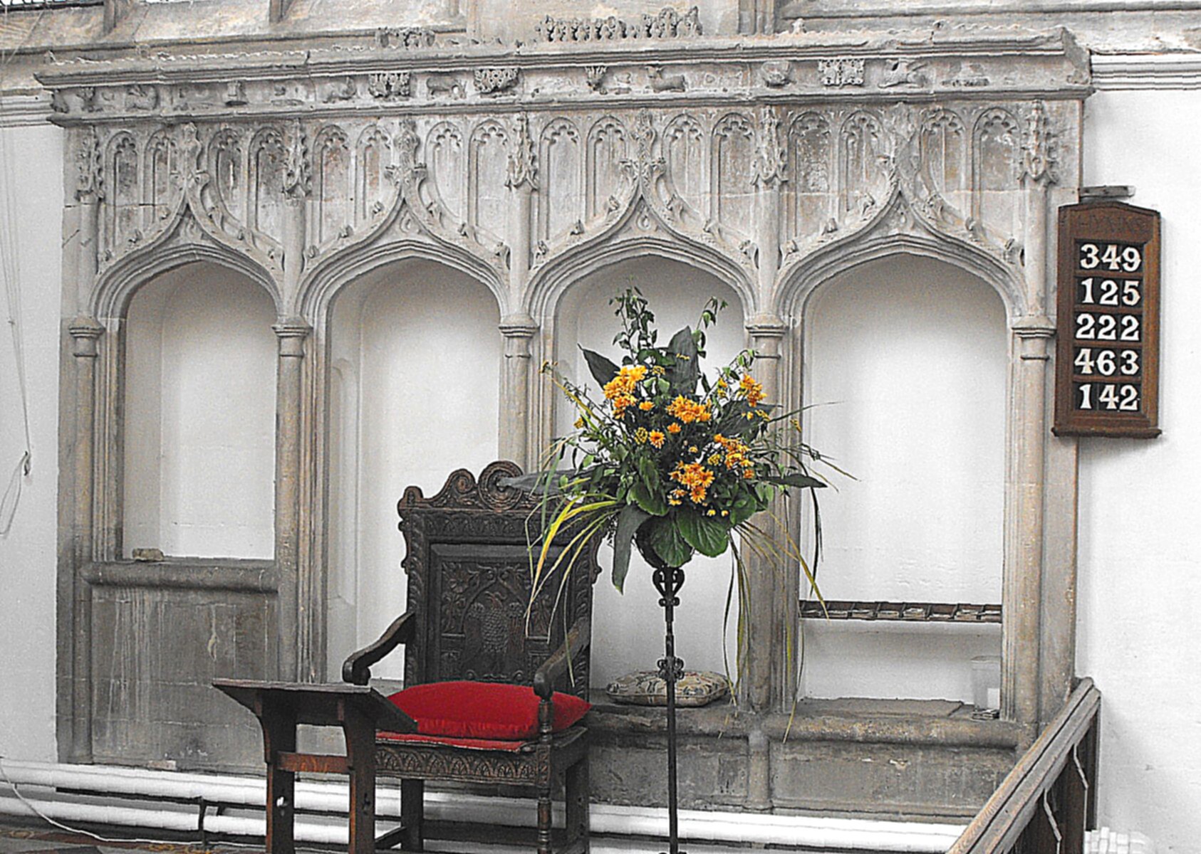 The sedilia and piscina in the chancel S. wall (illustrated at the foot of the page) consists essentially of four equal, four-centred, ogee-pointed bays, albeit with the sill in the piscina obviously set higher. There are shafts between the bays, a complex series of mouldings around the arches, blank arcading in the spandrels. and a frieze of carved beasts topped by brattishing (now largely broken off) above.