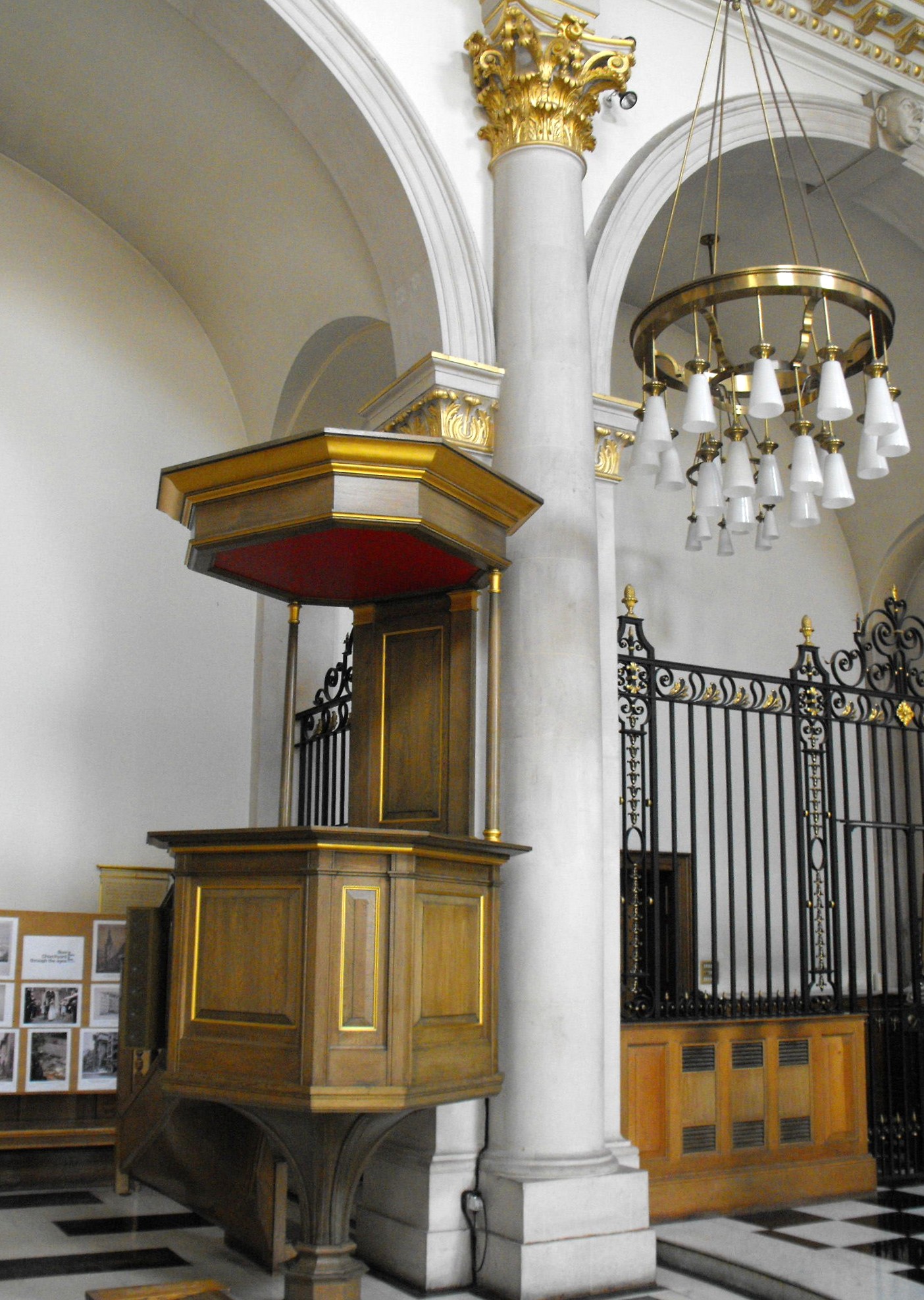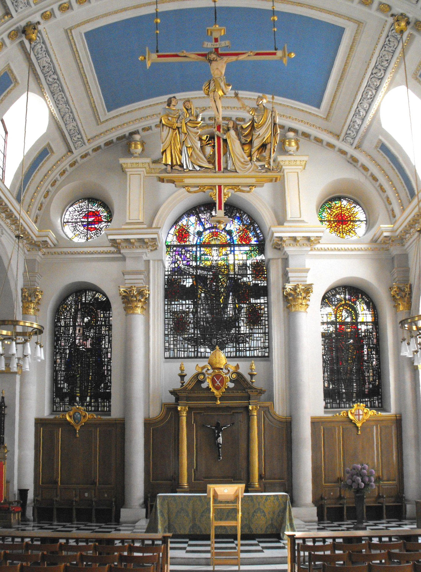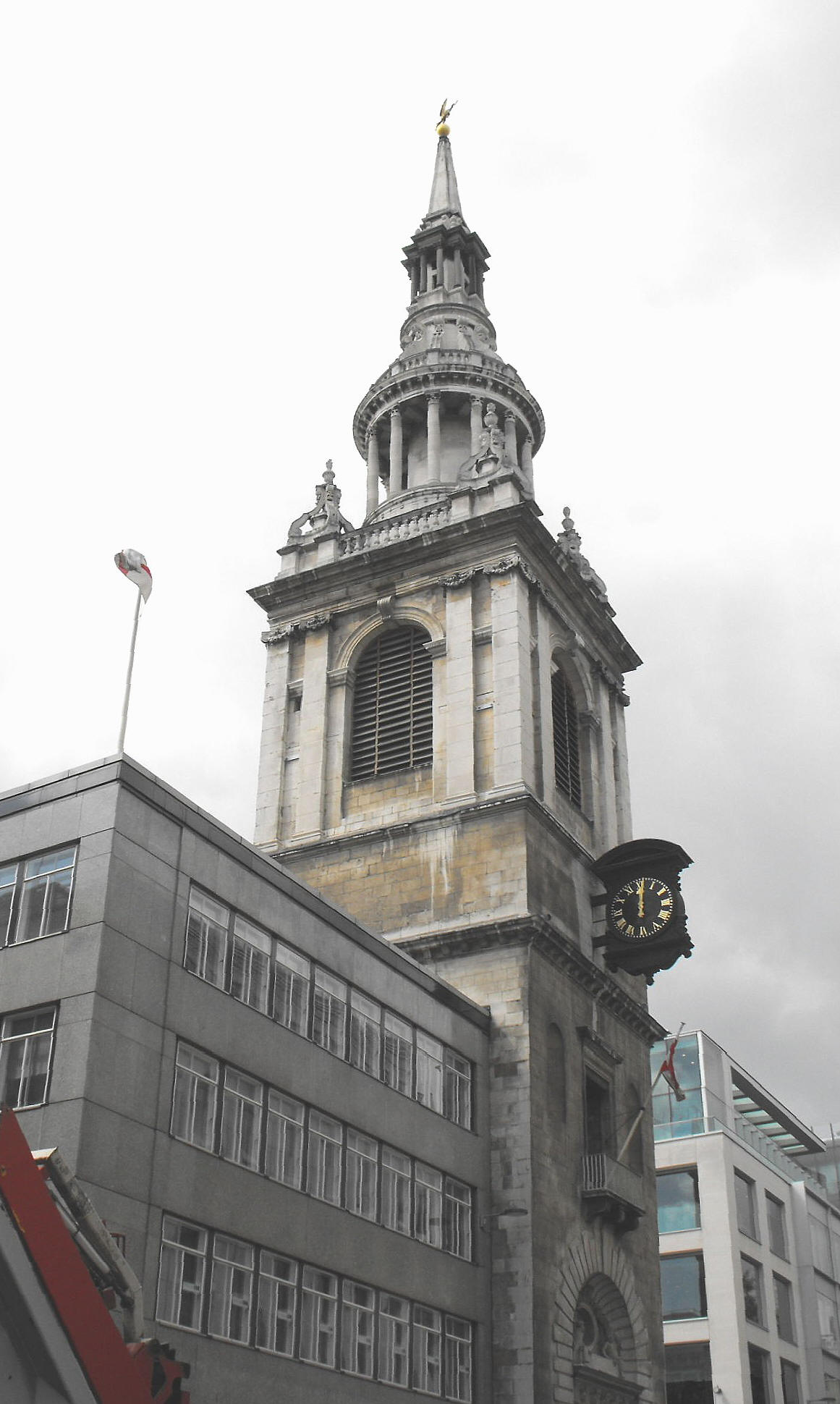 This is another City of London church designed by Sir Christopher Wren (1632 - 1723), built, like St. Bride's, Fleet Street, over the ruins of its mediaeval predecessor, the crypt of which remains. A more unfortunate parallel is that it was similarly gutted by German bombs in the Blitz, in consequence of which the interior today is the work of Laurence King (1907-81), a prolific post-war church architect, whose plans here were executed 1956-64 and reputedly based closely on Wren's original arrangements, although this is difficult to verify. The cost of the seventeenth century building according to Gerald Cobb (London City Churches, Batsford, 1977, p. 35), came to the astonishingly precise figure of £15,421-9s-0½d, making this 'the most expensive of Wren's churches', although St. Bride's, Fleet Street, was only about two hundred pounds less.