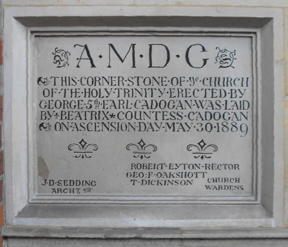Inevitably, as with many London churches, there is more to see here inside the building than out, for externally the church can only be viewed properly from Sloane Street to the west, and thus it was designed with that very much in mind. The stripy polychromatic W. façade is constructed of red brick and pale cream Bath stone from the Middle Jurassic Great Oolite formation and clearly derives its parentage from William Butterfield's magnificent Keble College Chapel, built of red, blue and white bricks in 1870 and for so many years afterwards, widely derided. That Holy Trinity seems to have escaped the selfsame indignity may have been due to the fact it so obviously accords with the late nineteenth and early twentieth century houses and flats that were springing up around it, which taken together, produce what might almost be described as an 'urban vernacular', predominantly in 'Queen Anne style' - a revived Baroque for the machine age, characterized by corner towers, broad porches, and picturesque massings. Seddon's towers seek to recall a more specific image, however, namely John Wastell's west and east fronts of King's College Chapel, Cambridge, as seen from Clare Bridge or beside Great St. Mary's in Market Hill. Here at Holy Trinity, other features to notice before entering the church include the foundation stone to the left of the doorway (shown below left), recording the names of the patron, architect, rector and churchwardens, and the tympanum above (illustrated below right), showing Christ in the centre, between Old and New Testament figures, including Moses on the immediate right, holding the stone tablets he has brought down from Mount Sinai. An angel beneath holds a shield bearing the emblem of the Holy Trinity.