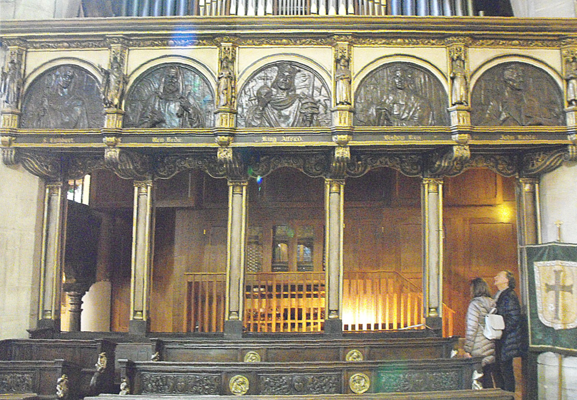 The short chancel is flanked by a S. chapel and a N. organ chamber (shown below), enclosed within elaborate wooden screens in indeterminate classical dress. The S. chapel was re-ordered and refurbished in the 1920s by Frederick Charles Eden (1864 - 1944), a former pupil of George Frederick Bodley, to create a memorial chapel to the fallen in the 1914-18 Great War. The style of the work approaches the Byzantine, as seen most especially in the form of the entrance arch to the west.