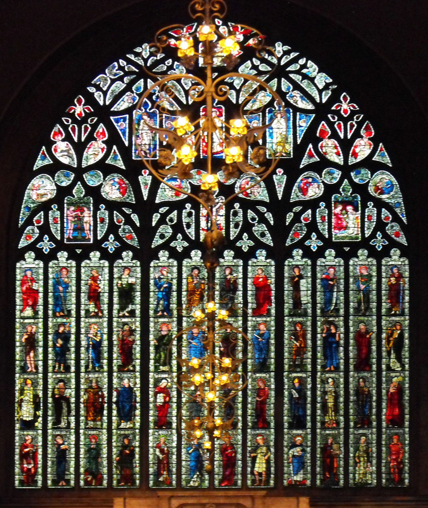 As for the rest of the church, it is only when one examines the furnishings and fittings in some detail that one really becomes aware how rich in art it is. The obvious place to begin is with the enormous twelve-light chancel E. window (illustrated at the foot of the page), filled with forty-eight panels depicting saints, forty-seven of which were drawn by Edward Burne-Jones (1833-98) and just one by William Morris (1834-96) (the saint dressed in red in the eighth position from the left along the top row). The nave aisle windows to the south and north were designed by Christopher Whall (1849 - 1924) and William Blake Richmond (1842 - 1921) respectively. They will certainly not be to everyone's taste but they do provide an instructive comparison between two contemporary artists. The most interesting individual window, perhaps, is the easternmost in the S. aisle, by Whall, who chose for his perplexing subject, the depiction of the Holy Spirit. The shapes, some of which are inevitably drawn as tongues of fire, twist in all possible directions, even breaking through the surrounding border, suggesting the inspiration for the work was taken from St. John's gospel, chapter 3, verse 8: 'The wind bloweth where it listeth, and thou hearest the sound thereof, but canst not tell whence it cometh, and whither it goeth: so is everyone that is born of the Spirit.'