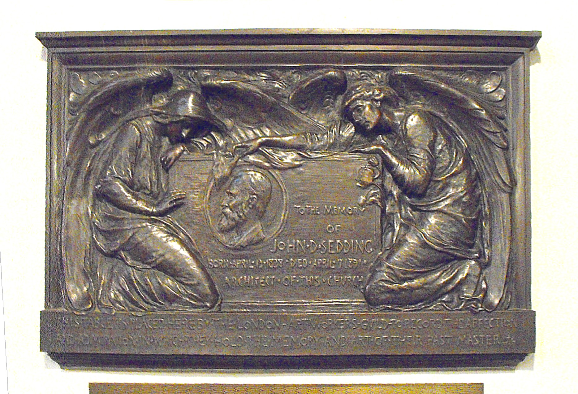 Turning next to sculpture, the most prominent piece in the church is probably the depiction of The Entombment on the reredos, which was carved by John Tweed (1869 - 1933), but this is disappointing at close range and not up to the standard of the majority of the other work, much of which is by Frederick William Pomeroy (1856 - 1924). It was he who was responsible for the figures along the canopies of the organ chamber and S. chapel screens (already mentioned and illustrated above). They comprise a series of ten Divines (five on each side) set beneath round arches, of which the least expected is surely John Keble (1792 - 1866), whose famous Assize Sermon of 1833 effectively launched the High Anglican, Oxford Movement. Also by Pomeroy is the memorial panel (below) to John Dando Sedding and his wife on the N. wall of the sanctuary.