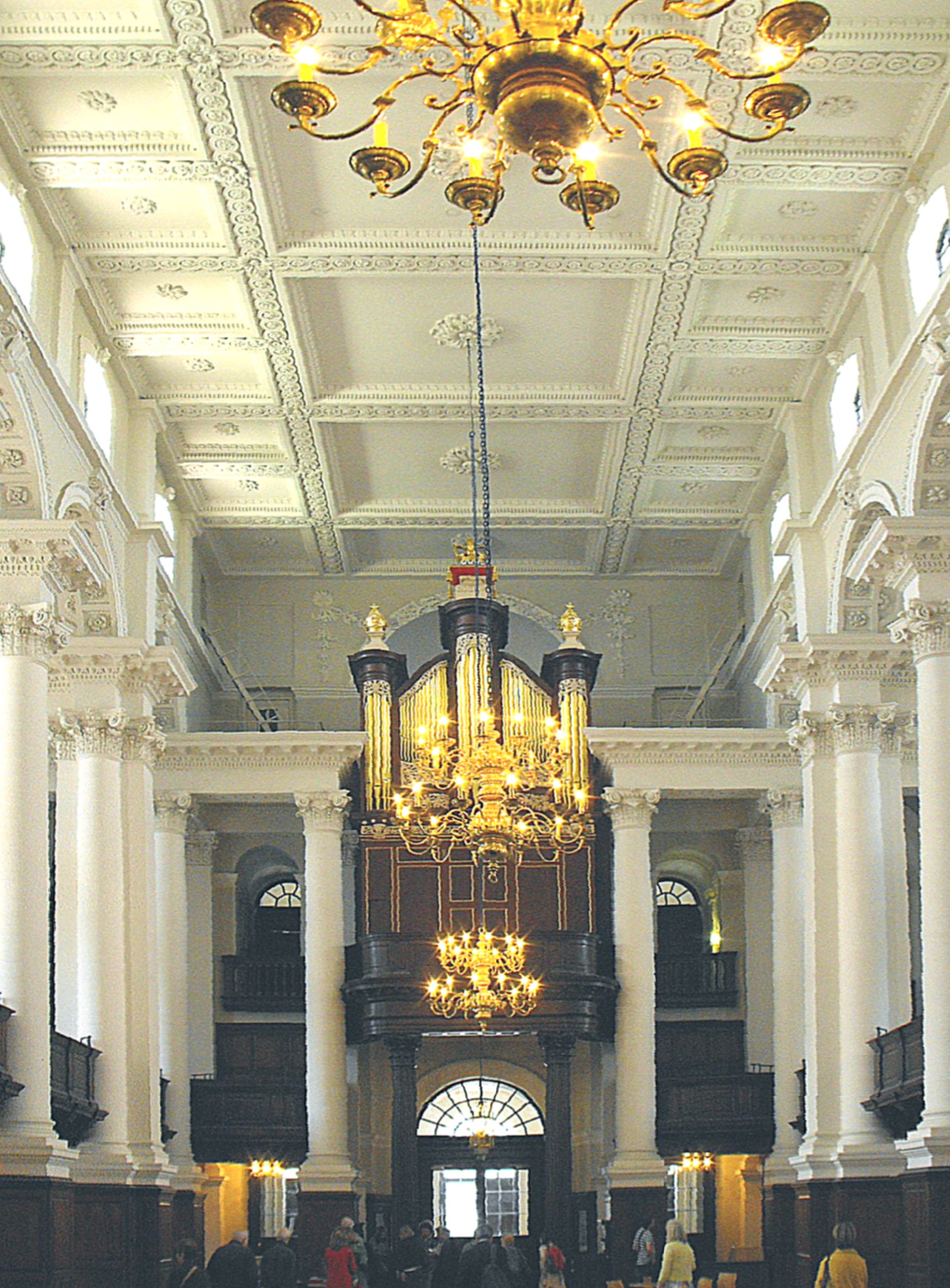 Furnishings in the church are almost all new and will not detain the visitor long. The pulpit recorded by Pevsner has gone but the two monuments, one either side of the sanctuary, remain - that on the right, commemorating Edward Peck (d. 1736), one of the Commissioners of the Fifty New Churches (anon., Christ Church, Spitalfields, London, Jarrold Publishing, 2004, p. 21), and that on the left, Sir Robert Ladbrooke (d. 1773). Peck's monument, which Pevsner dismissed in two words as 'nothing special' (ibid.), was the work of Thomas Dunn (c. 1676 - 1746), a stonemason 'much employed by Nicholas Hawksmoor' and, in Rupert Gunnis's more considered view (Dictionary of British Sculptors, 1660 - 1851, London, The Abbey Library, 1951, p. 134) 'a statuary... of considerable importance. He signs two monuments, the first to Edward Peck... at Christ Church, Spitalfields, which has a fine portrait bust; and the second to Edward Colman... at Brent Eleigh, Suffolk, which is a dramatic and important work with its life-sized reclining figure in an elaborate architectural setting'. Ladbrooke's monument, erected in 1794, is by the famous John Flaxman (1755 - 1826) and features a full-size standing effigy dressed as befitting a former Lord Mayor of London.