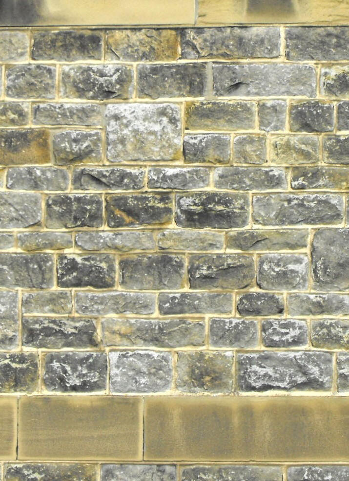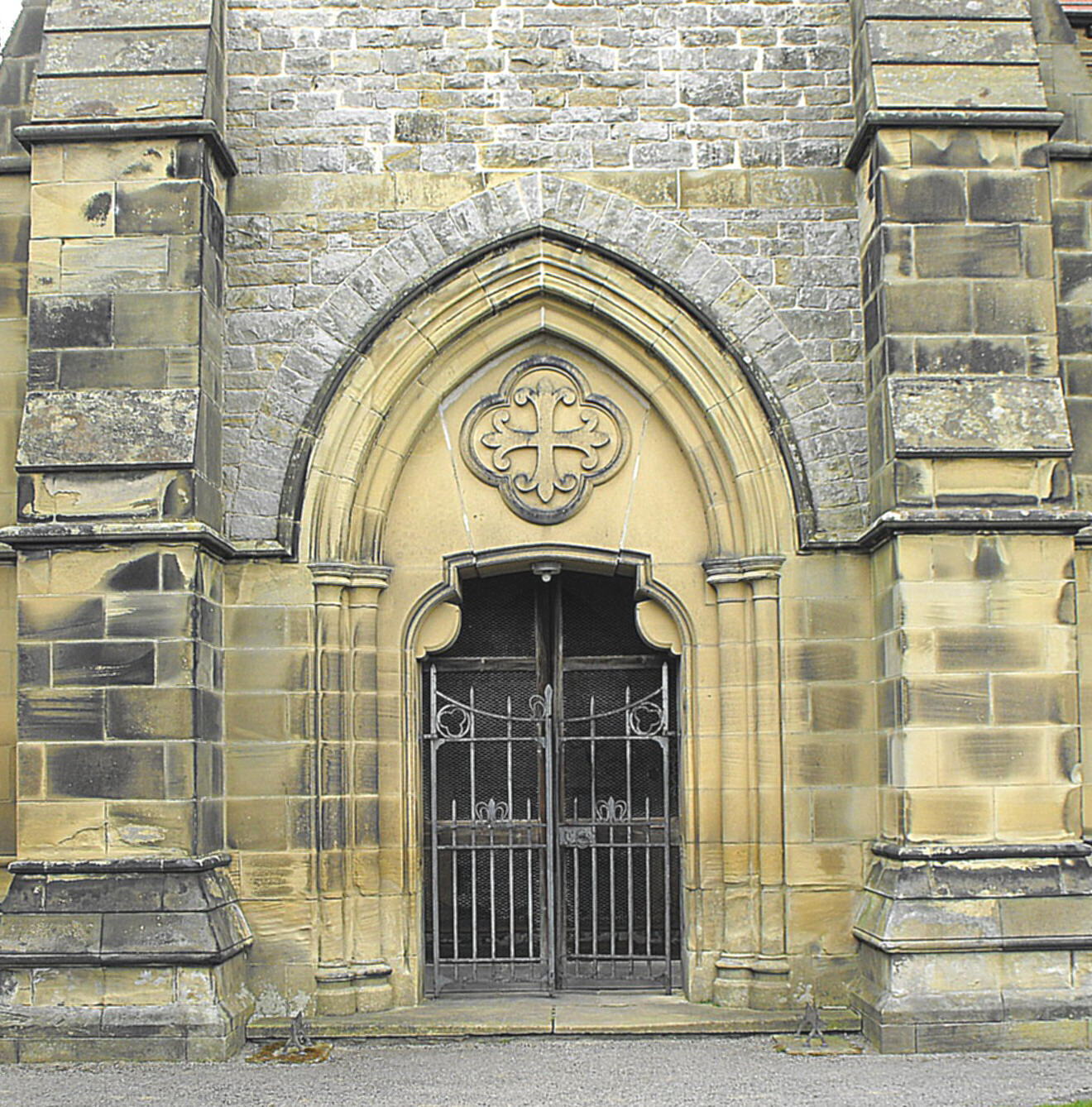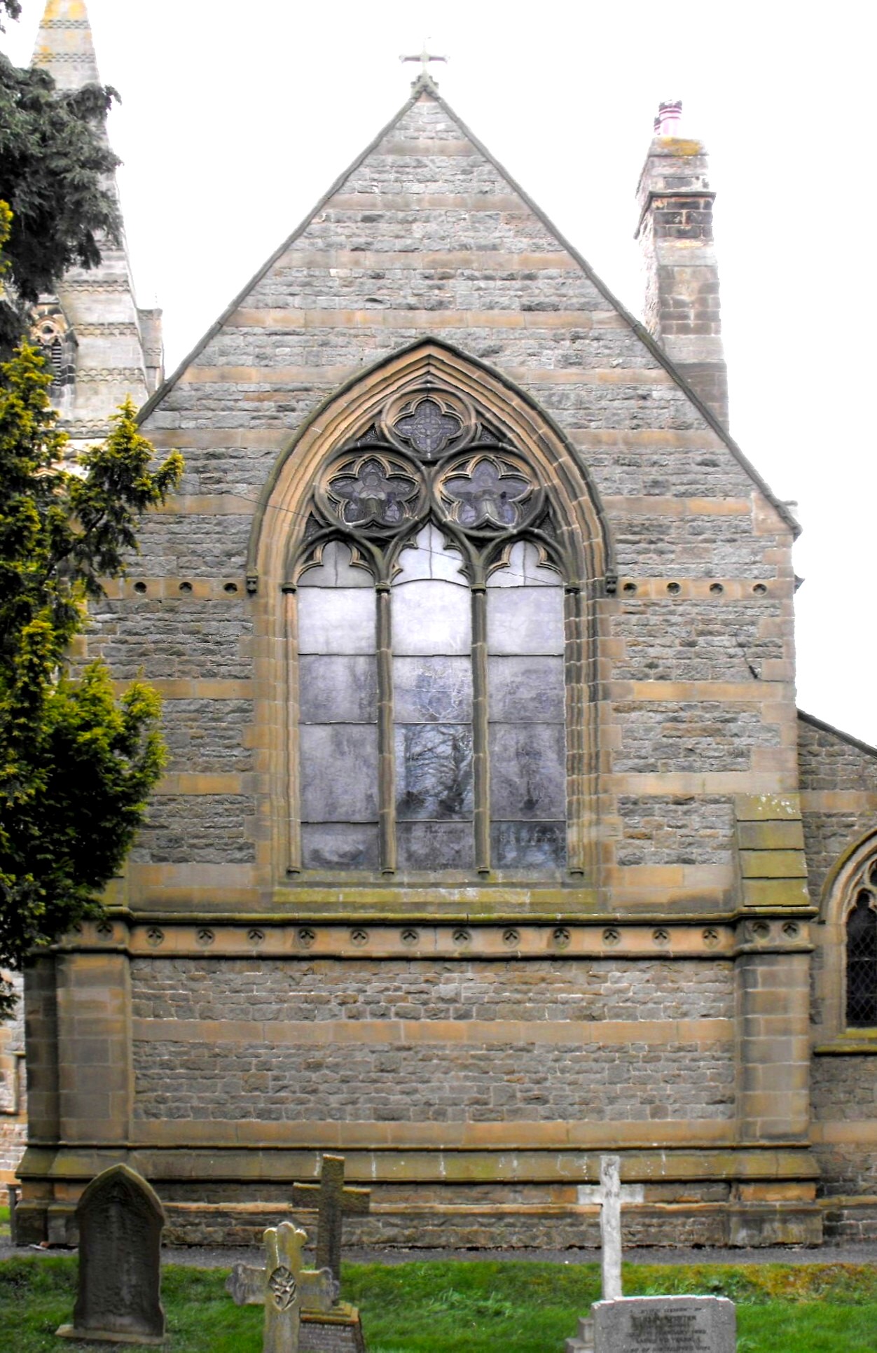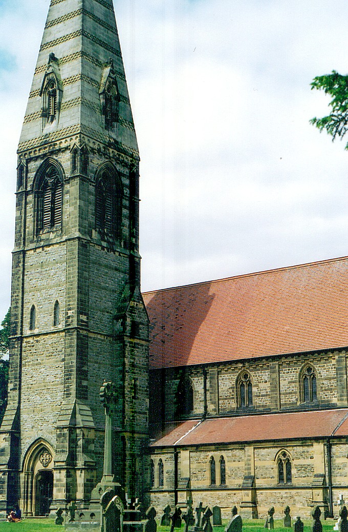 St. James’s church consists of a southwest tower and spire, a five-bay aisled nave, and a chancel with a lean-to N. organ chamber. Entry is gained through the tower (as illustrated, top right), which joins the aisle to the south. The external walls are constructed of rock-faced Bramley Fall stone from Leeds, a millstone grit from the Upper Carboniferous series, with contrasting dressed ashlar bands and red tiled roofs. (See the close-up of the chancel S. wall masonry, above right.) The impression the building creates is due chiefly to the height of the spire (160’ or 49 m.), the contrasting colours of the walls and roofs, and the restrained dignity of the fenestration. Windows adopt a variety of similar geometric forms, including: (i) in the aisles and clerestory, two-light windows with encircled quatrefoils or cinquefoils in the heads respectively; (ii) in the nave W. wall, two two-light windows with trefoils over, and a wheel window containing five trilobes and a cusped cinquefoil in the gable; and (iii) in the chancel E. wall, a three-light window with two encircled cinquefoils and an encircled quatrefoil in the head (as shown above left). The tower has very large bell-openings, and angle buttresses that change to clasping buttresses immediately above the entrance. The outer doorway has two orders of shafts beneath a tympanum featuring a carved quatrefoil enclosing a cross, and the inner doorway has a complex profile formed of rolls, sunk quadrants and flat chamfers above a single order of shafts. The passage between the two is covered by a quadripartite stone vault with red brick spandrels.