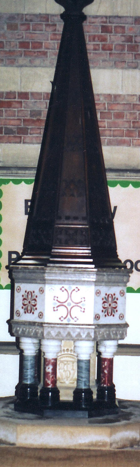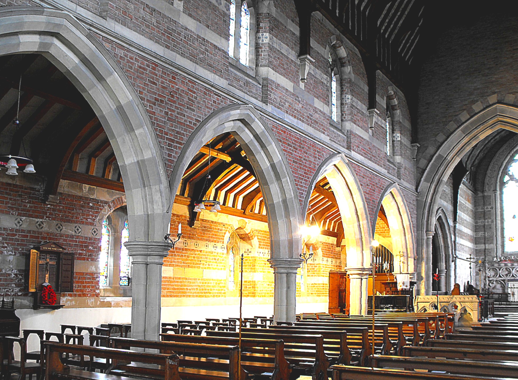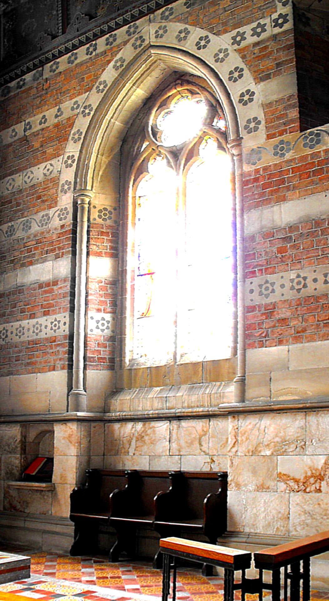 The interior of the building is splendid. The arcades are composed of double-flat-chamfered arches with voussoirs alternately of grey and white stone, supported on quatrefoil piers with fillets, and with the westernmost arches separated from the others by short wall pieces that keep the nave in step with the position of the tower. Above the arcades, the material is soft pink brick, which was more expensive than stone, with ashlar bands of white stone in the clerestory, the upper two of which have inlaid patterns in black mastic. (See the N. arcade, above left, viewed from the southeast.) The aisle walls are similar, and as the ashlar bands are necessarily lower, so they are also inevitably more prominent. Their effect is heightened further in the chancel, however, for now there are six ashlar bands, bringing them closer together, with mastic patterns in all of them but one. (The photograph above right, shows the S. wall of the sanctuary.) The walls below the window sills are faced with mottled red Derbyshire alabaster.