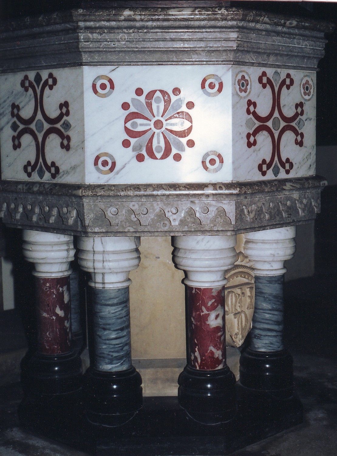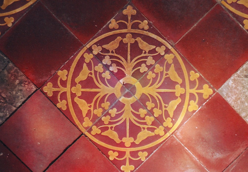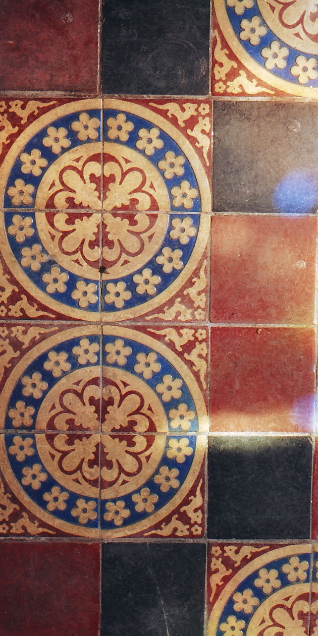 A similar build-up of effect is evident in the floor tiling patterns. The tiles themselves are encaustics, manufactured by Mintons of Stoke-on-Trent. The patterns begin in a restrained manner in the nave, but are augmented in four stages - two as one passes along the chancel (up first one step and then another), a third as the floor ascends into the sanctuary, and a fourth as the floor rises for a final time, around the base of the altar. (Patterns from the chancel floor are illustrated below.)