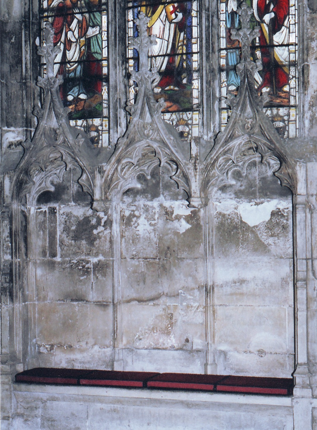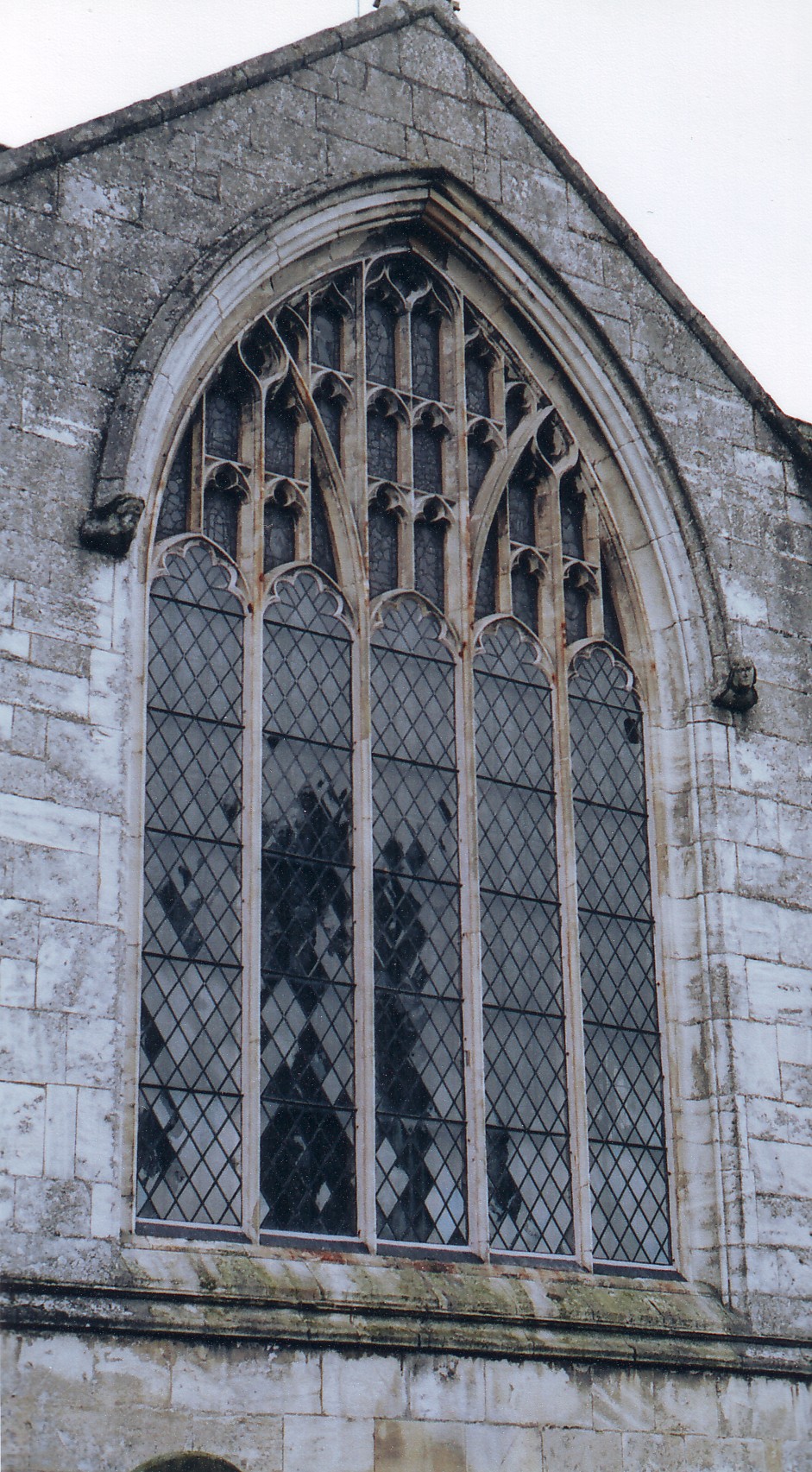 supermullioned tracery and hood-moulds terminating in large worn label stops. The