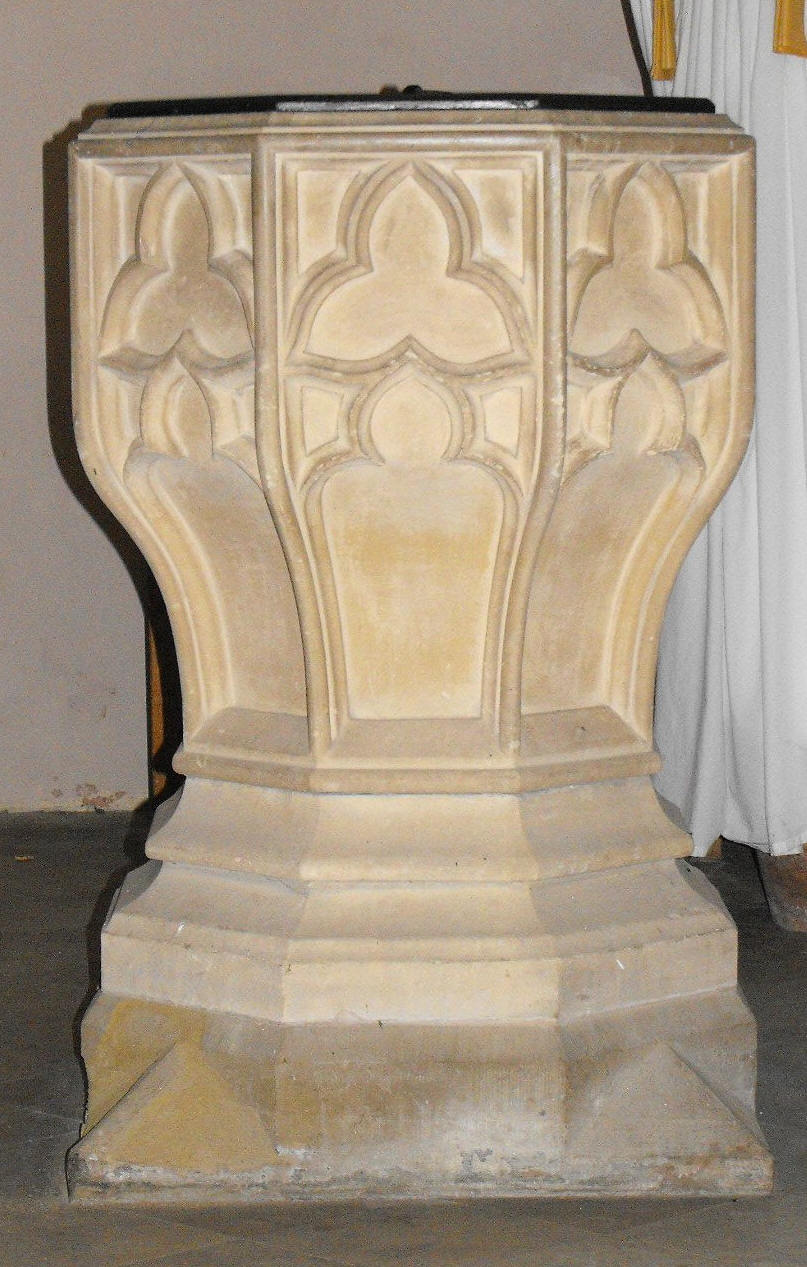 Unfortunately, the church interior appears to have undergone twentieth century refurbishment for Mallinson and Healey's day book for 1854 (West Yorkshire Archives, Calderdale Record Office, Halifax, MOO:1) makes it clear that Healey designed the majority of the original furnishings as well as a number of features pertaining to the churchyard. Thus he was at work on the churchyard gates on Monday 16th January, the altar table on Thursday 26th January, and the altar rail (which was to be made of iron) on Monday 30th. When he inspected the church on Tuesday 14th March it was 'complete except [for the] porch and pewing' but the following Monday, his assistant was actually making full-sized drawings on some unspecified hinges! Healey was engaged again for part of Saturday 13th May, on the detail of the font, which does survive. (See the photograph, left.) Such details illustrate how nineteenth century ecclesiastical architects were often involved in every aspect of their commissions, down to some of the smallest details, and demonstrates that wherever reasonable, the buildings and their furnishings together ought to be regarded as works of art, entire in themselves, not as subjects for piecemeal modifications at the latest incumbent's whim. Finally, the chancel stained glass is by Heaton, Butler and Baine. The E. window is particularly attractive and features the angel appearing to the three Marys on Easter Sunday above the text, 'He is not here: for he is risen' (Matthew 28, v. 6.).