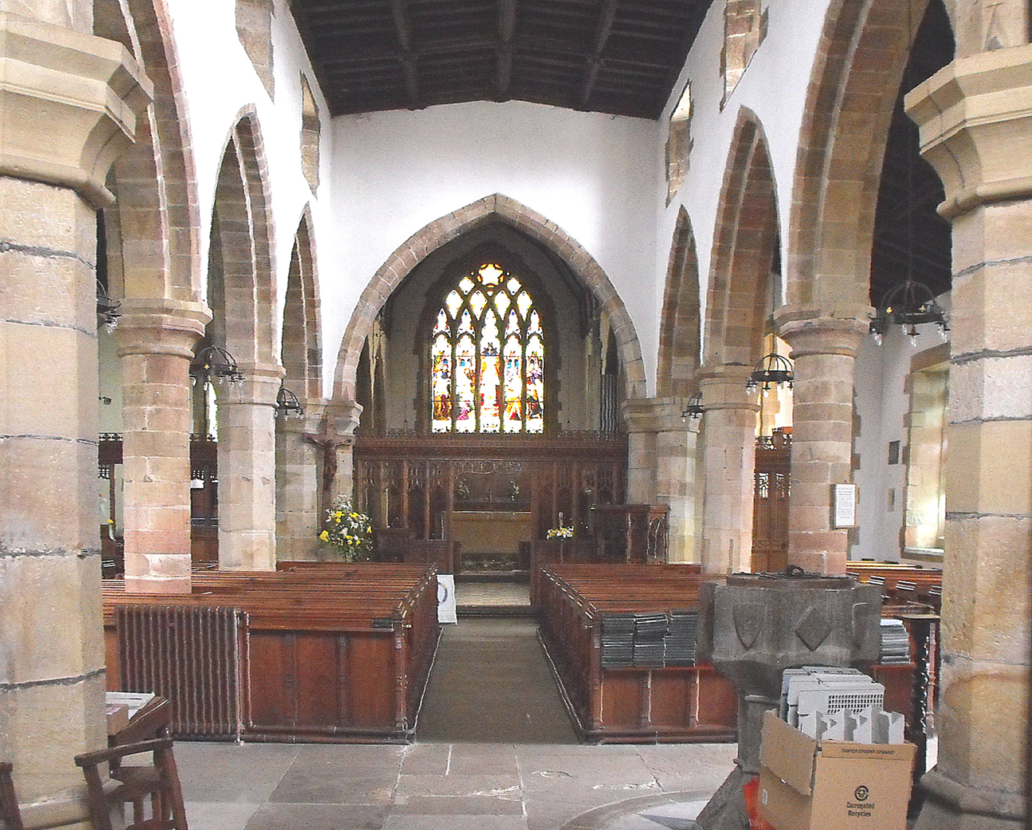 This is a large church, not least as a result of the reconstruction of the east end by Sir George Gilbert Scott in 1873-5 (Nikolaus Pevsner, The Buildings of England: Yorkshire North Riding, Harmondsworth, Penguin, 1966, p. 215), who built the present three-bay chancel and the independently-gabled chapels on either side, each as wide as the chancel, and in the case of the N. chapel, fully as long. Scott's windows are a mishmash however: the three-light S. chapel E. window has intersecting tracery in the style of 1300; the S. wall of the sanctuary is lit by a re-set Norman window and a replica Norman window alongside; and the N. and S. walls of the two chapels are pierced by two-light windows with differing geometrical tracery, separated by buttresses rising between the bays. The ungainly, stilted arcades between the chancel and chapels carry a hollow on the inner order and a flat chamfer on the outer order. The arches from the aisles to the chapels are also part of Scott's work, but the chancel arch is not.