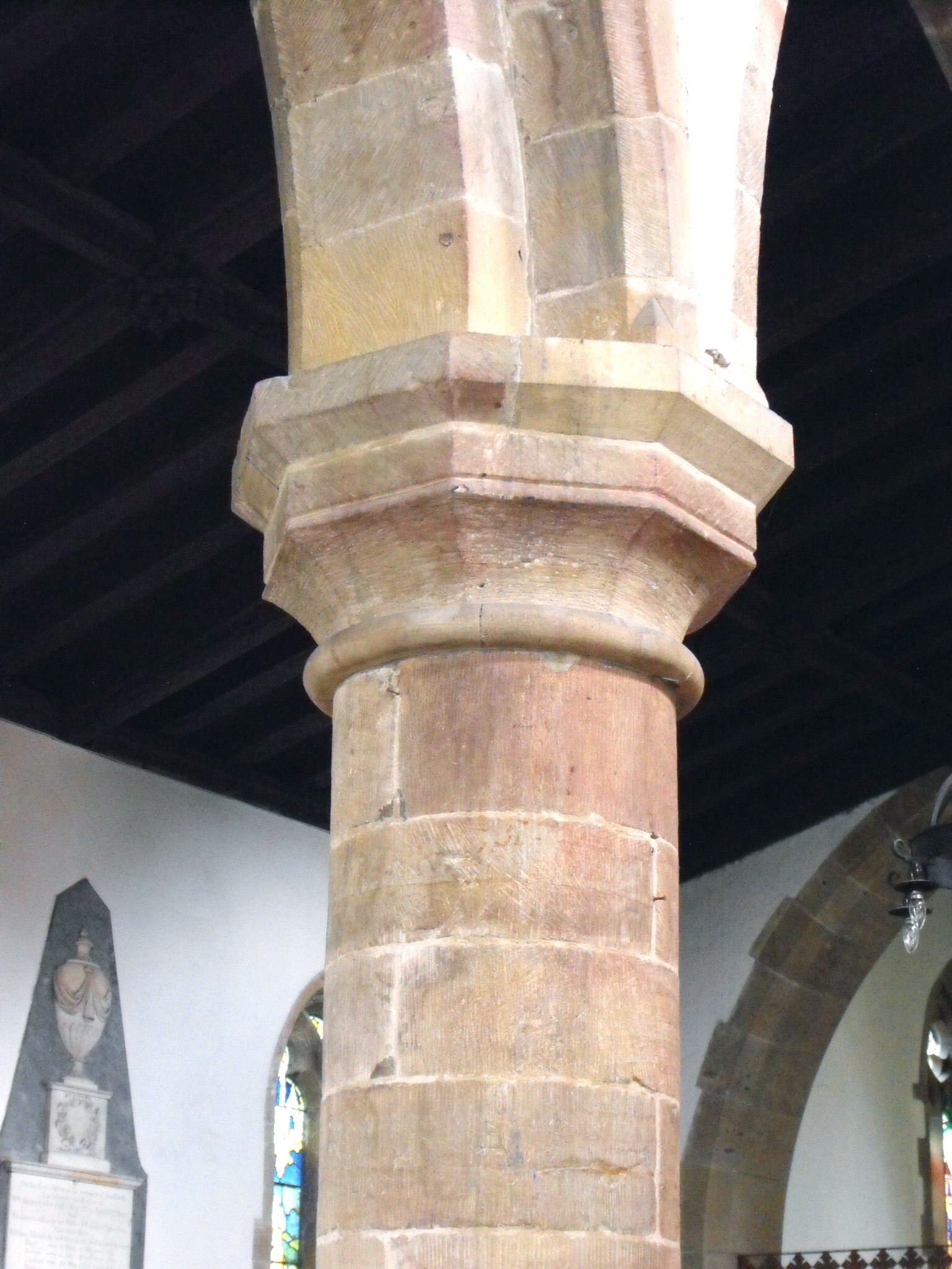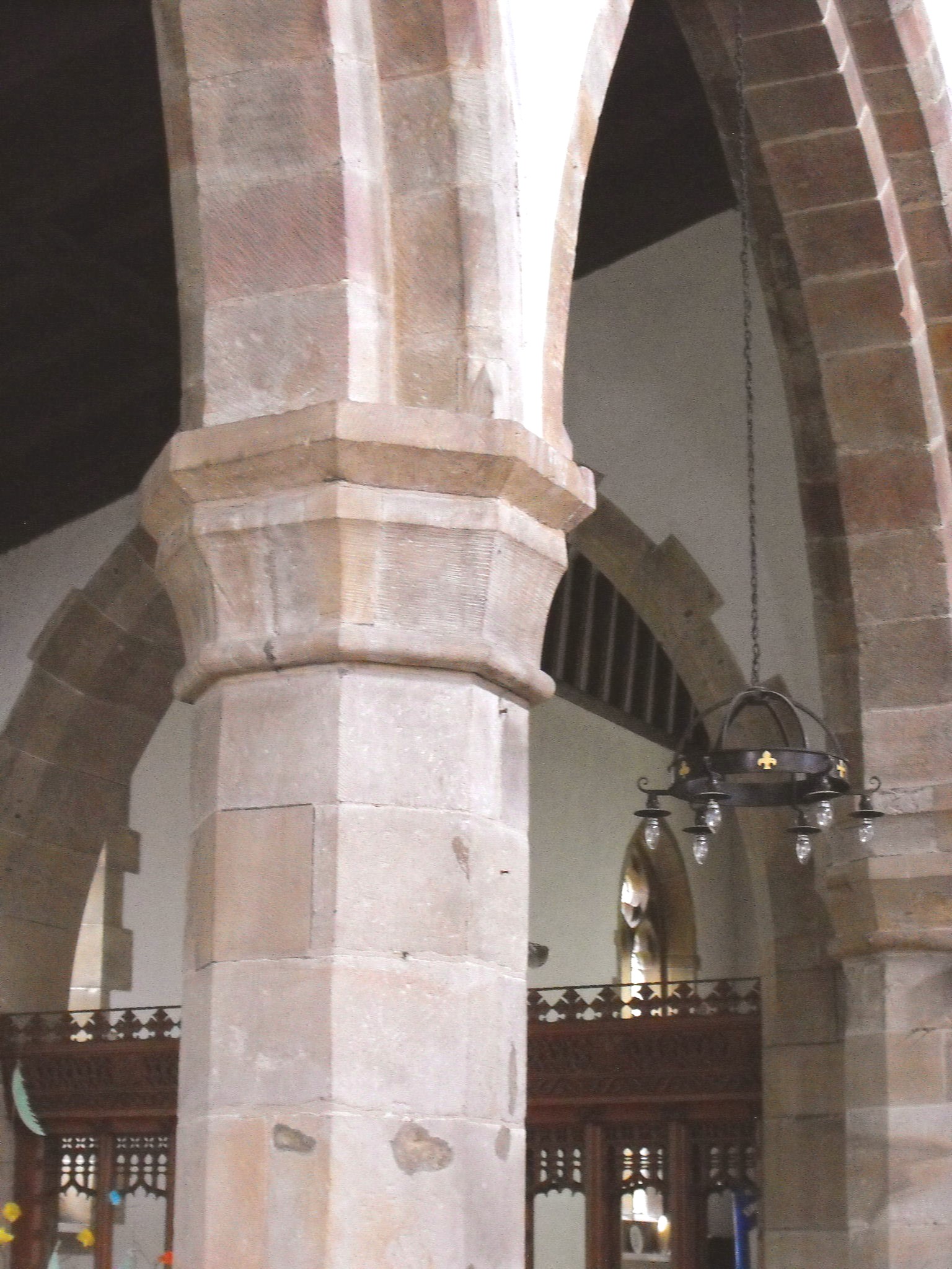 The aisled nave also presents something of a puzzle because the westernmost pier on either side is round rather than octagonal and has a very differently shaped capital, and as the two eastern bays would appear to be too short by themselves, ever to have run the entire length of the nave, the otherwise obvious explanation of regarding the westernmost bay as an extension of the building must probably be ruled out. (The photographs above show a general view down the nave from the west, and then the western and eastern piers of the N. arcade respectively.) The chancel arch is similar to the eastern arches of the arcades, albeit with the addition of broaches where the chamfers meet the responds. The aisle windows are renewed, untraceried and square-headed on the S. side, and on the N. side, comprised of a two-light window with cusped Y-tracery beneath a round arch and a two-light square-headed window with ogee-pointed lights, both broadly in keeping with the Decorated style. The nave clerestory formed of windows each with two rectangular openings, seems likely to be Tudor.