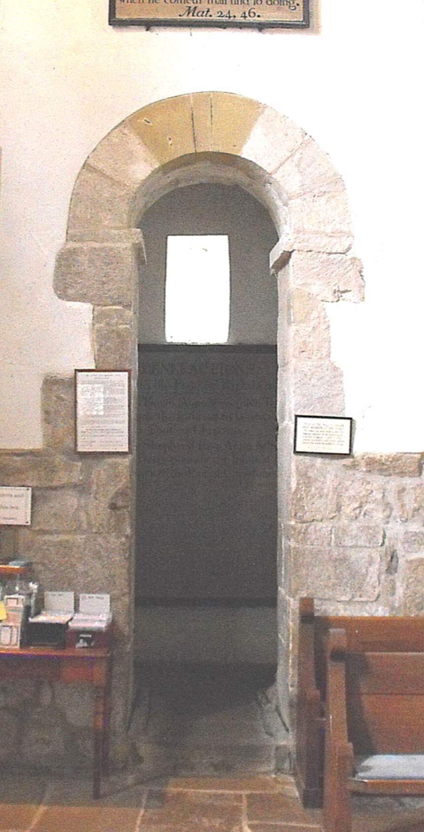 Internally the main Saxon feature is the tall and very narrow tower arch (below left) which was once the original entrance to the church before the silly little tower was added in 1827, as shown by the shafts on its west face. The chancel arch up to as far as the abaci, is also Saxon, showing the nave today remains its original length. The nave windows are all later insertions, and the three-bay N. arcade (below right) was apparently built on the foundations of the former Saxon N. wall c. 1200, when an aisle was presumably required to accommodate a growing congregation: the arches are composed of two pointed orders bearing the narrowest of chamfers, and the piers and responds are circular or semicircular with octagonal or semi-octagonal capitals, one of which carries a design which is clearly a variant of waterleaf. The S. doorway must have been inserted at about the same time. The chancel with its tall, steeply-pitched roof was rebuilt in 1881 but retains a few re-used thirteenth century features, namely its two lancet windows in the S. wall, its priest’s doorway, and its group of three lancets to the east.