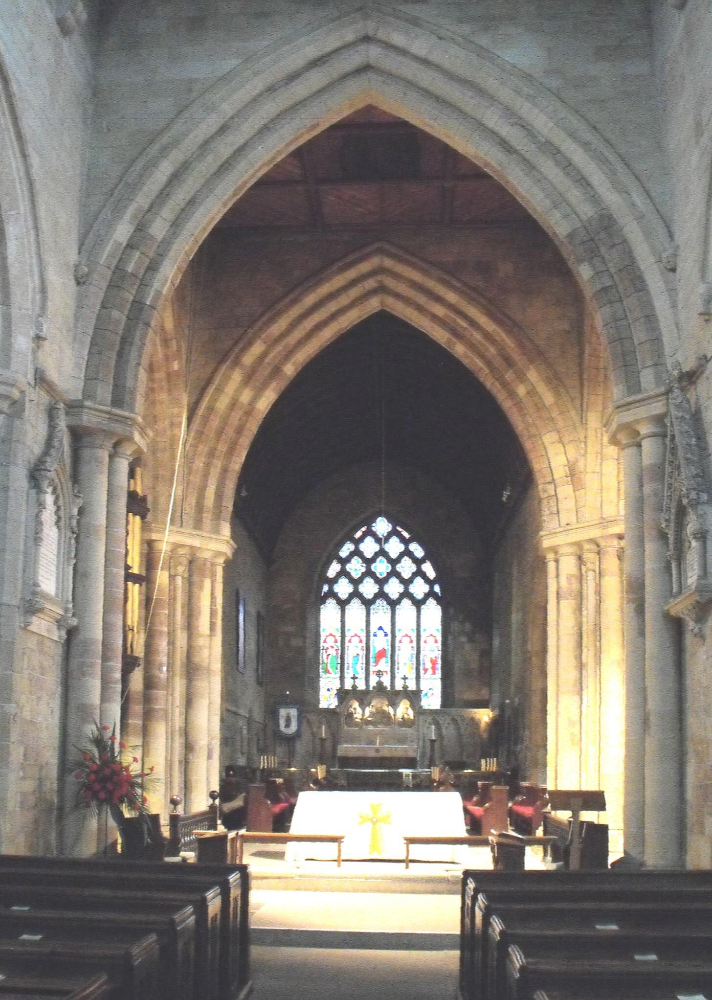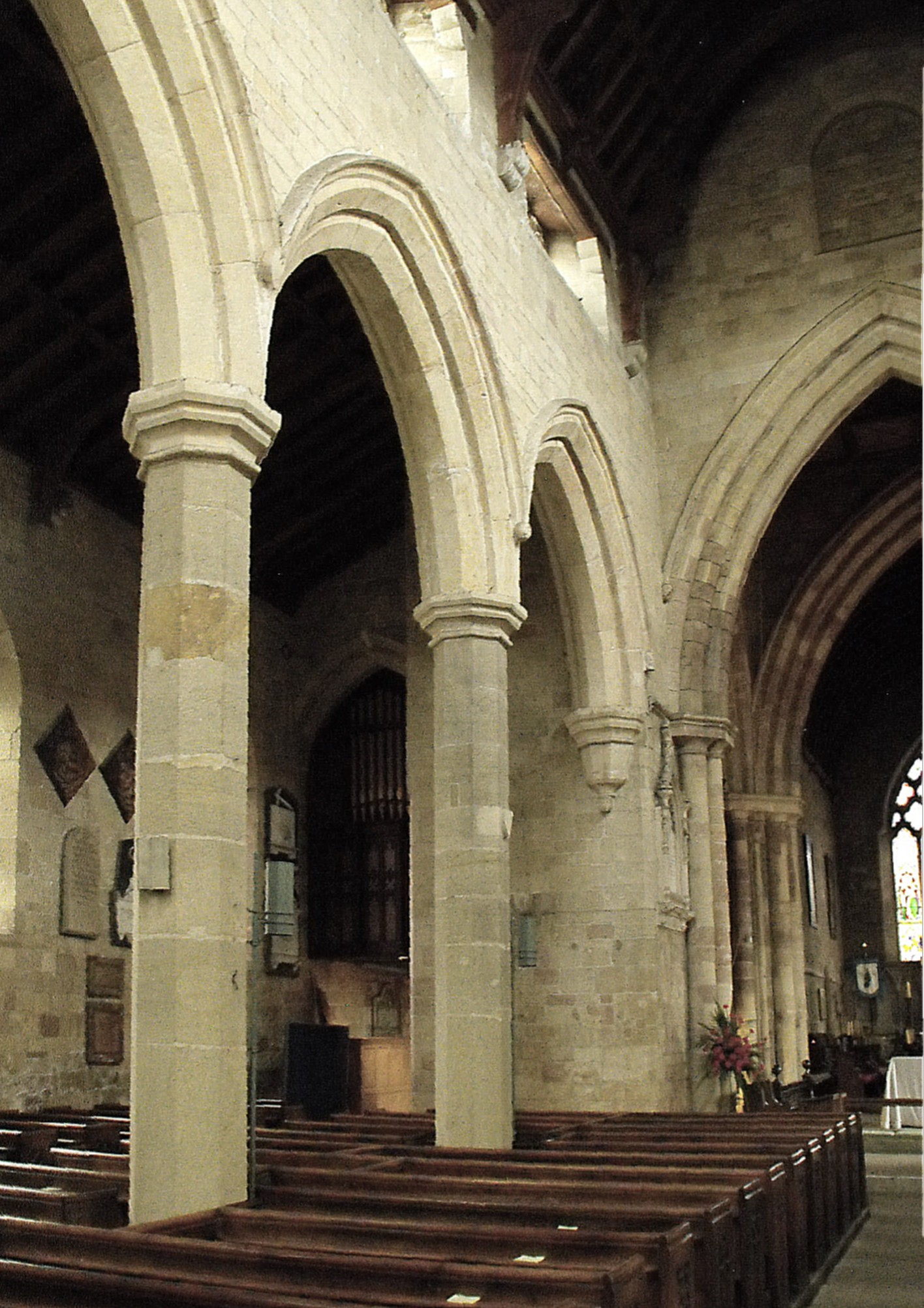 The oldest work is represented by the lower parts of the crossing. The crossing arches (illustrated below left, from the west), although pointed and narrower to the north and south than the east and west, are Norman-Transitional: three flat-chamfered orders comprising the arches themselves, are carried on massive capitals supported in turn by two orders of heavy shafts - the outer, circular, and the inner, keeled. The double-flat-chamfered arch from the chancel to the S. chapel and the triple-flat-chamfered arch to the N. chapel, cannot be much later, implying the chapels soon followed the realisation of the original plan. Perhaps contemporary with these, albeit of more elaborate design, is the arch from the former transept to the S. chapel, which, although substantially renewed, carries dog-tooth and several rolls within its complex series of mouldings. Immediately beyond, a renewed three-light chapel window with intersecting tracery, probably also witnesses the thirteenth century, while the E. window with reticulated tracery, appears to be an early fourteenth century replacement. The only other window in the church with this tracery is the renewed five-light chancel E. window, but a tomb canopy (or Easter sepulchre?), the two-bay sedilia, and the piscina, all recessed in the S. chapel S. wall, as well as a nodding canopied niche for a statuette, left (north) of the chapel E. window, are other Decorated features, as shown by their ogee arches, heavily ornamented with crockets.