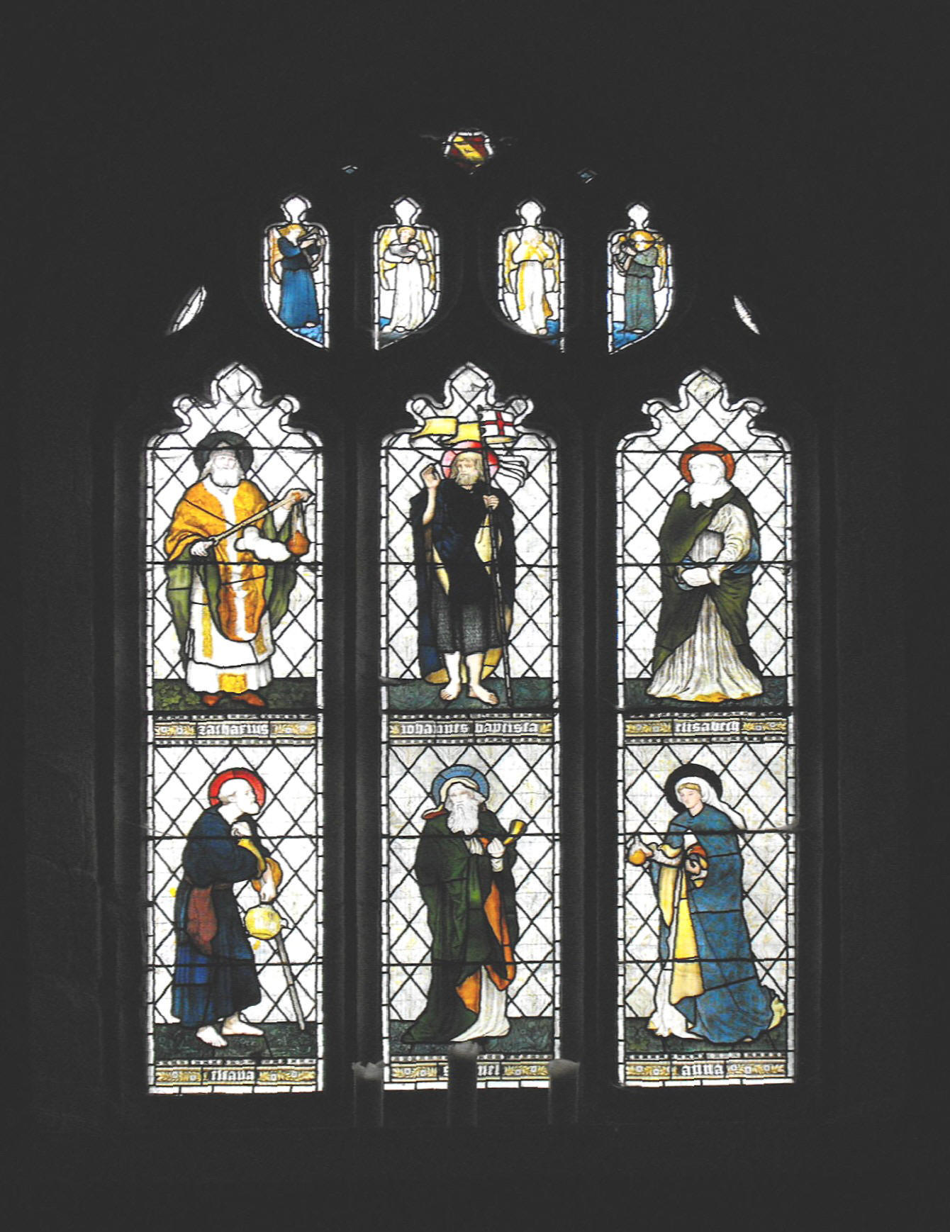 Most of the interest in the furnishings in the church, resides in the monuments in the N. chapel, the largest of which are dedicated to members of the Slingsby family. The oldest and biggest of all commemorates Francis Slingsby (d. 1601) and his wife, Mary, whose larger-than-life effigies recline on a heavy tomb-chest, with their hands clasped in prayer. The church guide (Arnold Kellett, Parish Church of St. John the Baptist, Knaresborough, Knaresborough, Friends of St. John's, 2011, p. 16) ascribes the work to a certain Thomas Brown, who charged £13 for his labours. Slightly later are two monuments which Pevsner states were ascribed by Mrs. Easdale to Epiphanius Evesham (The Buildings of England: Yorkshire West Riding, Harmondsworth, Penguin, 1967, p. 295), the first commemorating Sir Henry Slingsby (d. 1634), featuring Sir Henry standing between two columns with Ionic capitals, wrapped in a shroud and with an inscription in Latin, and the other, commemorating Sir William Slingsby (d. 1638), featuring a standing figure of the deceased, wearing a hat, boots and spurs, and leaning nonchalantly on his sword. Finally, the church contains no woodwork of real consequence but two stained glass windows were attributed by Pevsner to Ford Maddox-Brown, set in the S. wall of the chancel and the W. wall of the S. aisle. The latter (shown left) is the best and depicts six saints arranged in two tiers.