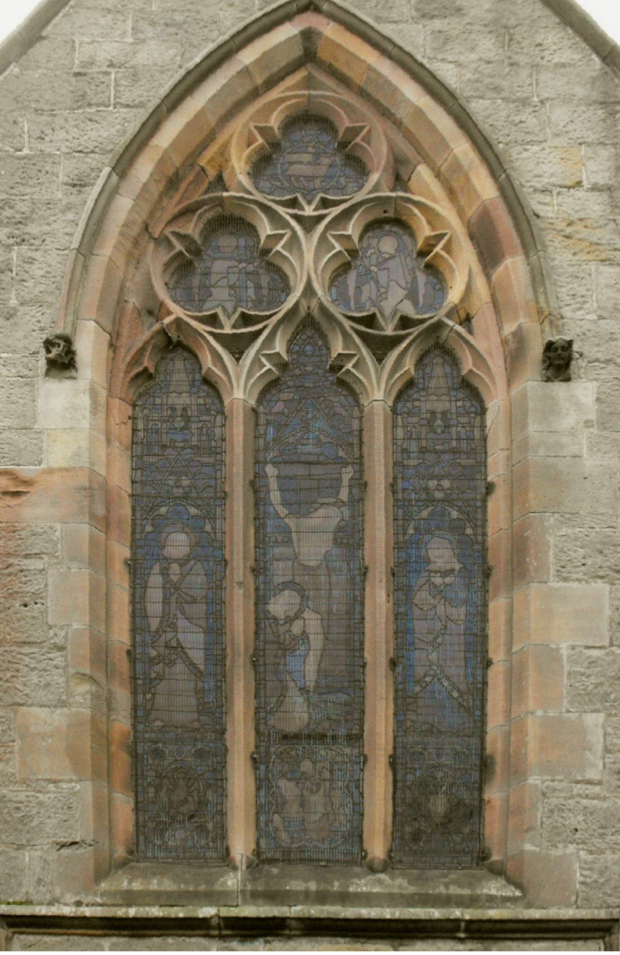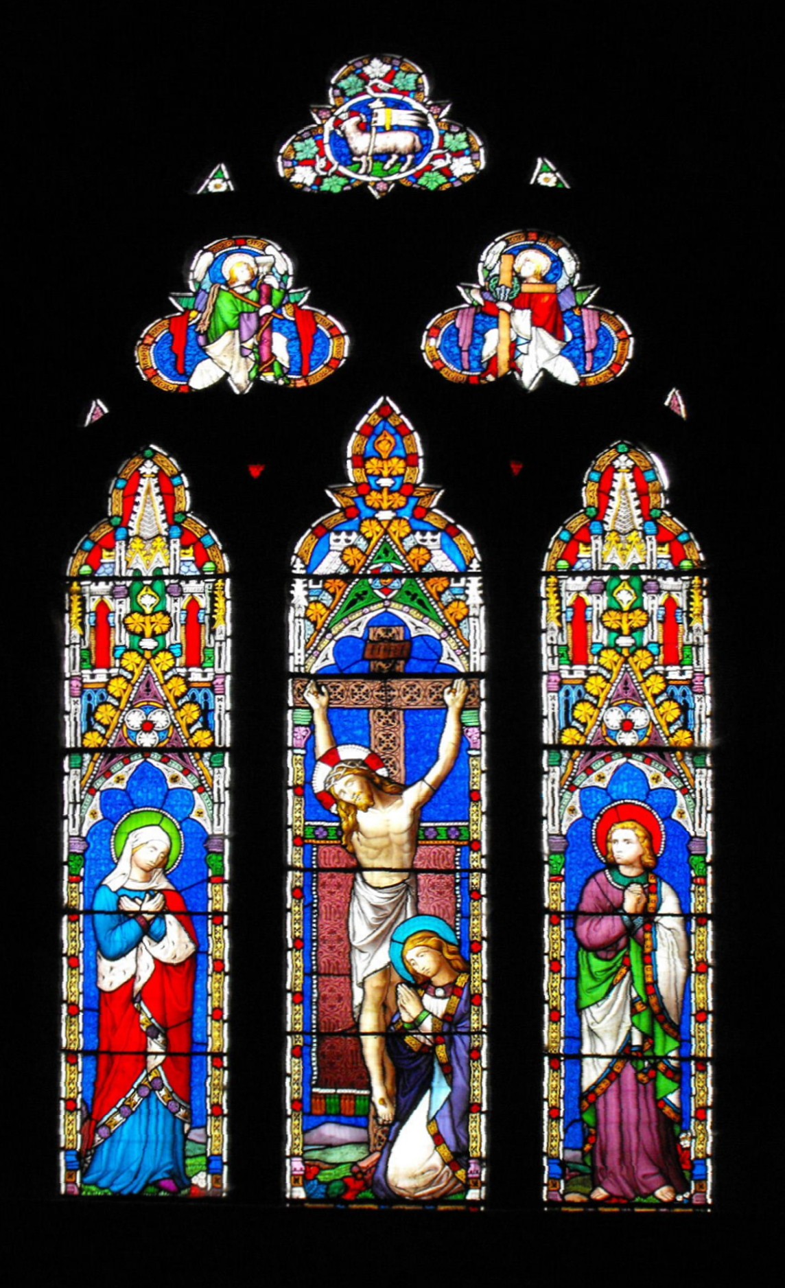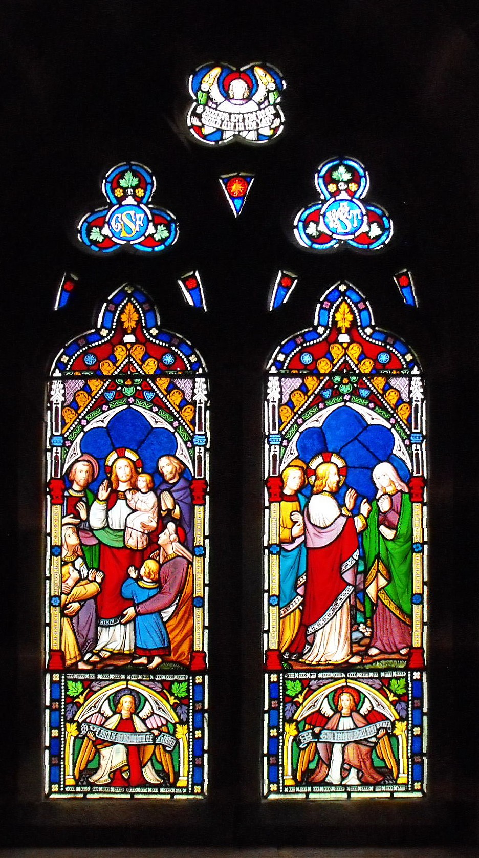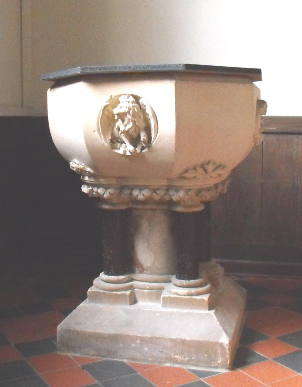 The interior is better. The stone now appears grey (is it the same one?) and the broad arch from the chancel to what must formerly have been the organ chamber (although only a poor little upright piano stands in it now) creates a modestly attractive perspective from the nave. The vestry opening behind it, preserves a re-set Norman doorway (admittedly rather worn), saved from the former chapel. The chancel arch is merely double-flat-chamfered above semi-octagonal responds, but most of the furnishings have attracted some decoration: the font of Caen stone (illustrated above right) has a large bowl with curved undersides and the Symbols of the Evangelists carved in roundels on the cardinal faces, supported on four black marble shafts; the pulpit, which unfortunately has been lowered (ibid., p. 13) has large carved figures of saints on the sides of the drum; and the reredos consists of seven blank arches with the outer pair on each side supported on black marble columns. The original stained glass by Wailes in the chancel windows illustrates, to the east, the traditional scene of Christ on the Cross with SS. Mary and John on either side, and in the two-light window to the south, the text 'Suffer little children, and forbid them not to come unto me' (Matthew, 19, v.14). (See below.)