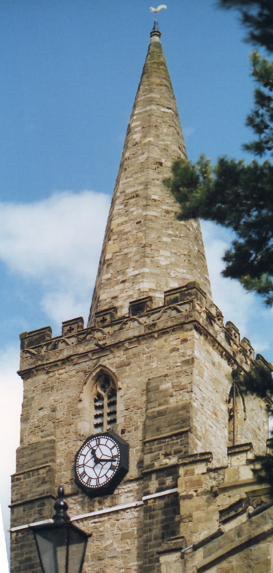 This is a church with a complicated history, which is best set out in summary before the building is examined: There was formerly an aisled, cruciform Norman church here, with an apse, which itself had been built on the site of an even earlier Saxon church. The Norman central tower collapsed early in the thirteenth century, bringing down the S. transept with it, and this was then rebuilt and a new tower begun at the W. end, although this was not finally finished for almost two hundred years. Around the end of the thirteenth century, a new chancel was constructed, replacing the former apse with a square E. end, and since this was built a few feet wider than the crossing (possibly for reasons of increased accommodation), it is this that gives the building its curious splayed appearance today.