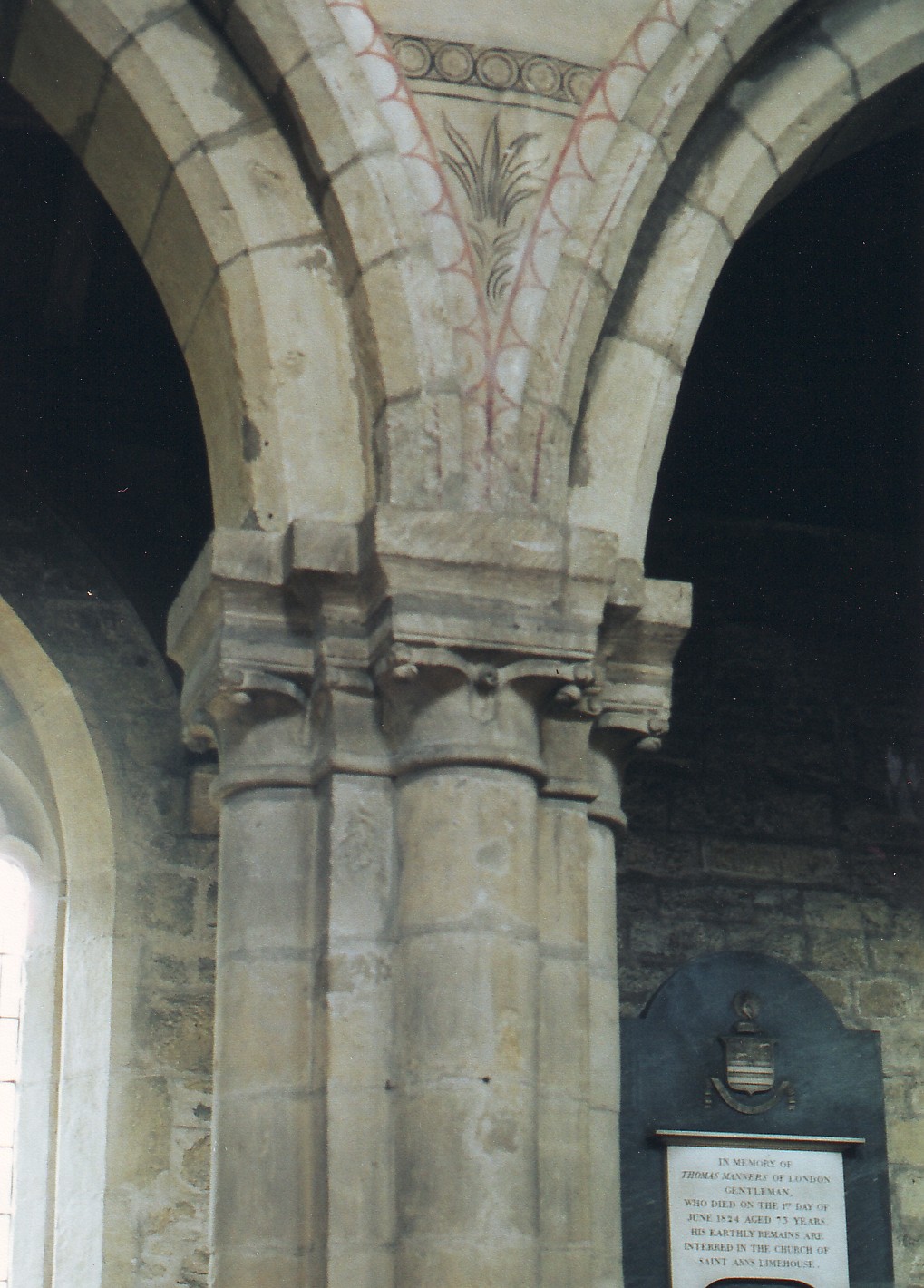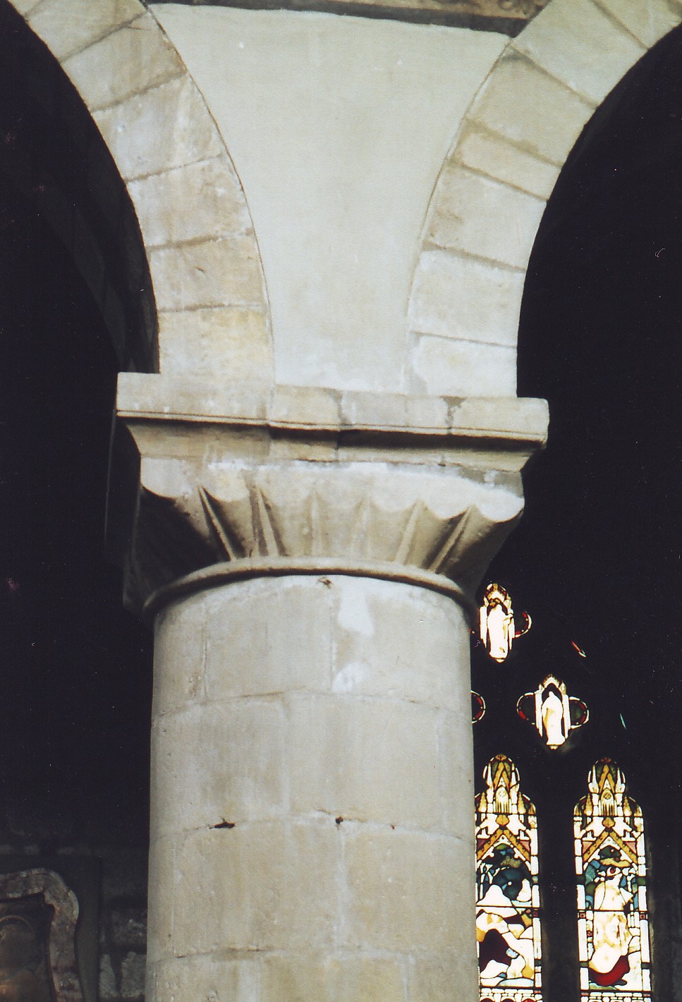 The surviving architectural evidence can now be considered in approximately the same order as the building history above: Of the Norman church, only the nave arcades remain. These are five bays long, with short wall pieces between the fourth and fifth bays from the west, demarcating the position of the former W. crossing arch. The four western bays of the N. arcade consist of massive round arches of one unmoulded order, springing from circular piers with scalloped capitals (one of which is shown below left), the work, perhaps, of the mid-twelfth century. The four bays of the S. arcade opposite, are later, for although the arches are still round, they are formed of two flat-chamfered orders, springing - except at the western end - from compound piers composed of four semicircular shafts attached to piers of square cross-section, with water leaf capitals that date them c. 1190 at the earliest. (See the example illustrated below right.) The fourteenth century western pier and the western respond of this arcade, are octagonal and semi-octagonal respectively. The Early English easternmost arch of each arcade is double-flat-chamfered and pointed; however, the N. arch springs from semicircular responds with square capitals decorated with grotesques, and the S. arch springs from responds composed of three shafts, suggesting a slight difference in date between these arches also or that different masons were responsible. The chancel windows also look like thirteenth century work although Pevsner considered that their uncusped intersecting tracery 'can probably not be trusted' (The Buildings of England: Yorkshire North Riding, Harmondsworth, Penguin, 1966, p. 282). However, the head of one such window in the S. wall, survives in a position where it now only looks through to the chapel, and since it is unlikely that this would have been remodelled, that suggests that at least the original form of these windows is preserved.