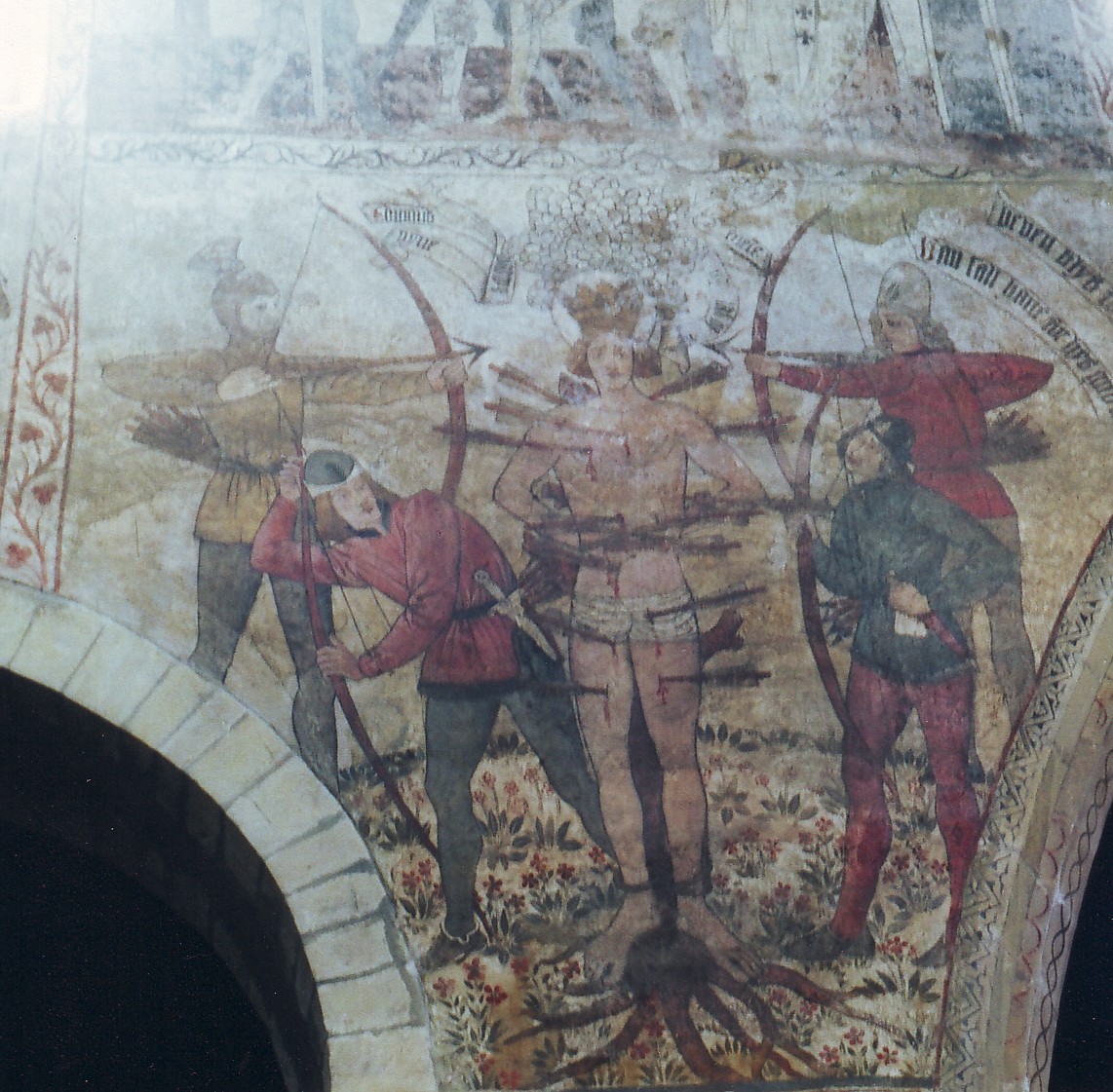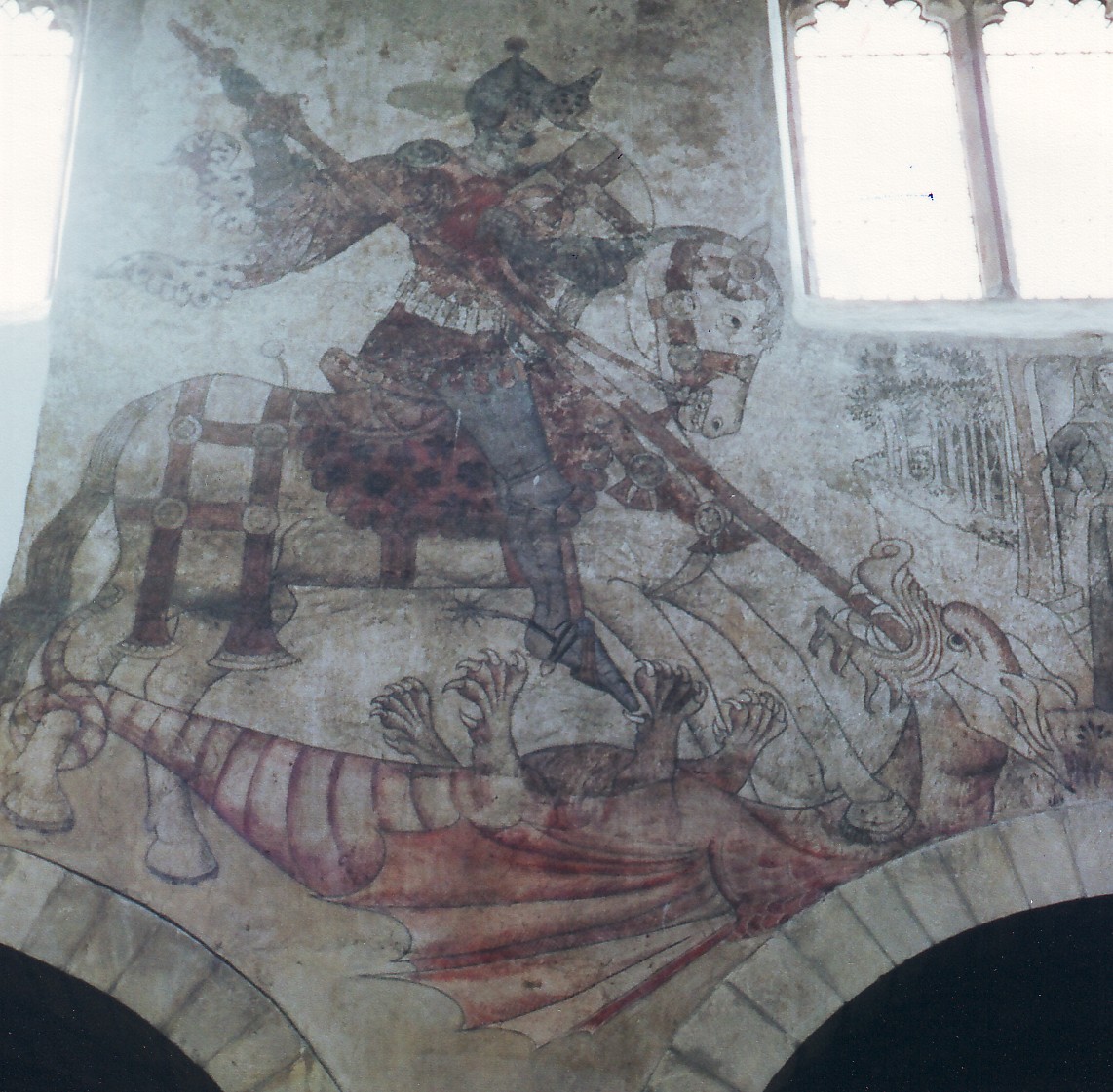 However, after all this description, it is probably true that Pickering church today is most famous for its wall paintings. They cover the greater part of the nave walls, above and around the arcades, and are fifteenth century in date, albeit heavily restored (in 1880). Pevsner commented deprecatingly that 'as they had never been great art, it is perhaps better to see them now clearly than to see their original brushwork dimly'. Doubtless they have faded a good deal since his visit in 1966 for they are certainly not overwhelming today in their reds, blacks and browns. Among the many scenes depicted are the martyrdom of King Edmund (seen above left), St. George and the Dragon (above right), a large St. Christopher (a popular subject in this part of Yorkshire), and the martyrdom of St. Thomas à Becket.