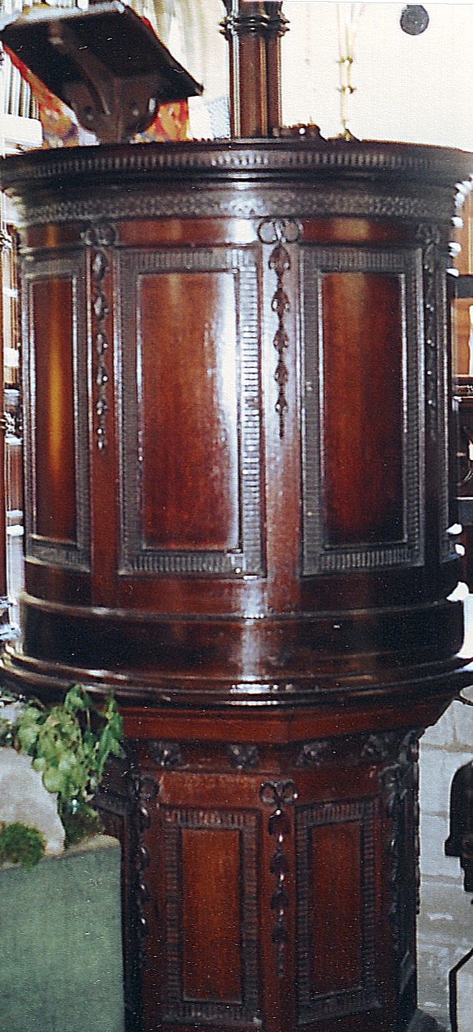 Finally, one item of woodwork must be mentioned, namely the excellent, eighteenth century round pulpit in the style of Hepplewhite (shown below). This is decorated around its circumference with eight square panels, but the whole piece is finely and delicately crafted.