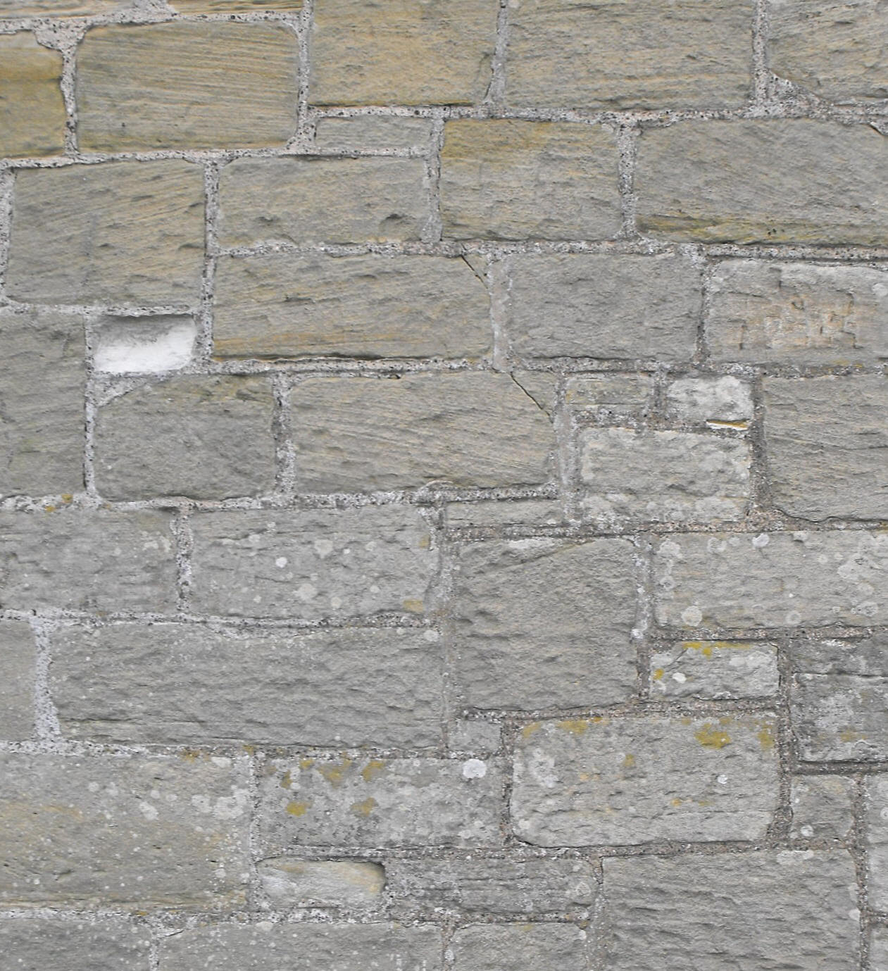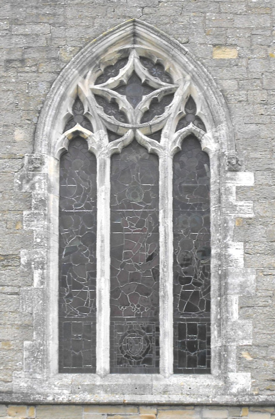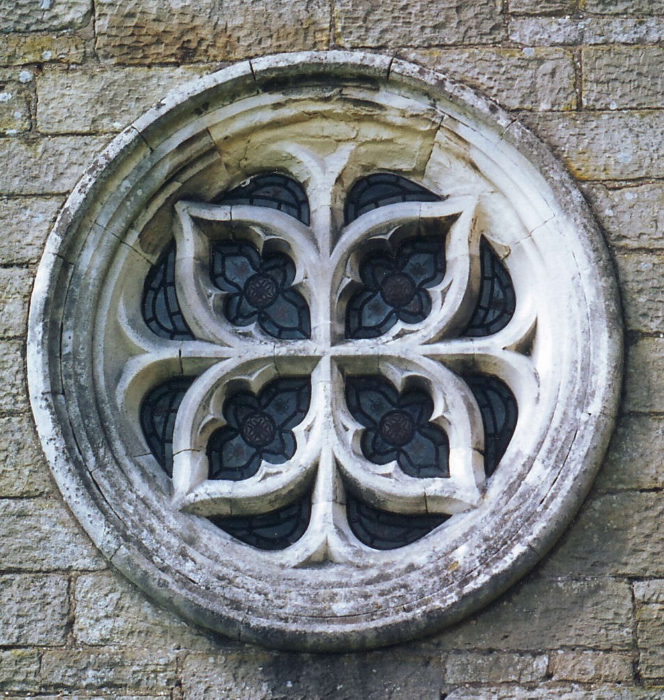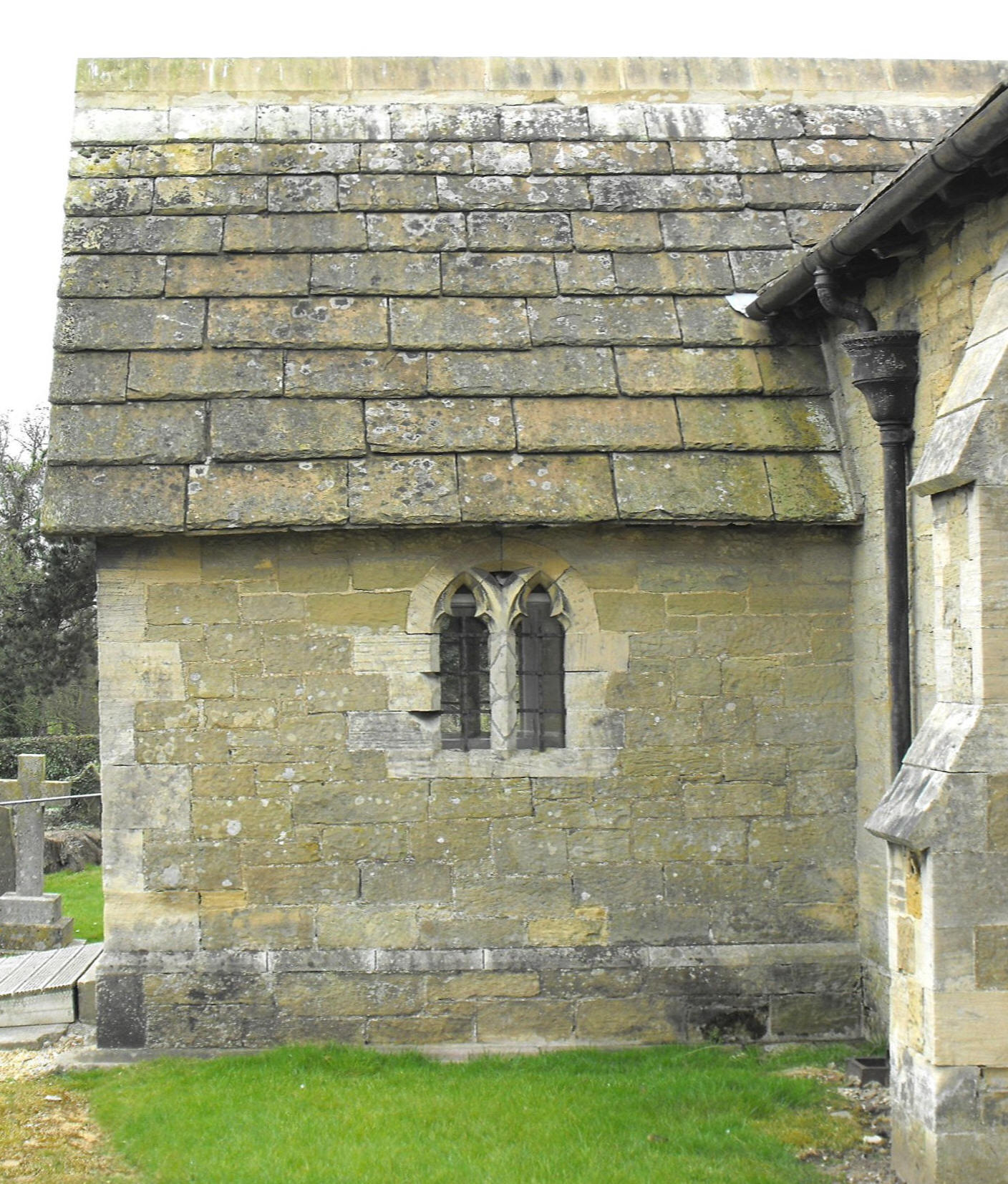The walls of the church are constructed of a sandy limestone with dressings of magnesian limestone from Burton Leonard on the Permian outcrop, twelve miles to the southwest *. (A detail of the masonry is shown above left.) Limestone slates have been used for the roofs (as seen on the porch, above right) and wooden shingles for the broach spire. The building consists of a W. tower with a spire, a nave with a S. aisle and a S. porch, and a chancel with a cross-gabled N. vestry. The windows display a variety of pseudo-mediaeval designs, of which the circular E. window to the S. aisle (below left) and the chancel E. window (below right) are the most original.