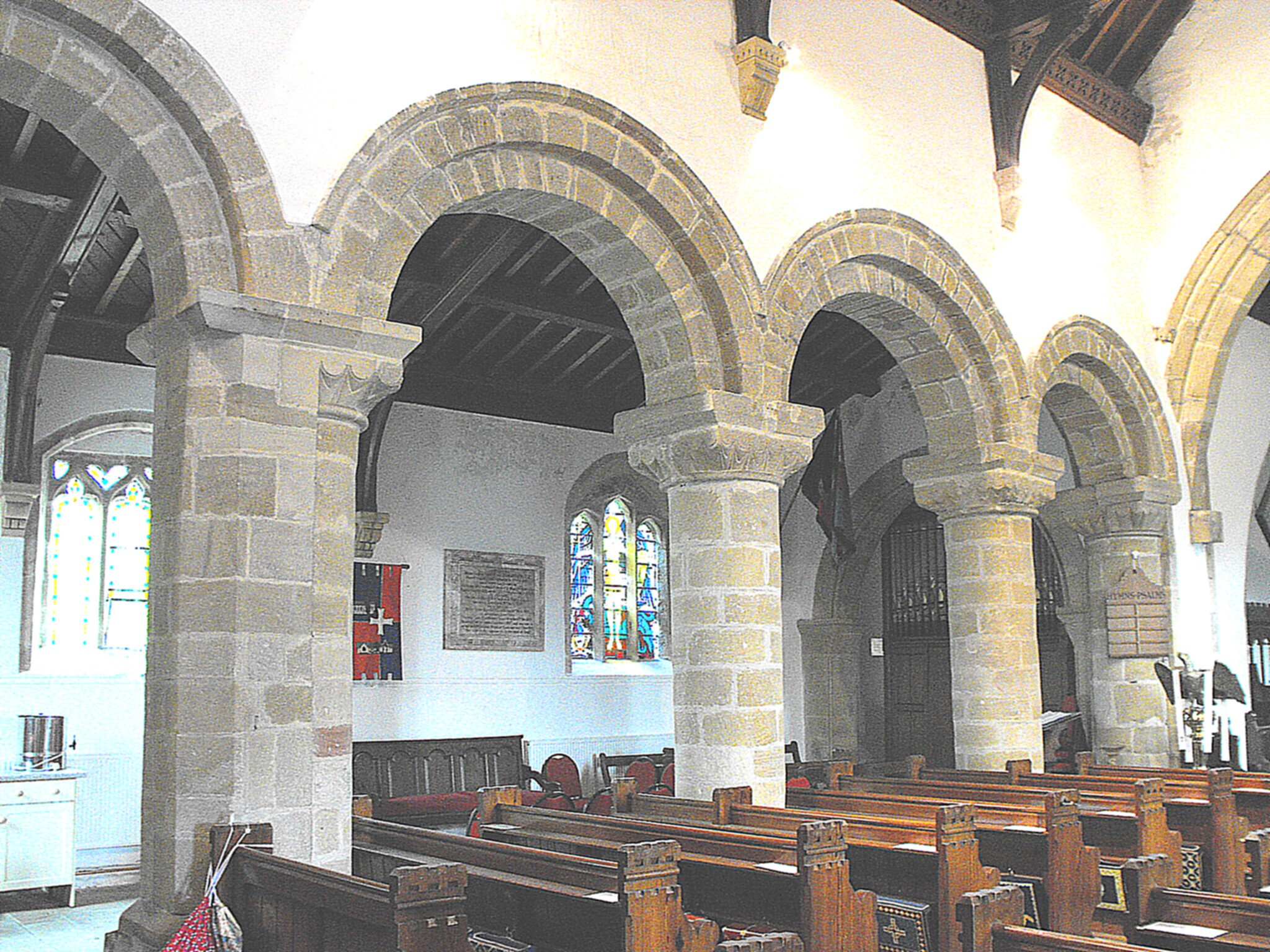 This is not an especially large church, but it is a quite complex one, deserving careful examination. It is attractively situated on the edge of open countryside, just two miles from Leyburn, and any visit here is likely to be a pleasant one. The building is formed of a W. tower, an aisled nave with a S. porch, and a chancel with a N. chapel and vestry, and includes work of all centuries from the twelfth to the seventeenth. Externally, the dominant impression is created by the Decorated style of the early fourteenth century, but since the oldest and most striking work is inside, that is a better place to begin. It comprises the three eastern bays of the N. arcade (shown below), the easternmost of which is narrower than the others, formed of arches of two orders, supported on circular piers with large, square, scalloped capitals. This arcade was subsequently extended by a fourth bay to the west, as demonstrated by the fact that the pier between it and its neighbour is not strictly speaking a pier at all but a meeting of two responds, divided by the narrowest of wall pieces. Above the springing, however, except in the absence of a hood-mould, this final arch is virtually identical to the previous two, posing questions about its date. Pevsner considered it a thirteenth century extension of the building, contemporary with the S. arcade opposite, presumably assuming that the masons involved in the construction of the latter, took the trouble to replicate work here in what was considered then a discredited, outmoded style. If that seems doubtful, perhaps another possibility is that this arch is essentially twelfth century work too, either contemporary with the other bays or following shortly after, and that the dissimilarities are the result of a partial reconstruction made necessary by the sort of structural problems that might have arisen when the tower was added in the early fourteenth century. Be that as it may however, the S. arcade is formed of three arches which together span the same distance as the four to the north. (See the internal view of the church at the foot of the page, viewed from the west.) These are double-flat-chamfered and supported on circular piers with square abaci. This arcade probably be ascribed to the early thirteenth century (i.e. before 1250), if only because such a date fits the aisle windows better.
