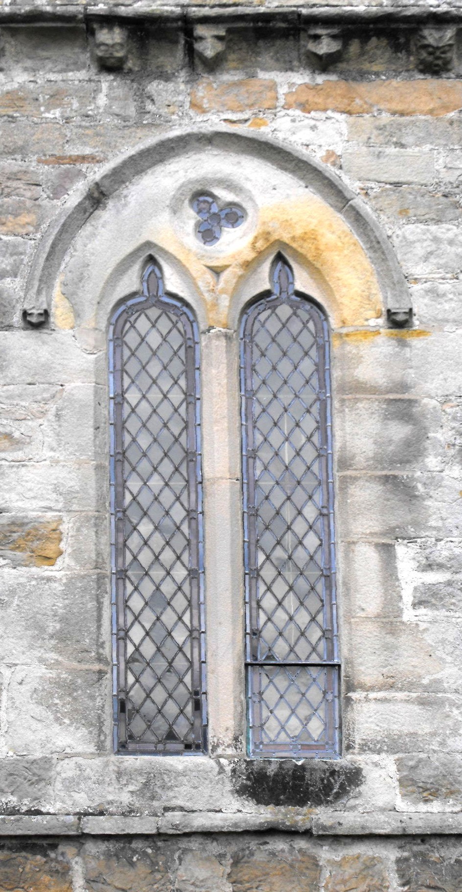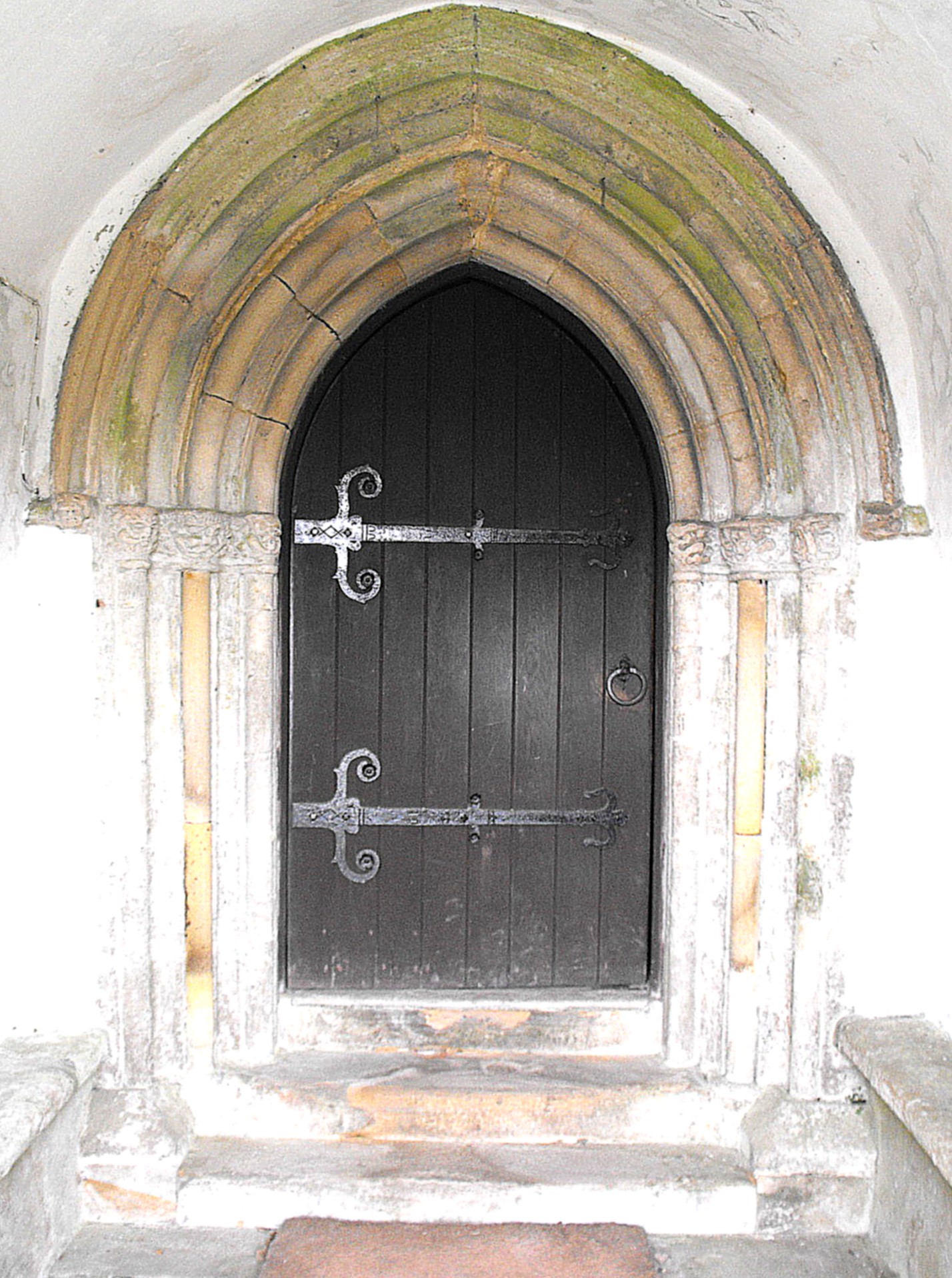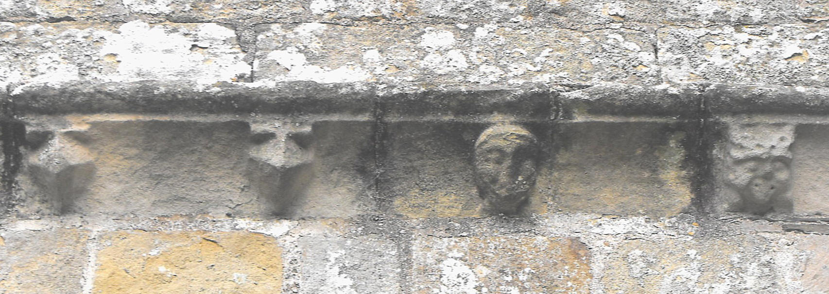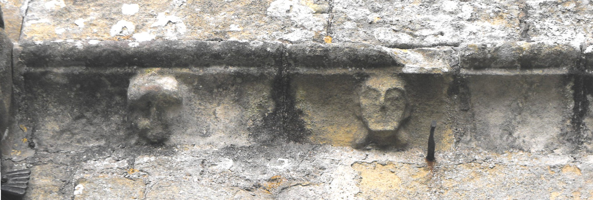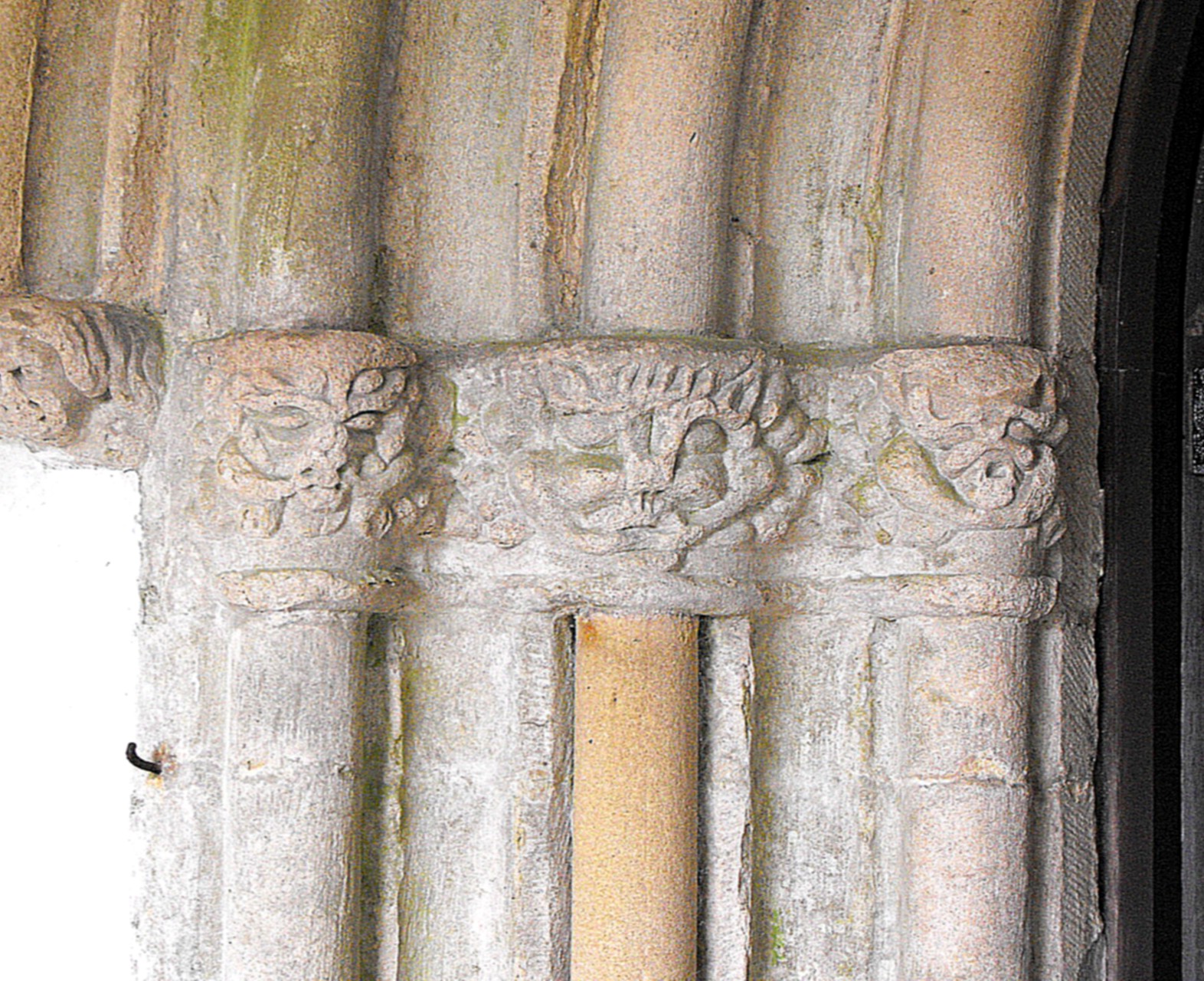 Externally, the S. aisle has a corbel-table of carved heads running round beneath the parapet (see the two short sections illustrated below) and is lit to the east of the porch, by two, two-light, trefoil-cusped windows with trefoils above, in which the tracery in the first, seems to verge on plate tracery, a form increasingly uncommon from c. 1250 onwards. (See the photograph at the top of the page on the right.) The porch is windowless but the wide hollow chamfer round the arch may suggest this is Decorated; its notable feature is the tunnel vault within. However, the porch inner doorway (illustrated by the second photograph below on the left) fits comfortably with the presumed date for the aisle: it has three roll mouldings round the arch and three orders of colonnettes at the sides, with capitals resembling stiff-leaf but actually formed of continuous rows of faces. (See the detail of the left hand capitals in the second photograph below on the right.) The N. aisle has a doorway towards the west with the Sacred Monogram above, and an undistinguished group of restored Perpendicular windows further east. The chancel is lit by two, two-light reticulated windows to the south and a four-light Perpendicular window to the east, with lights subarcuated in pairs, through reticulation and a quatrefoil in the apex.