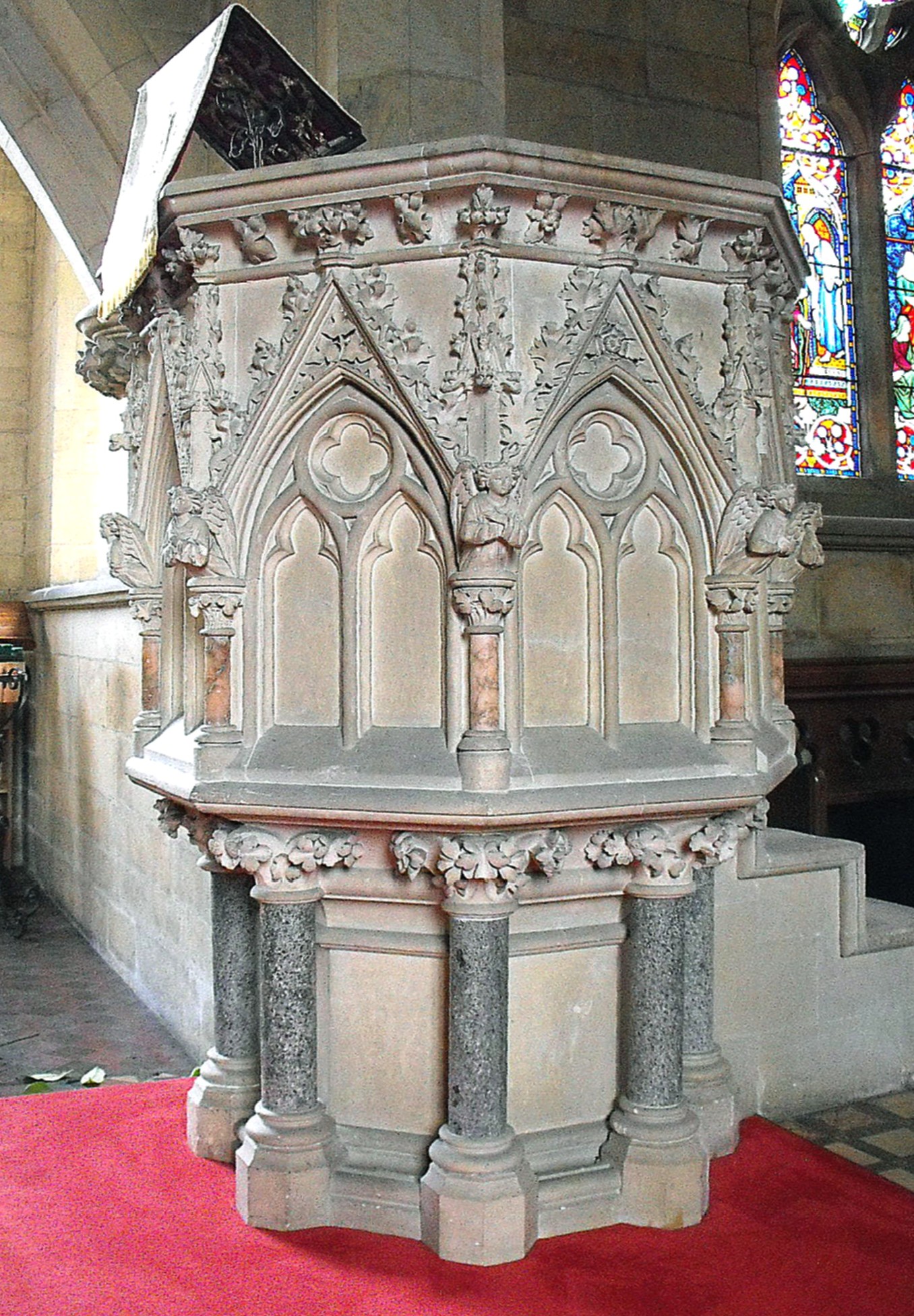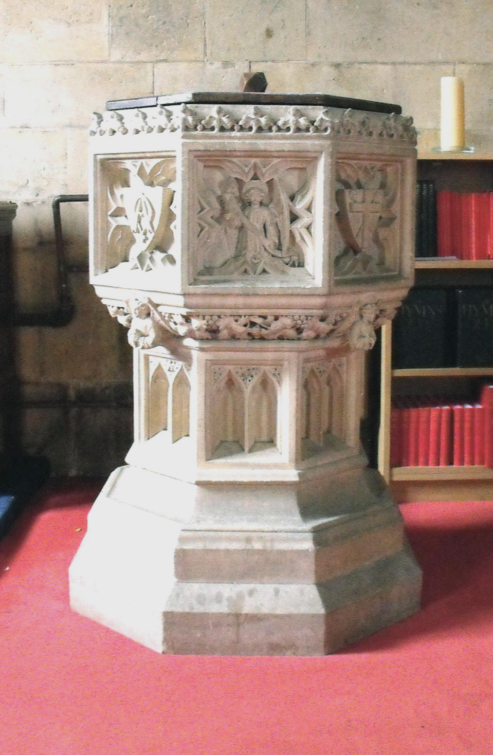 As for furnishings, then as discussed under the entry for Thornhill Lees, the number of items Healey appears to have designed for his churches seems to have been roughly commensurate with the buildings' total cost, and here it seems likely the exceptional pulpit is his, not least on the grounds of its general similarity to his authenticated pulpit at Thornhill Lees. (See the photograph above left.) Indeed, the carving at Welburn is arguably the less intricate of the two, but the overall effect is richer due to the careful introduction of a little structural colour: there is leaf carving beneath the bookrest; the drum is decorated with two-light, geometrical-traceried 'windows' with elaborately crocketed gables, separated by carved angels atop diminutive brown marble columns; and the stem is surrounded by eight mottled black marble shafts with stiff leaf capitals in white stone. It is a particularly fine piece and it is a pity there seems to be no information about its design or manufacture. The font (above right) is not the equal of the pulpit, but would be a fine addition under most circumstances, nicely carved as it is in white stone. |