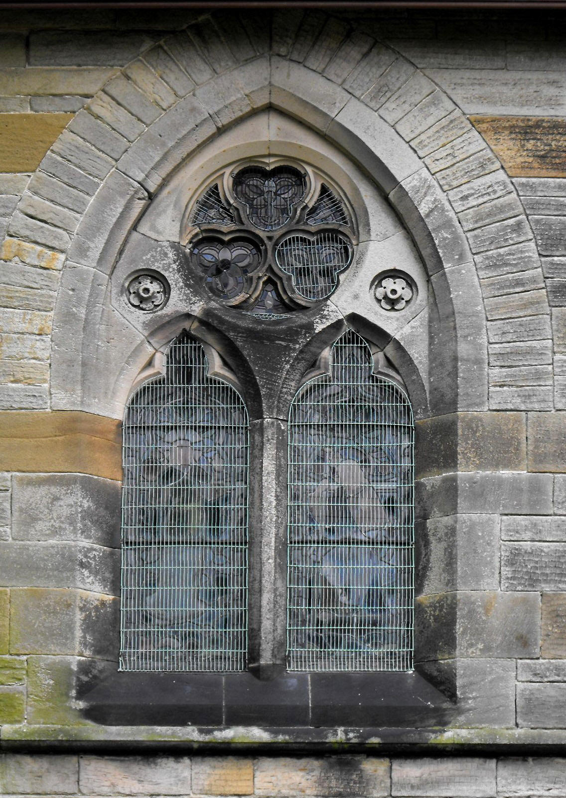 Every window differs from its neighbours. Thus the sanctuary S. window is two-light, with plate tracery pierced by a circle containing three trefoils; the E. window is three-light, with two encircled double-cusped quatrefoils and an encircled double-cusped cinquefoil above; and the nave N. windows include one with an encircled double-cusped quatrefoil in the head (as illustrated, in that order, above). The nave W. window is formed of four equal, trefoil-cusped lancets, beneath a wheel of four cinquefoils, set within in a single, deeply-splayed arch.