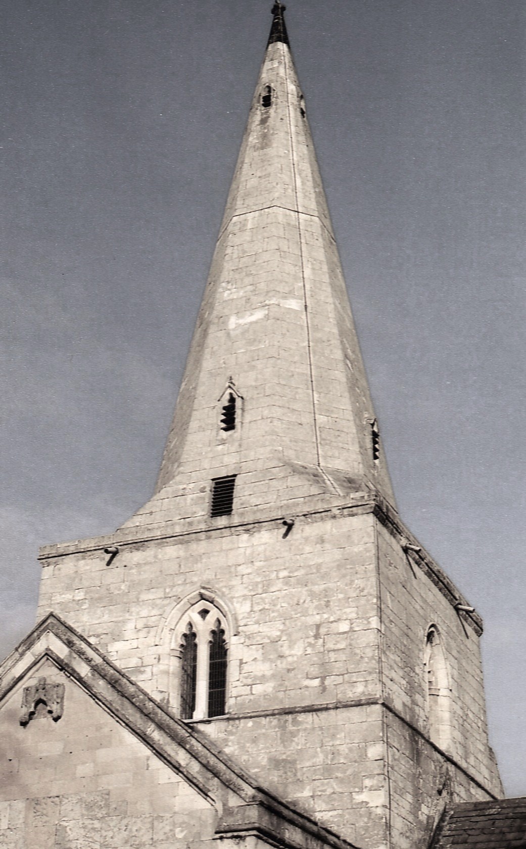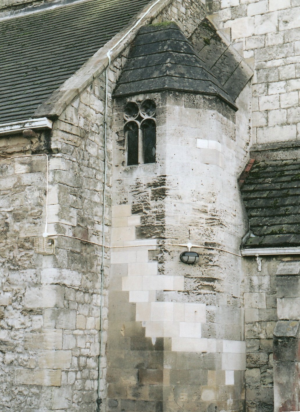 Built of cream-coloured magnesian limestone, this is a cruciform church comprising an aisled nave with a S. porch, a crossing tower with a tall broach spire (illustrated above left, viewed from the southeast), N. and S. transepts, and a chancel with a Victorian N. vestry. The wide, independently-gabled S. aisle ends one bay short of the nave W. wall and the N. transept has been truncated to form an organ chamber, now covered by a poor lean-to roof. However, the large semi-octagonal rood stair turret survives immediately to the west, lit at the top by an attractive little Perpendicular window with quatrefoils in circles above the lights (as shown above right).