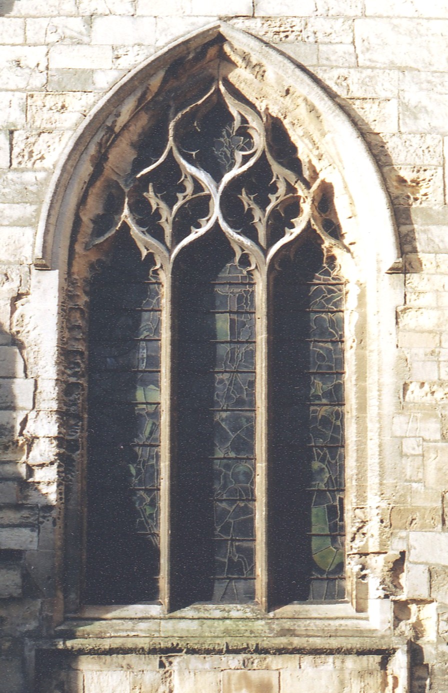Externally most other architectural evidence is Decorated although there are minor features in Early English style and a few from the Perpendicular and Victorian periods. Earliest, therefore, are probably the wide, short lancets at the W. end of the N. aisle, even though at first sight their proportions make them look suspect. Decorated windows include those with two-lights and reticulated tracery in the clerestory (that is, all except the easternmost on the N. side, and those west of the S. aisle on the S. side), the cinquefoil-cusped Y-traceried bell-openings of the crossing tower and, most especially, the three-light S. transept E. window, again with reticulated tracery but here also with subreticulation. (See the photograph below left.) The easternmost clerestory window to the north and two, two-light windows in the N. aisle have straightened reticulation units in their heads, which is usually indicative of an early Perpendicular date. Perhaps rather later is the square-headed S. aisle window with a lozenge pattern of quatrefoils above the lights, and the four-light W. window to the nave, with supermullioned tracery that is now largely renewed. The two-light chancel windows to the south and the three-light S. window to the S. transept are Victorian and probably by George Frederick Bodley (1827-1907), who restored the church in 1893. (The date is recorded on the vestry drainpipe.) These are very unspecial but Bodley gives a better account of himself inside the building. Surprisingly, there is no window in the chancel E. wall.