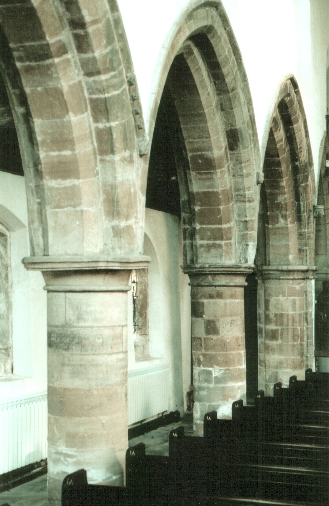 The S. porch, through which one enters the building, has a stone roof which is not so much a vault, as Pevsner described it (Nikolaus Pevsner & Enid Radcliffe, The Buildings of England: the West Riding of Yorkshire [sic], Harmondsworth, Penguin, 1967, p. 556) as simply a mortaring together of stone flags, supported by transverse arches. Pevsner's interpretation of the curious N. arcade, however, is very convincing. This consists of three wide arches in the centre and a narrow one at each end, with the narrow ones separated by intervening short wall pieces. The central bays (illustrated above right, viewed from the west) are Early English and composed of double-flat chamfered arches springing from two circular piers and a semicircular respond at the E. end. However, the W. respond is rectangular and formed of two orders, like the Norman responds to the arches beneath the tower at All Saints', Sherburn-in-Elmet. Pevsner concluded that this respond and the attached wall piece mark the northwest angle of a former Norman nave, and that the narrow arch to the west beyond - with two flat chamfered orders dying into the jambs - was the result of the building's thirteenth century enlargement. As for the narrow, separate eastern arch, now largely renewed, Pevsner speculated that the insertion of this was made necessary by the incorrect setting out of the crossing tower when this was added to the previously tower-less building in the early fourteenth century. That, however, may be to underestimate the builders. Another explanation could be that the tower was deliberately built a short distance away to the east, to allow it time to settle on its foundations before it was attached to the pre-existing building. The crossing arches are tall and also double-flat-chamfered, and spring from responds composed of two orders of semi-octagonal shafts. The short S. arcade consists of two wide bays only, formed of double-flat-chamfered arches supported on an octagonal central pier and semi-octagonal responds. This is probably contemporary with the crossing tower, or nearly so. An arch of possibly Perpendicular section, dying into the imposts, separates the S. aisle from the transept.