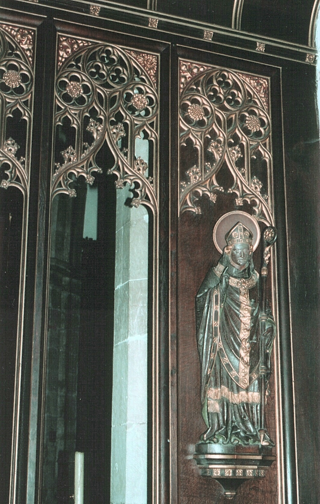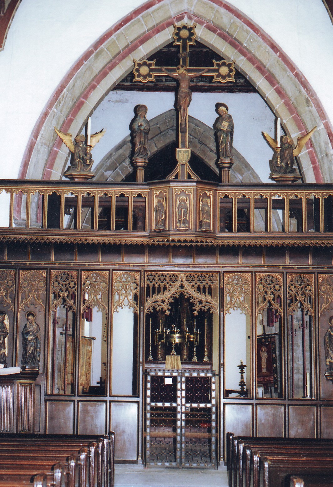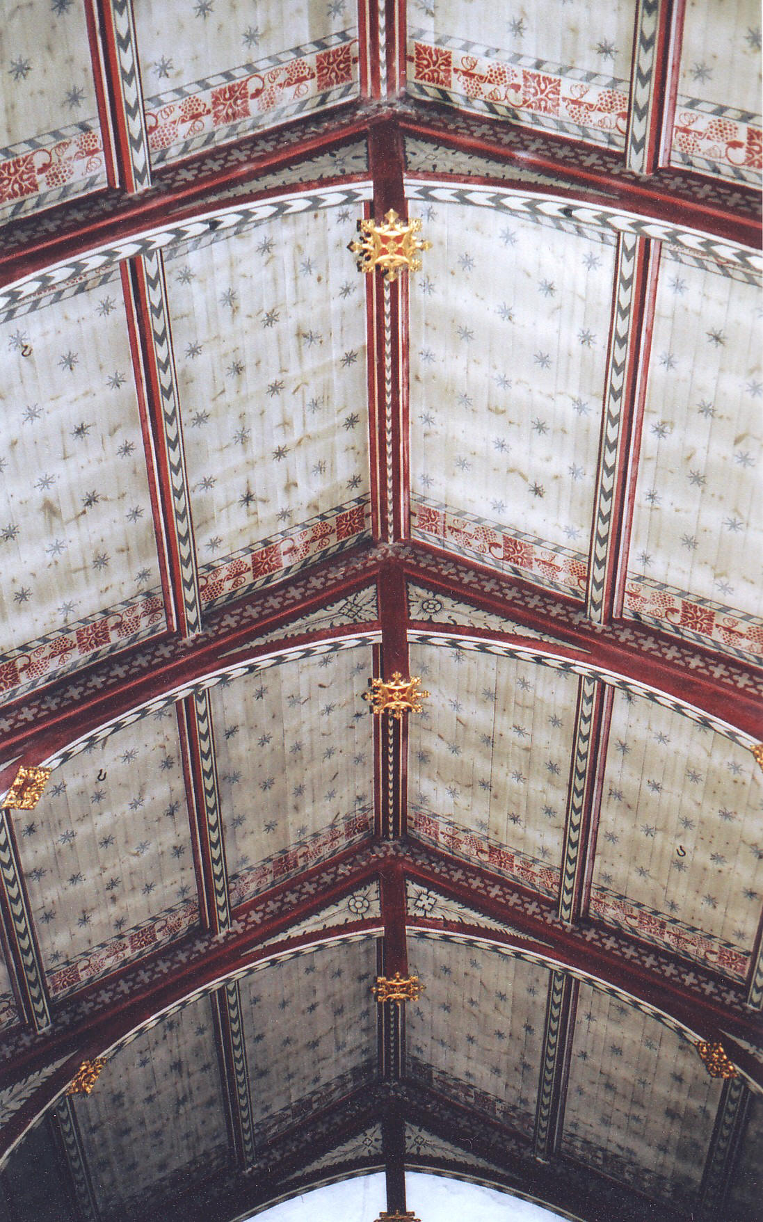 It remains only to describe Bodley's contribution to the building interior. This consists almost entirely of woodwork, meaning principally the roofs and the rood screen and loft, and is distinguished - as so often the case with his work - by the use of skilfully designed painted decoration. Perhaps the nave roof is best (see the left hand photograph below). Of arched-braced construction, this is patterned in grey, black and red and has a gilded brattishing along the cornice, creating an effect which is at once both ornate and sombre. Also fine is the chancel roof, of tie-beam construction with further elaborate decoration; the flat wooden ceiling beneath the crossing and the S. transept roof of couple type are treated somewhat more simply. However, it is the rood screen and loft that dominate the church interior. The screen (shown below centre and below right) is divided into five bays left of the passageway and four on the right, each with complex double-cusped tracery. The wood has been partly left in its natural colour and partly burnished in gold. Carved and painted saints adorn it to left and right and on the loft above, where SS. Mary and John stand watchfully beside the cross, while next to them, kneeling angels hold candles. Again, the effect is sober but rich. Bodley was good at designing work like this. He regarded the interior decoration of churches and their furnishings as integral to the buildings themselves and he was as careful personally to superintend this aspect of his business as much as any other.
