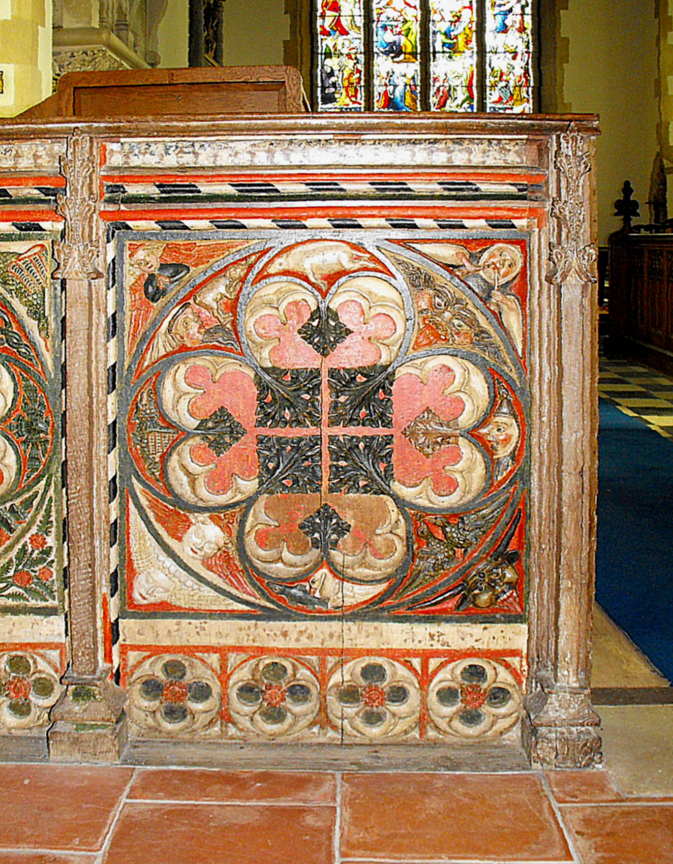 elaborately carved and painted panels each side of the central opening, featuring quatrefoils in circles, decorated with