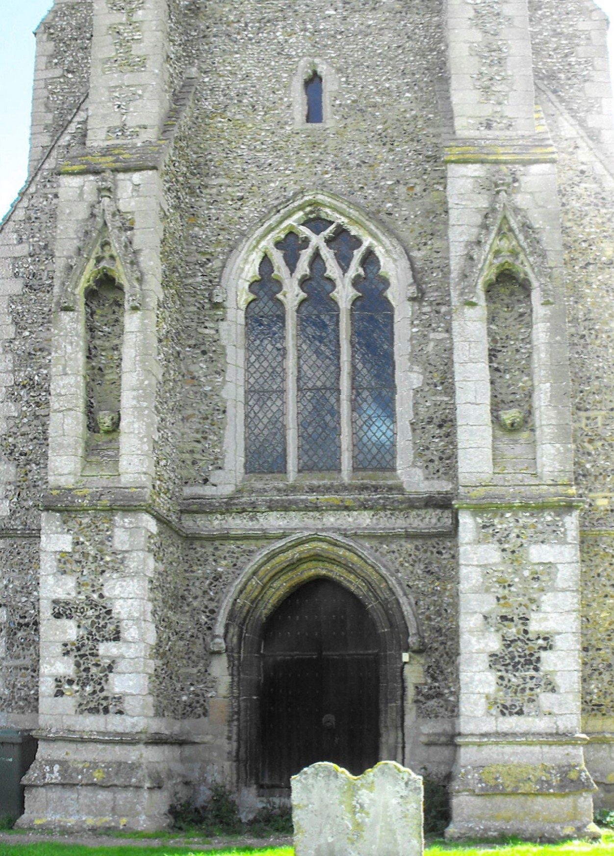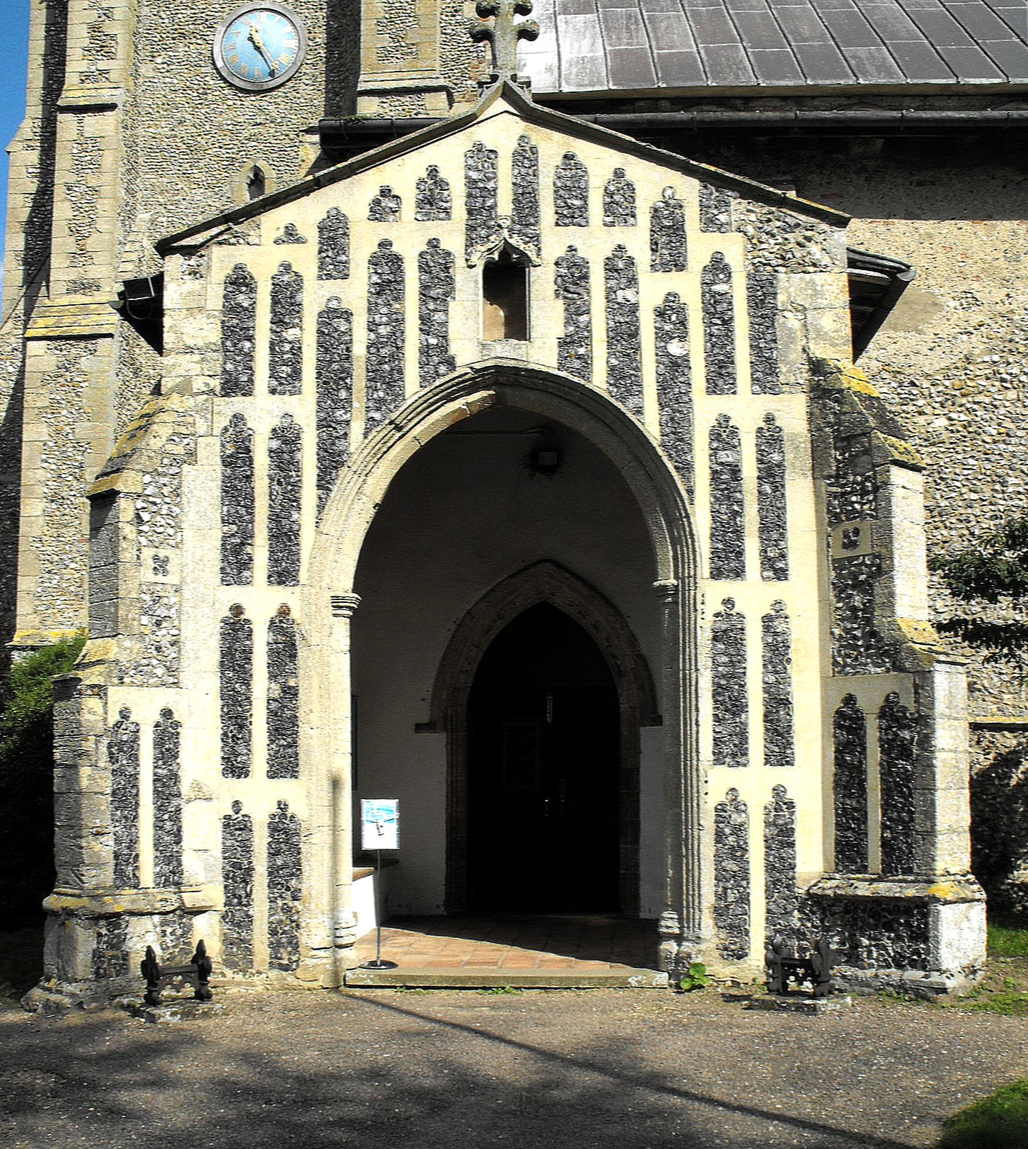 The S. porch, which according to Pevsner was reconstructed from the old materials in 1840 (The Buildings of England: Northwest and South Norfolk, New Haven & London, Yale University Press, 2002, p. 319) has side windows composed of two flattened trefoiled lights and just a modicum of tracery. The outer doorway carries a flat chamfer on the inner order, above semicircular shafts with octagonal capitals, and the outer order bears a little roll and a wave which continue uninterrupted all the way round. There is a small ogee-pointed trefoil-cusped niche above, but the principal decorative feature here is the flint flushwork covering buttresses and east and south walls (though not the west wall), comprising four tiers of trefoil-cusped blank arcading, which steps up over the doorway. (Seen the photograph above left.) Inside, the porch has a low-pitched couple roof and an inner doorway with a worn inner moulding that may once have represented a trail of vine leaves and which suggest this doorway was exposed to the elements for many years before the porch was added.