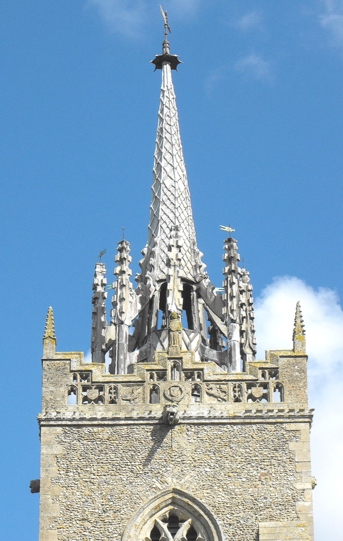 'The best church in its neighbourhood... with [a] picturesque, short C15 lead spire rising out of a crown of eight flying buttresses' (Pevsner).