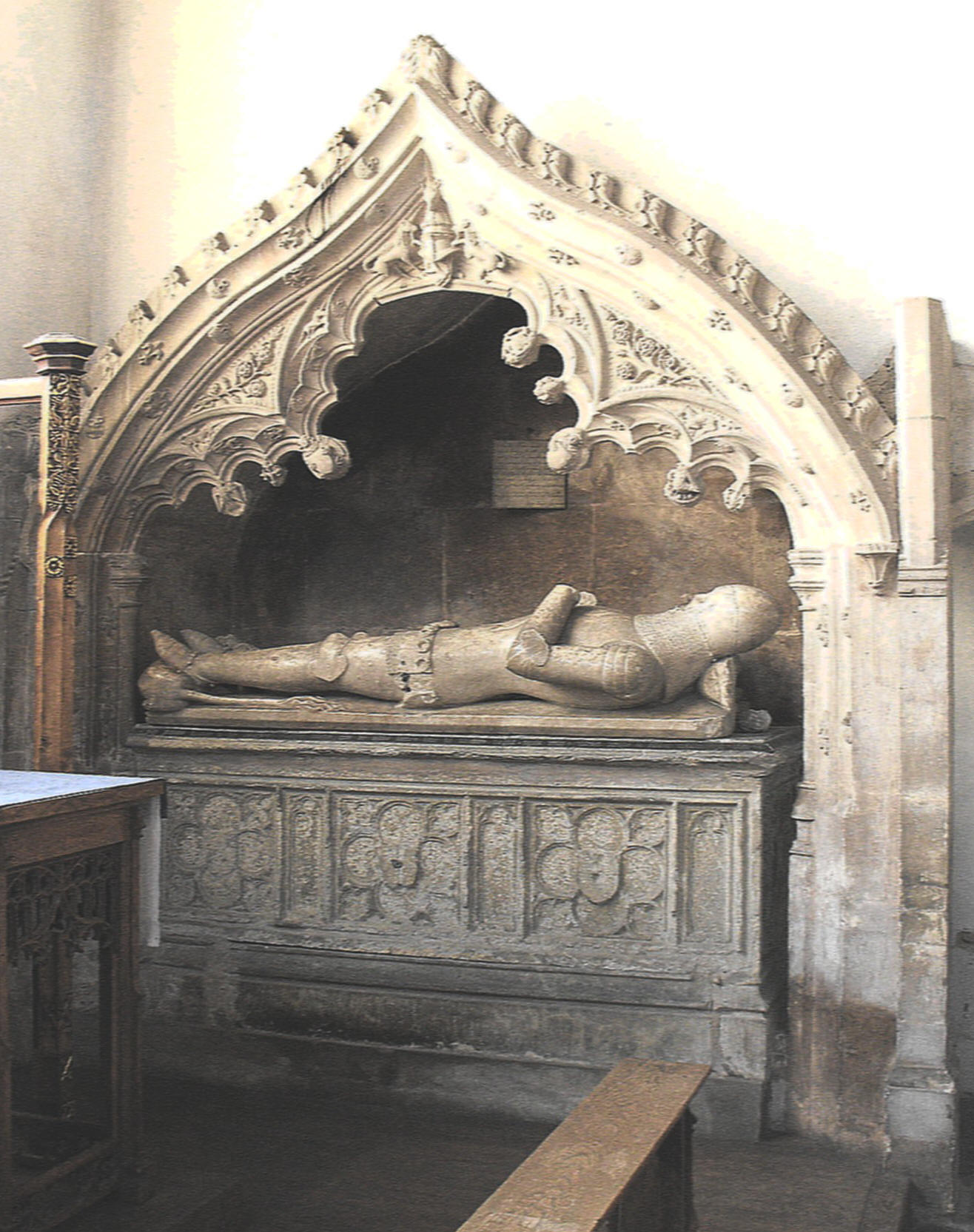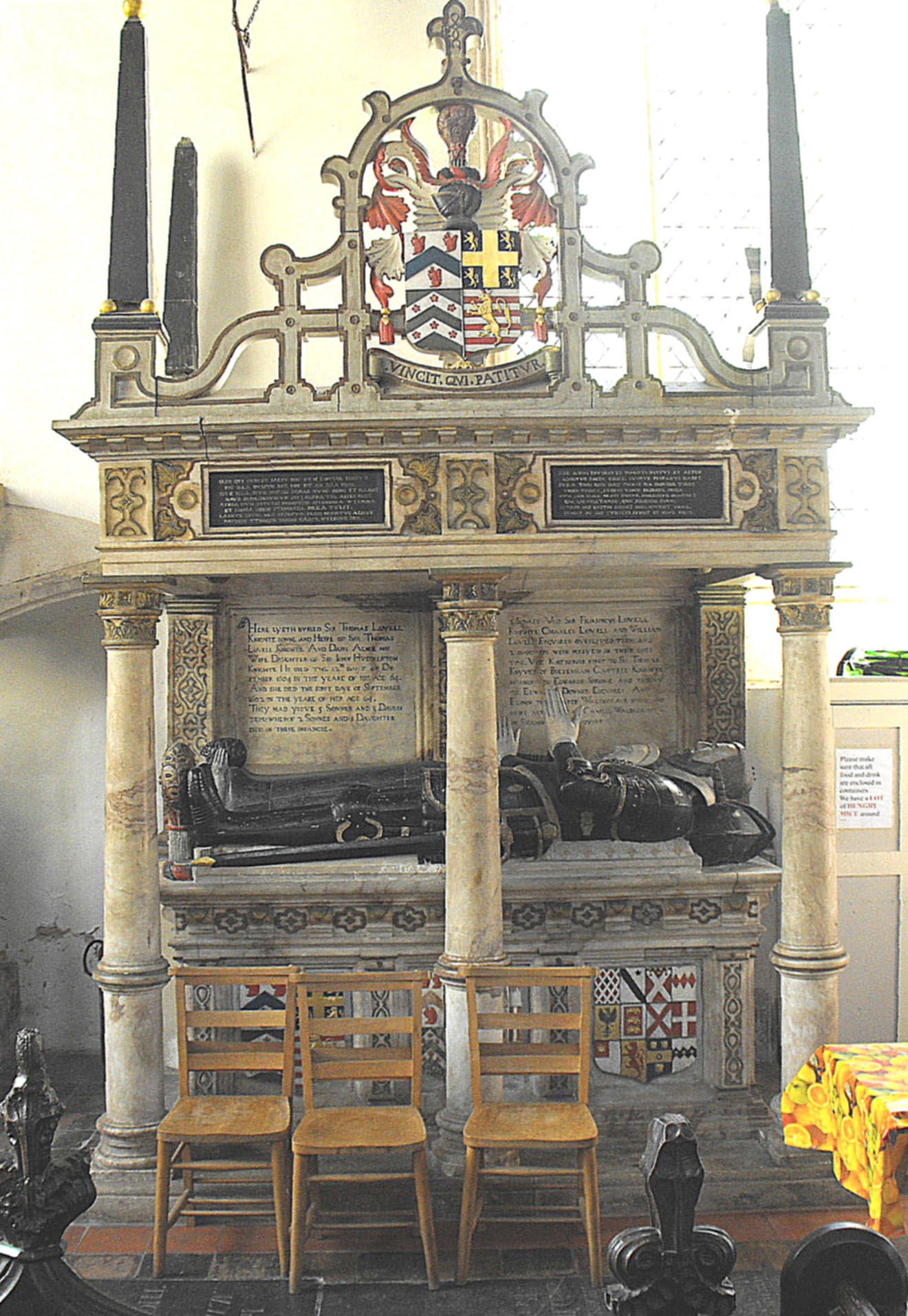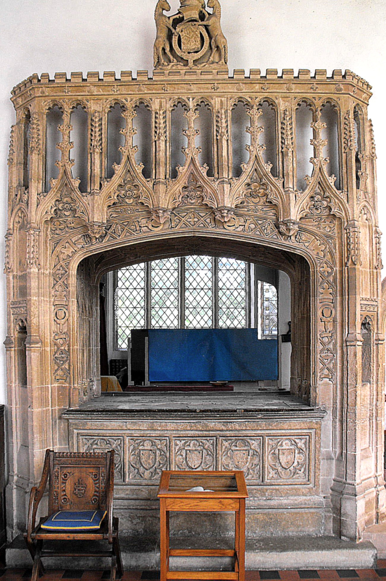 The church contains a series of large monuments, of which three tomb-chests will be described here, in date order. (i) The first, which is fifteenth century in date and found against the S. wall of the S. chapel sanctuary (i.e. at the easternmost end of the S. aisle), consists of a tomb-chest decorated with quatrefoils holding shields, alternating with blank trefoil-cusped arches, and a canopy above with a double-cusped, crocketed ogee arch. (See the photograph above right.) Two unicorns(?) hold another shield in the apex of the arch while the mouldings around, consisting of a wave and a hollow, are decorated at intervals with baskets(?) and more unicorns. The effigies of a knight and a lady lie on the tomb-chest, but only the former is considered original and believed to represent Sir Robert Herling (d. 1435), who lies straight-legged with his feet resting on a lion. (ii) The large monument between the chancel and N. chapel (shown below left), in brown stone, though so much more urbane, is actually not much younger in date. It commemorates Lady Anne Wingfield and her first husband, Sir William Chamberlain (d. 1462). Here, too, the tomb-chest features quatrefoils in circles in the panels but there all similarity ends. No effigy lies on the chest, which is open to the chapel beneath a very depressed arch, but above there is the most elaborate superstructure composed of double-cusped crocketed ogee arch-heads, rising from pendants and terminating in finials, and a taller, castellated openwork section behind, topped by an achievement and pierced by tall pairs of trefoil-cusped arches, while every available space below is covered in carving in gentle relief. The sides of the monument are bevelled to the southeast and southwest and decorated with cinquefoil-cusped niches set between crocketed buttresses. (iii) Finally, in contrast to both the above, the third tomb-chest, found against the S. chapel S. wall, west of Sir Robert Herling's tomb, is manifestly a seventeenth century composition. (See the photograph below right.) Here, the effigies of Sir Thomas Lovell (d. 1604 - Pevsner) and his wife, Dame Alice, their hands clasped in prayer, lie on a chest painted with shields, beneath a heavy canopy supported by non-standard alabaster columns, while above, a distinctly two-dimensional achievement framed by lattice-work is set between obelisks at the angles.
