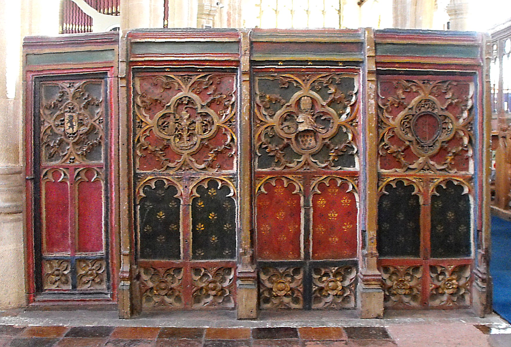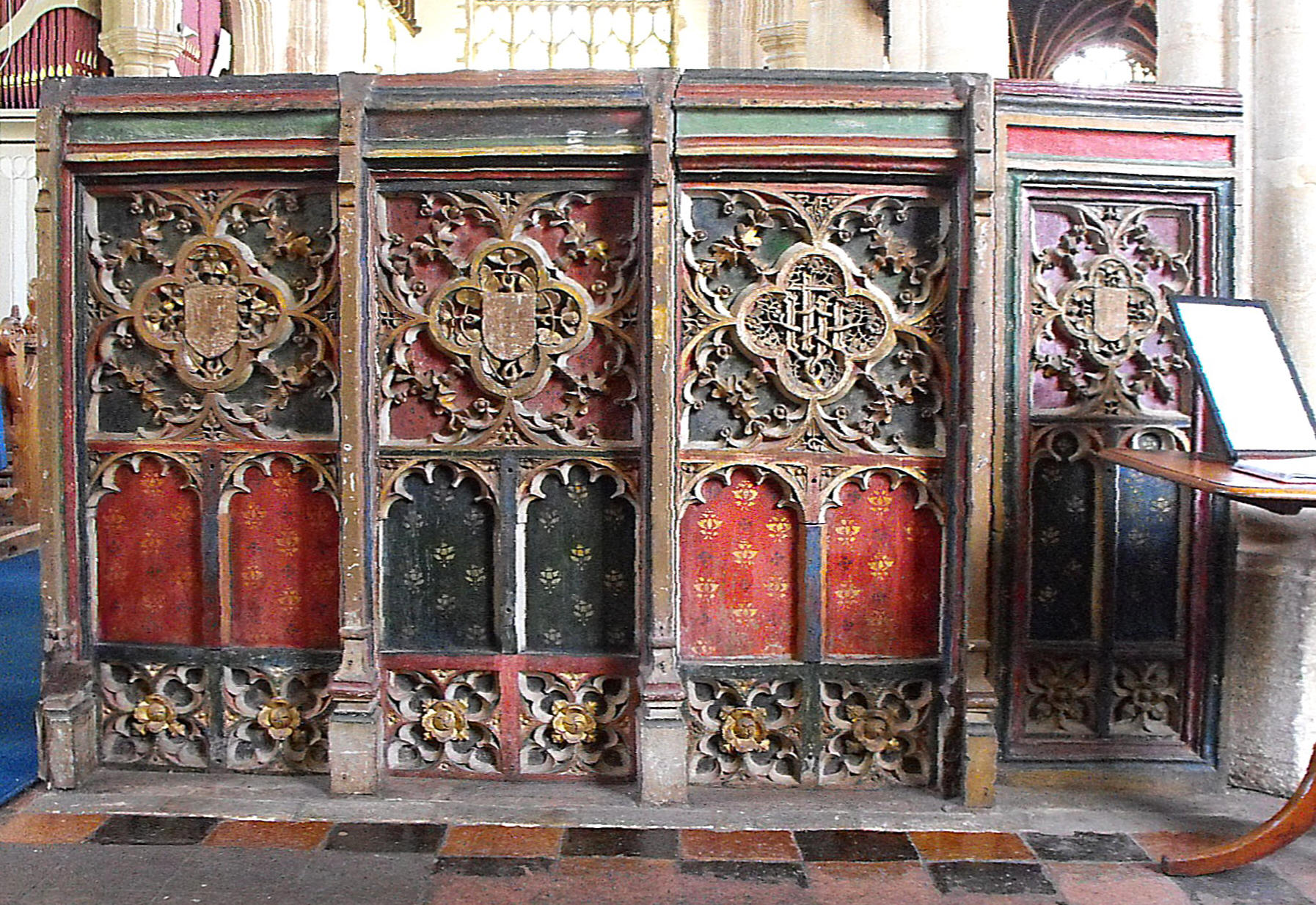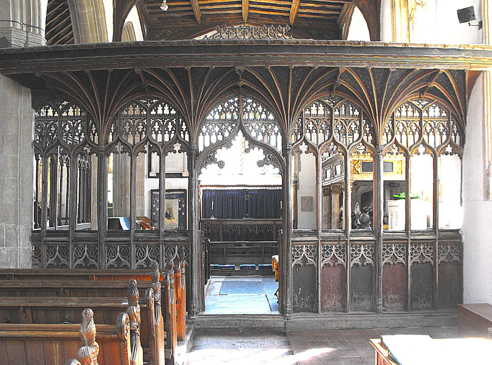 The parclose screen round the S. chapel, occupying the two eastern bays of the S. aisle, is formed of two sections of different dates, one each to the west and north. The former (seen below from the west) is an excellent piece of Perpendicular work with a fan vaulted loft, and alternate tracery with intricate subreticulation in two tiers, separated by castellated supertransoms. The dado features blank arcading in double-cusped ogee arches with encircled cruciform lobing set vertically in the spandrels. The screen to the north, across the second arcade arch from the east (the easternmost arch being open) is simpler and earlier, consists of three sections separated by turned columns.