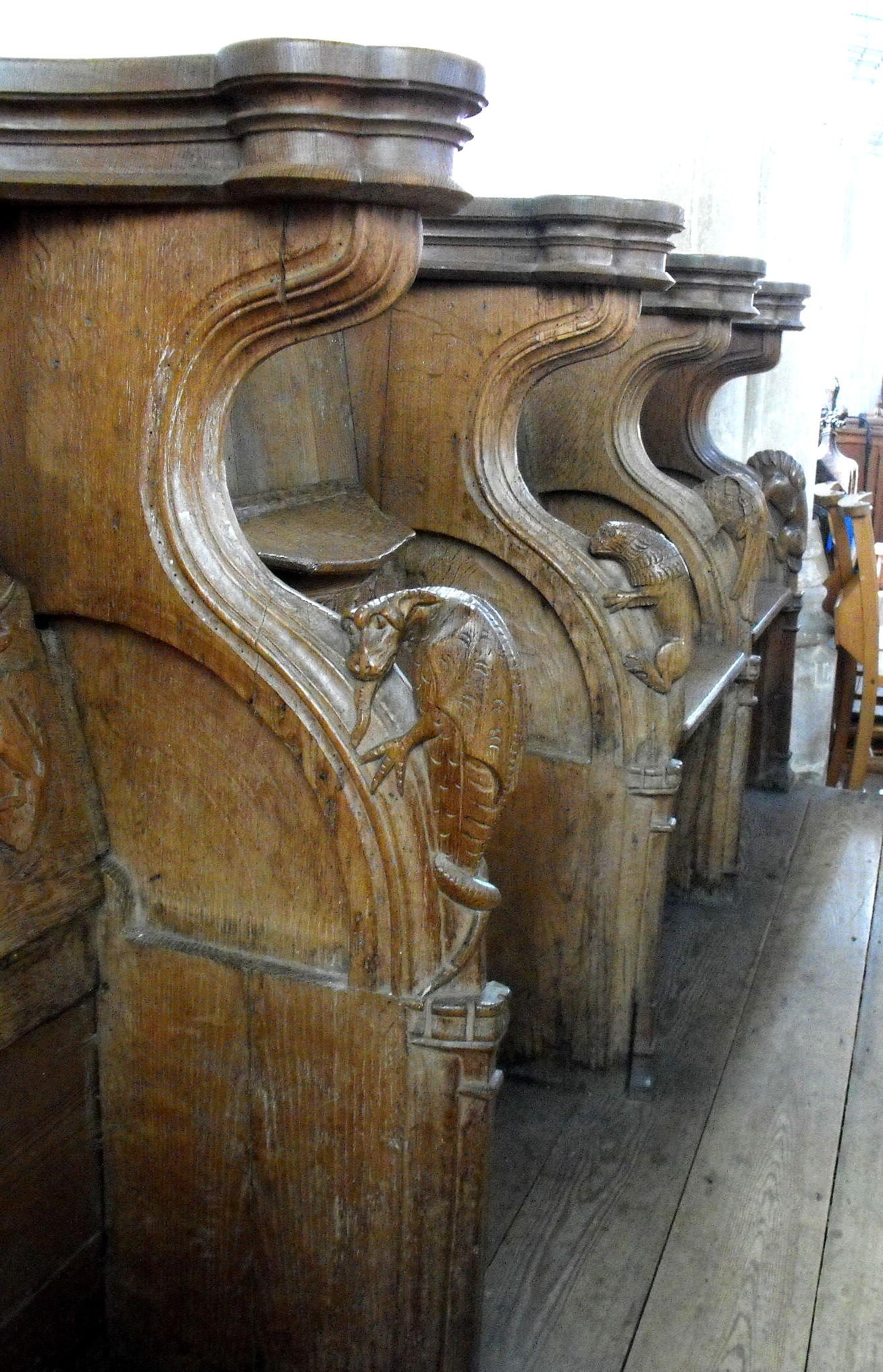 The chancel contains six misericords, two to the north and four to the south, with carvings underneath and on the arm rests. These include a lion, an eagle, a Pelican in her Piety (regarded in the Middle Ages as an image of self-sacrifice since it was believed that the pelican fed her chicks from blood drawn from her own breast), a green man(?), and a couple of dragons or lizards. (The photograph below left, taken from the east, shows the misericords to the south.)