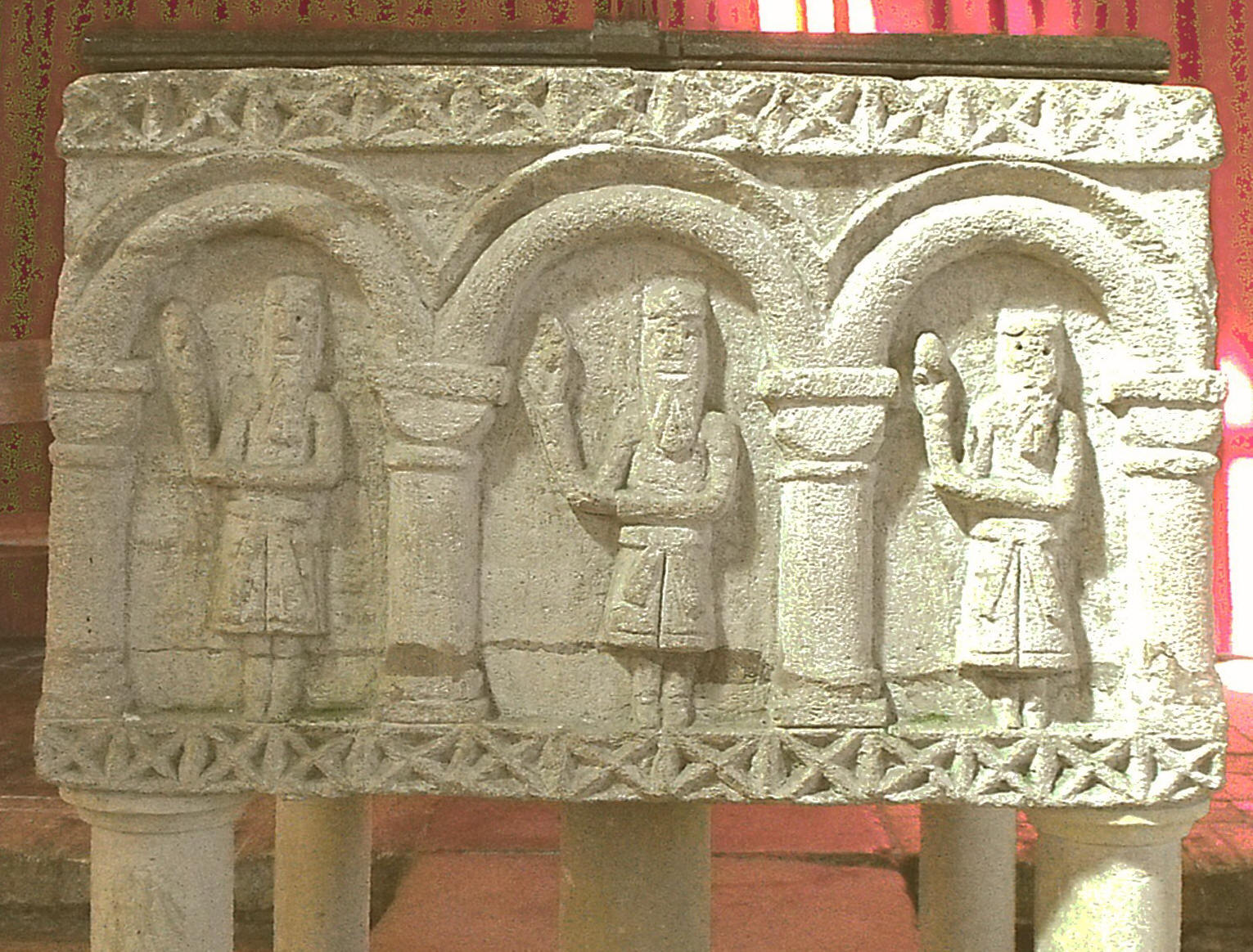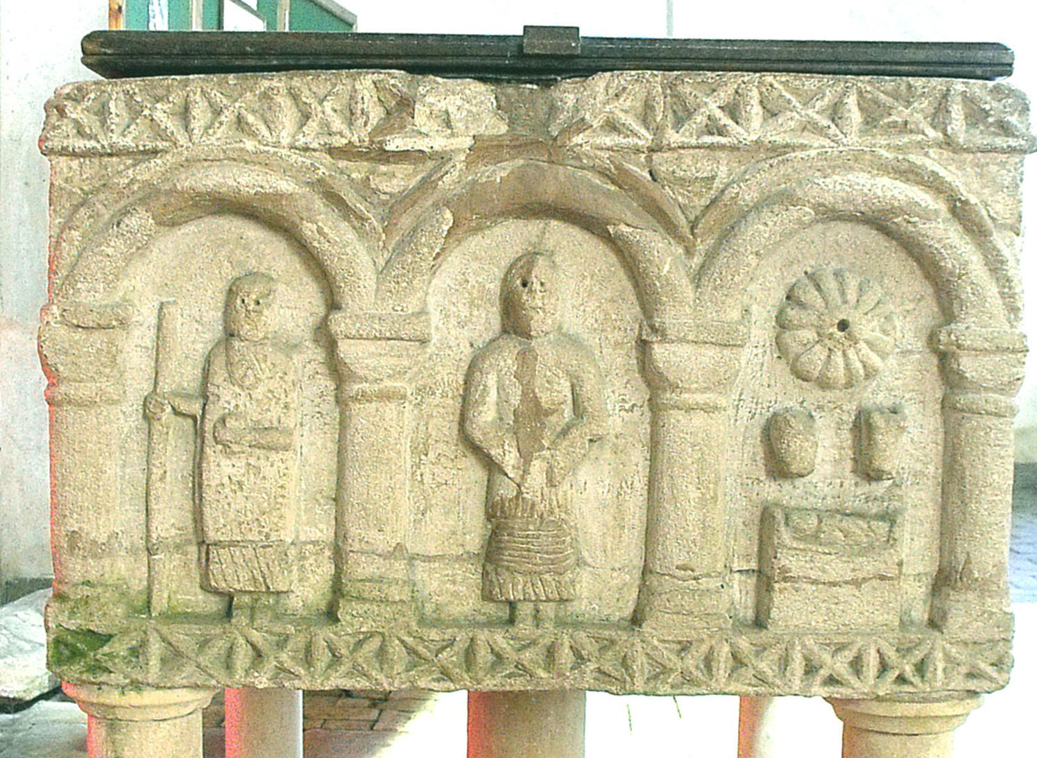 Finally it remains to describe the one mediaeval feature in the church that is not of fifteenth century date, and this a very significant one, namely the excellent Norman font, formed a large square bowl supported on five circular shafts. Decorated in bas-relief on each of its four sides with a group of figures set beneath three round arches separated by circular columns with cushion capitals, and laid out between lines of saltires at top and base, the faces of the bowl portray: (i) E. face (shown above left), the three Magi, bearing gifts; (ii) S. face (above right), Mary and Joseph, and the Baby in the manger; (iii) W. face, the Baptism of Christ; and (iv) N. face, Adam and Eve separated by the (badly restored) Tree of Knowledge. According to Pevsner (Nikolaus Pevsner & Bill Wilson, The Buildings of England: Northwest and South Norfolk, New Haven & London, Yale University Press, 2002, p. 337), the font was brought here from the former church of St. Michael when that was demolished in 1744.