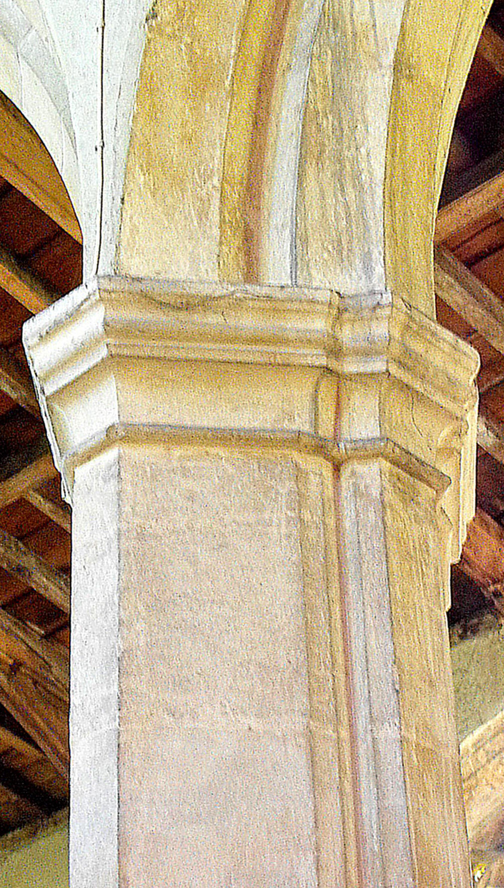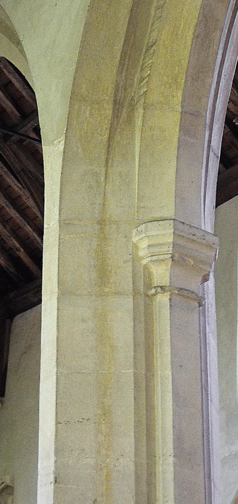Inside the church, the obvious inconsistency in the design lies between the double-flat-chamfered aisle arcades, where, with typical mediaeval insouciance, the N. arcade is supported on piers with shallow semi-octagonal shafts with capitals towards the openings and an outer chamfer continuing uninterrupted down the piers towards the aisle and nave (as illustrated in the photograph, far right), and the S. arcade springs from piers with similar shallow semi-octagonal shafts towards the openings but with deeper semi-octagonal shafts of irregular section, facing north and south (as seen, near right). They probably represent the work of different masons, possibly separated by a short time gap. The four-centred chancel arch rises from responds with shallow attached semi-octagonal shafts with castellated capitals. The tower arch is exceptionally tall and wide and has a complex series of mouldings, symmetrical to the east and west, supported on responds with three semicircular shafts.