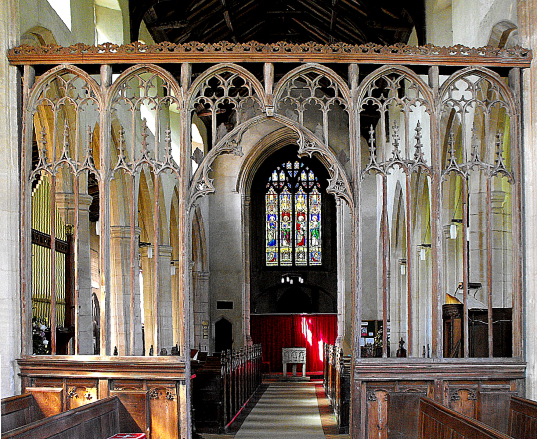 Original carpentry in the church includes the hammerbeam nave roof and the chancel screen (shown above, from the east). Alternate hammerbeams (only) to the former are supported by arched braces rising from wall posts; the attached periwigged(?) figures may represent a late seventeenth or eighteenth century attempt to make good the depravations of the sixteenth century orearly seventeenth century iconoclasts. The aisle roofs differ slightly in that the S. aisle roof is supported by arched braces whereas the N. aisle roof is not. The rood screen has two, three-light sections each side of the central opening and attractive tracery featuring a lower tier of archlets topped by crocketed pinnacles and pairs of trilobes resting on the upper tier.