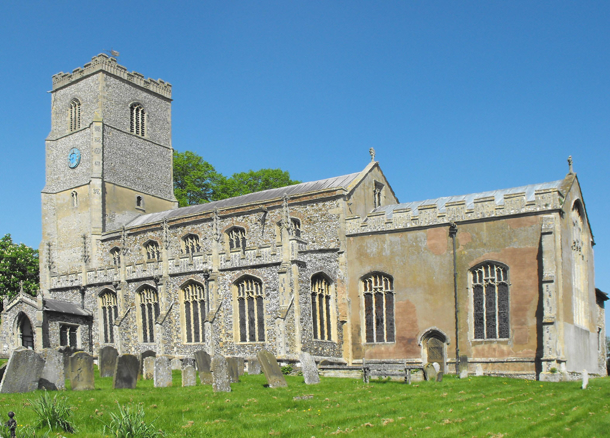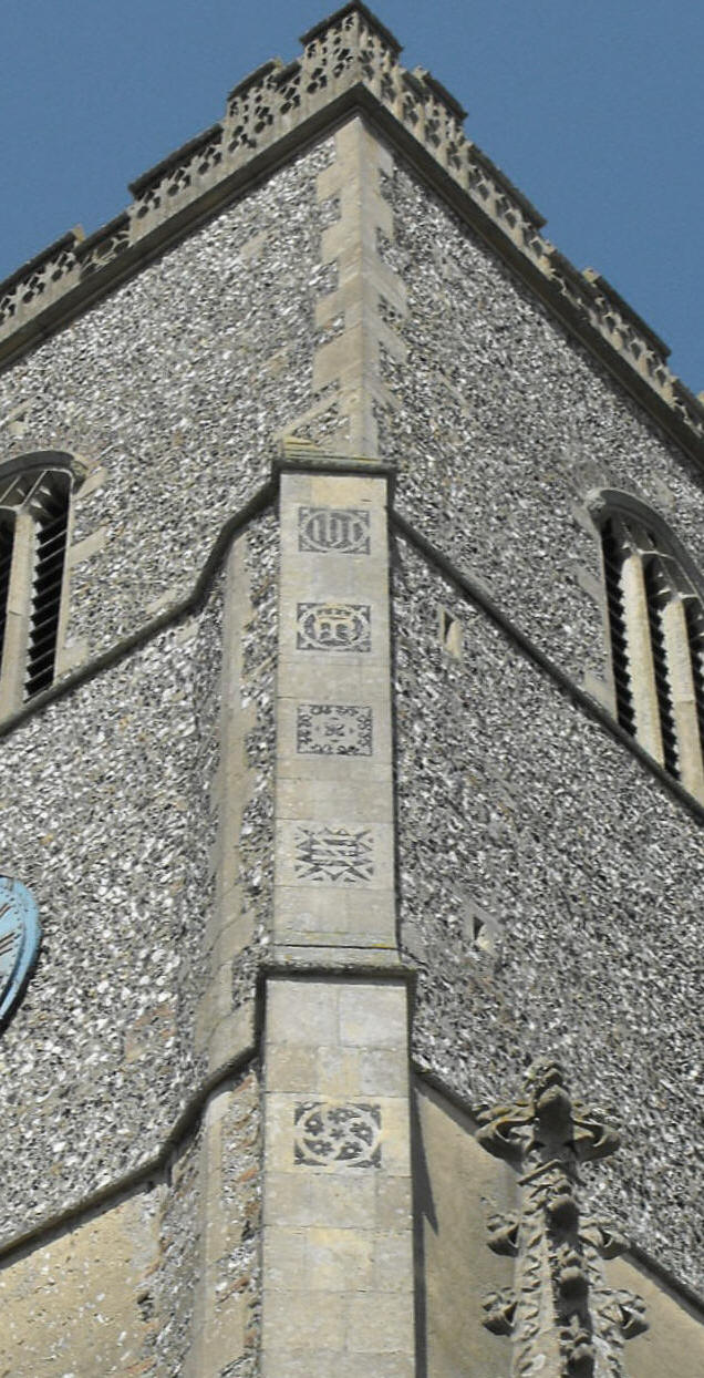 One of a number of Perpendicular churches, mostly in Suffolk and south Norfolk, where the tower buttresses are decorated with flint flushwork devices.